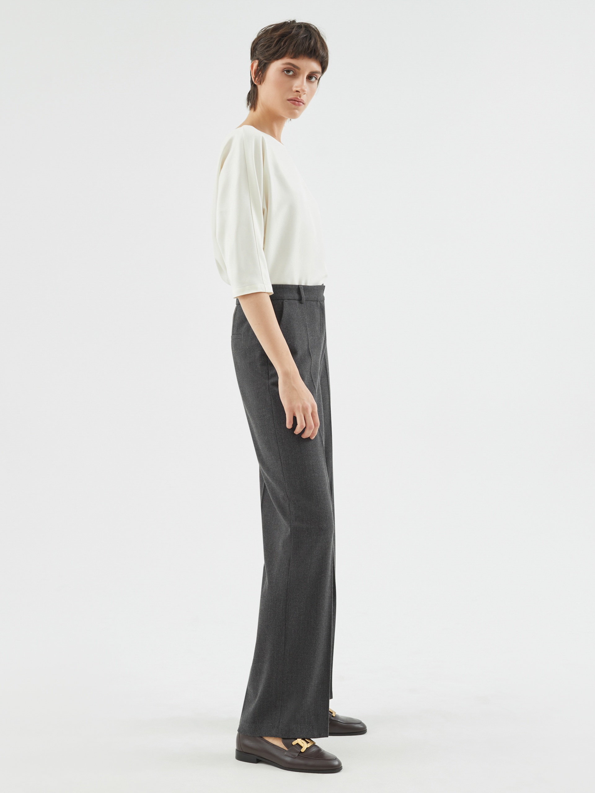 Стильные широкие брюки прямого струящегося силуэта из мягкой ткани в цвете "графит", со стрелками, на притачном поясе с резинкой и шлевками. Застежка спереди на молнию и крючок. Карманы рабочие в боковых швах.