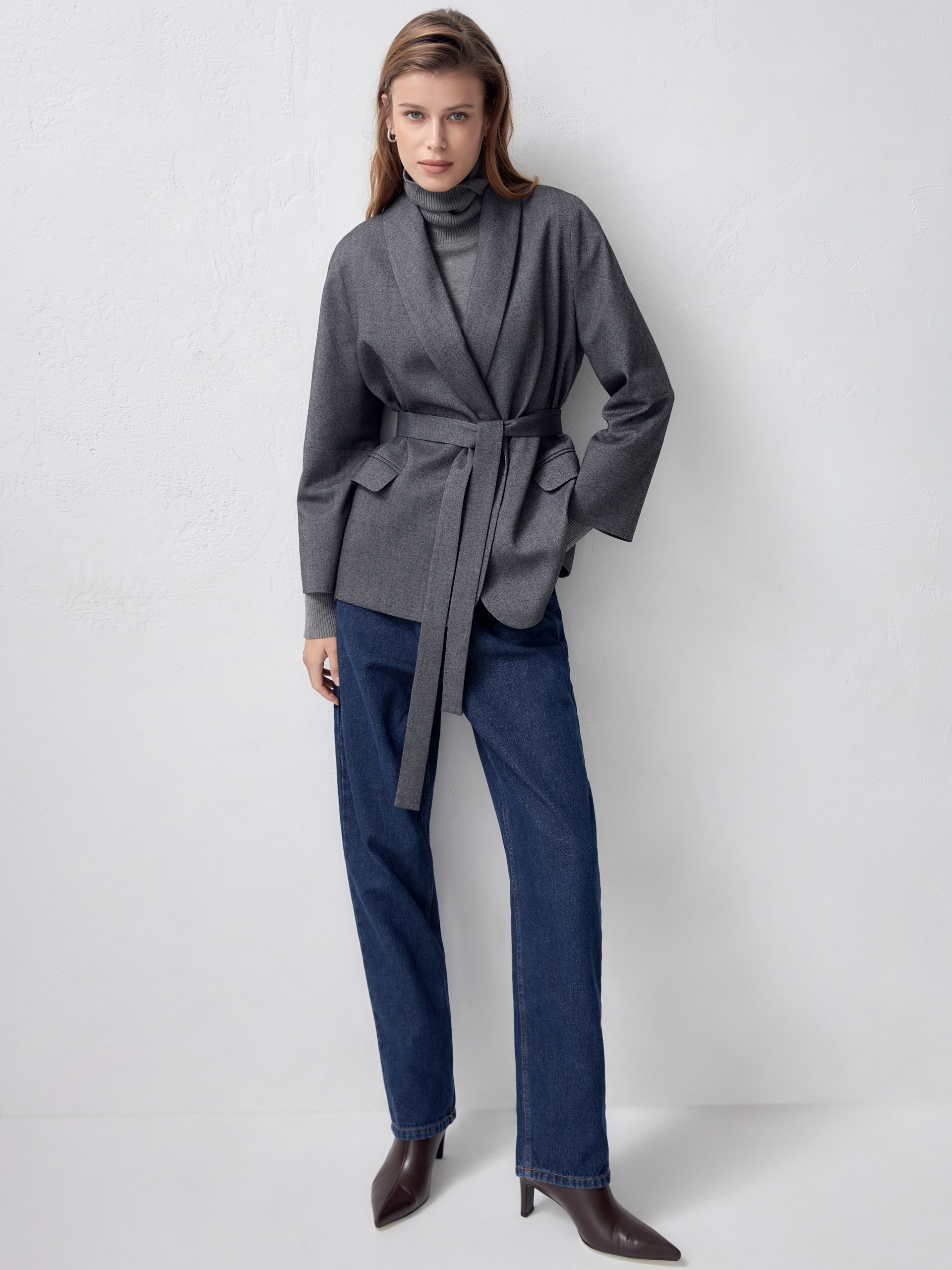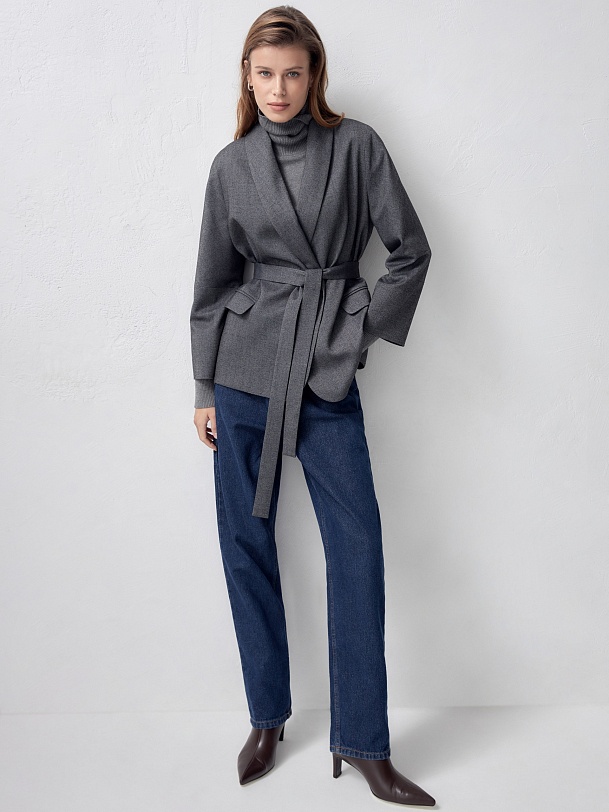 Свободный однобортный жакет прямого силуэта на подкладке из костюмной ткани с V-образным вырезом горловины, воротником-шалька, спущенным плечом и укороченным рукавом. Спереди застежка на одну пуговицу и прорезные карманы с клапанами. В комплект входит пояс из основной ткани.