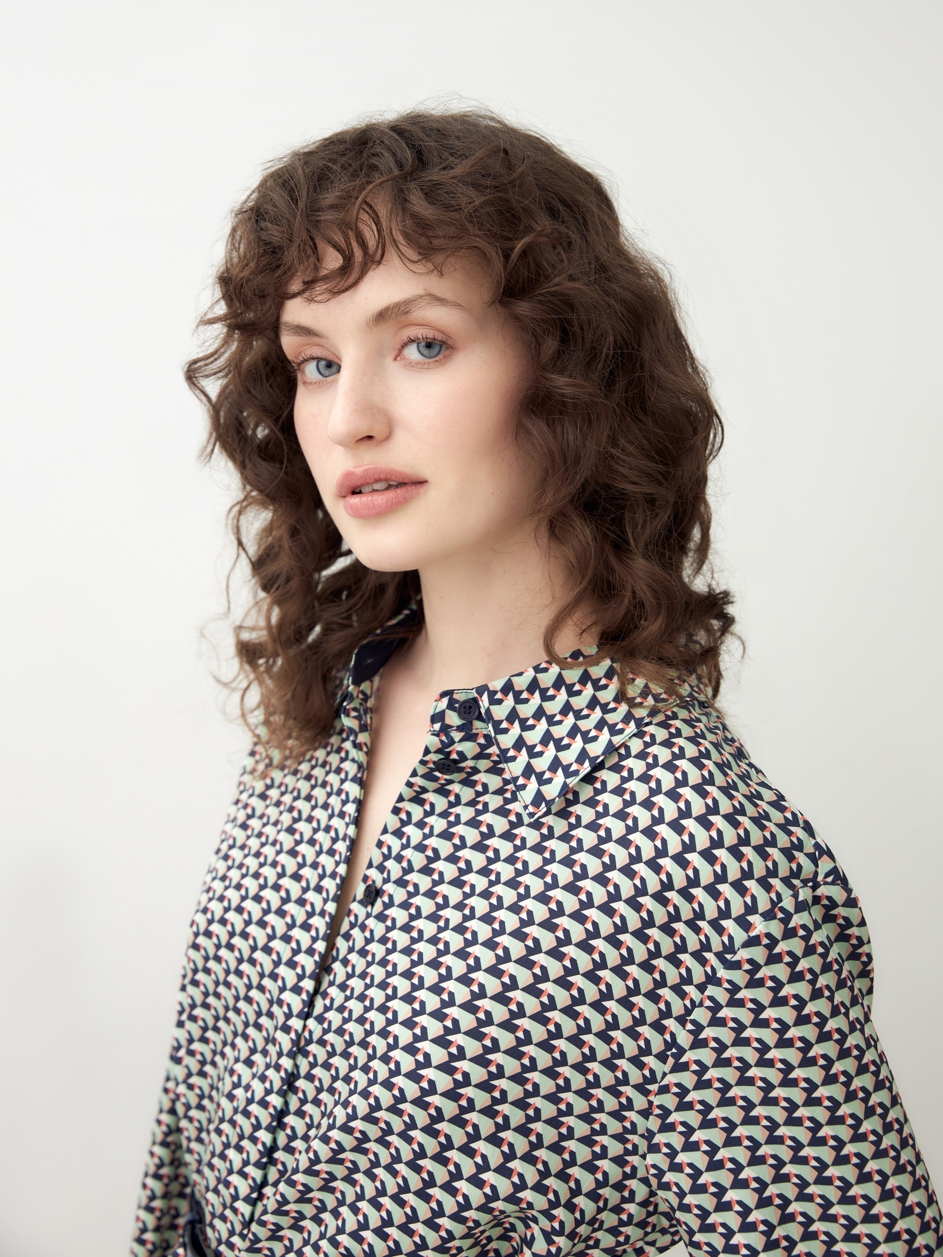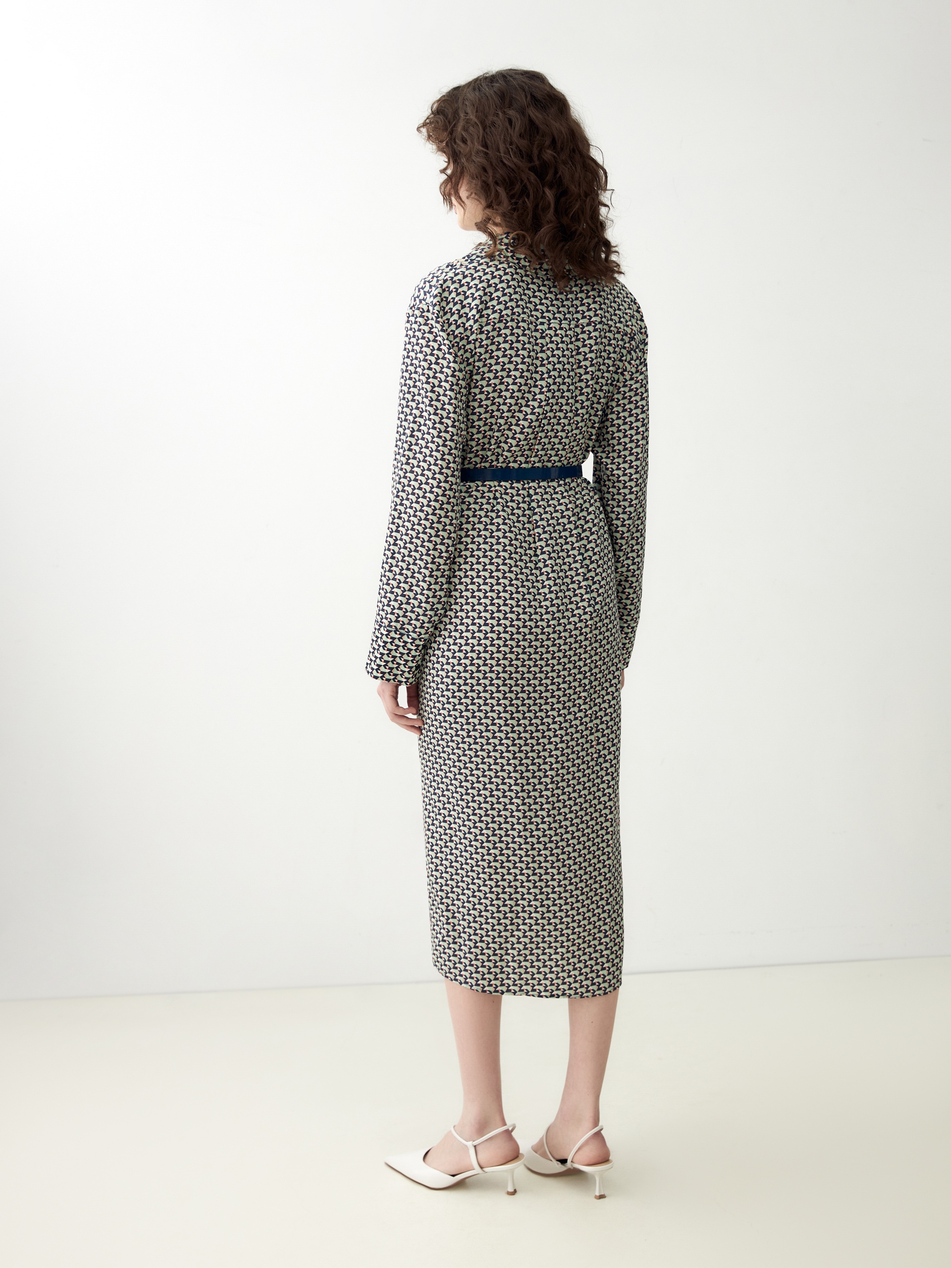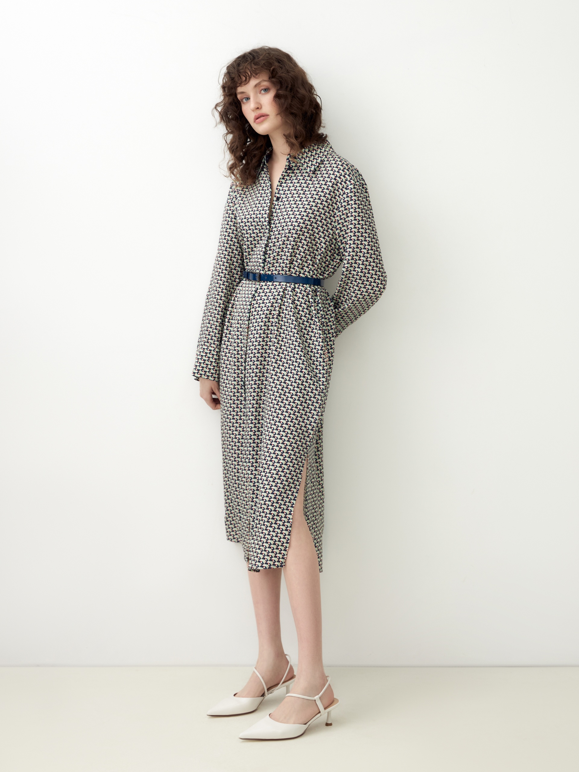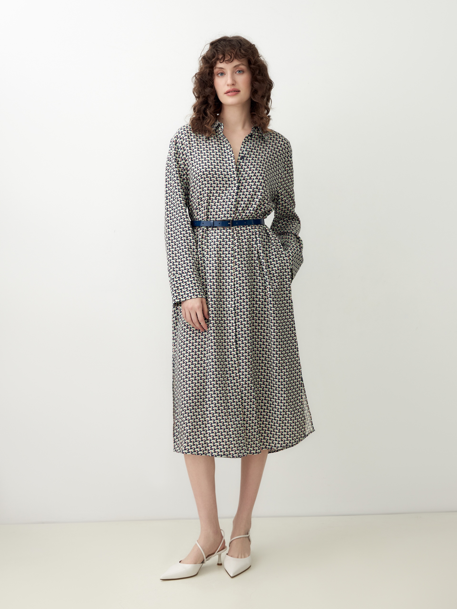 Платье-рубашка из 100% вискозы в "галстучном" принте прямого, свободного силуэта длины до колена с классическим отложным воротником и втачным рукавом полной длины на манжете. Застежка спереди потайная на пуговицы. В комплект входит ремень темно-синего цвета для создания более приталенного силуэта.