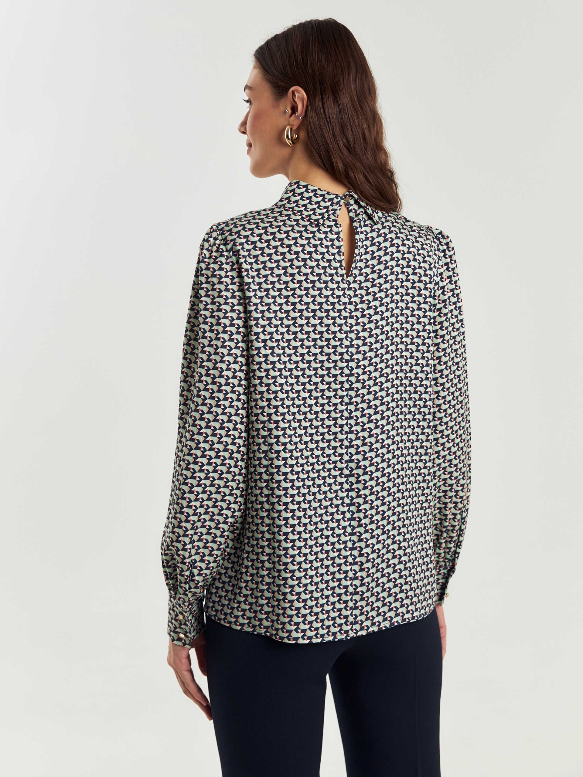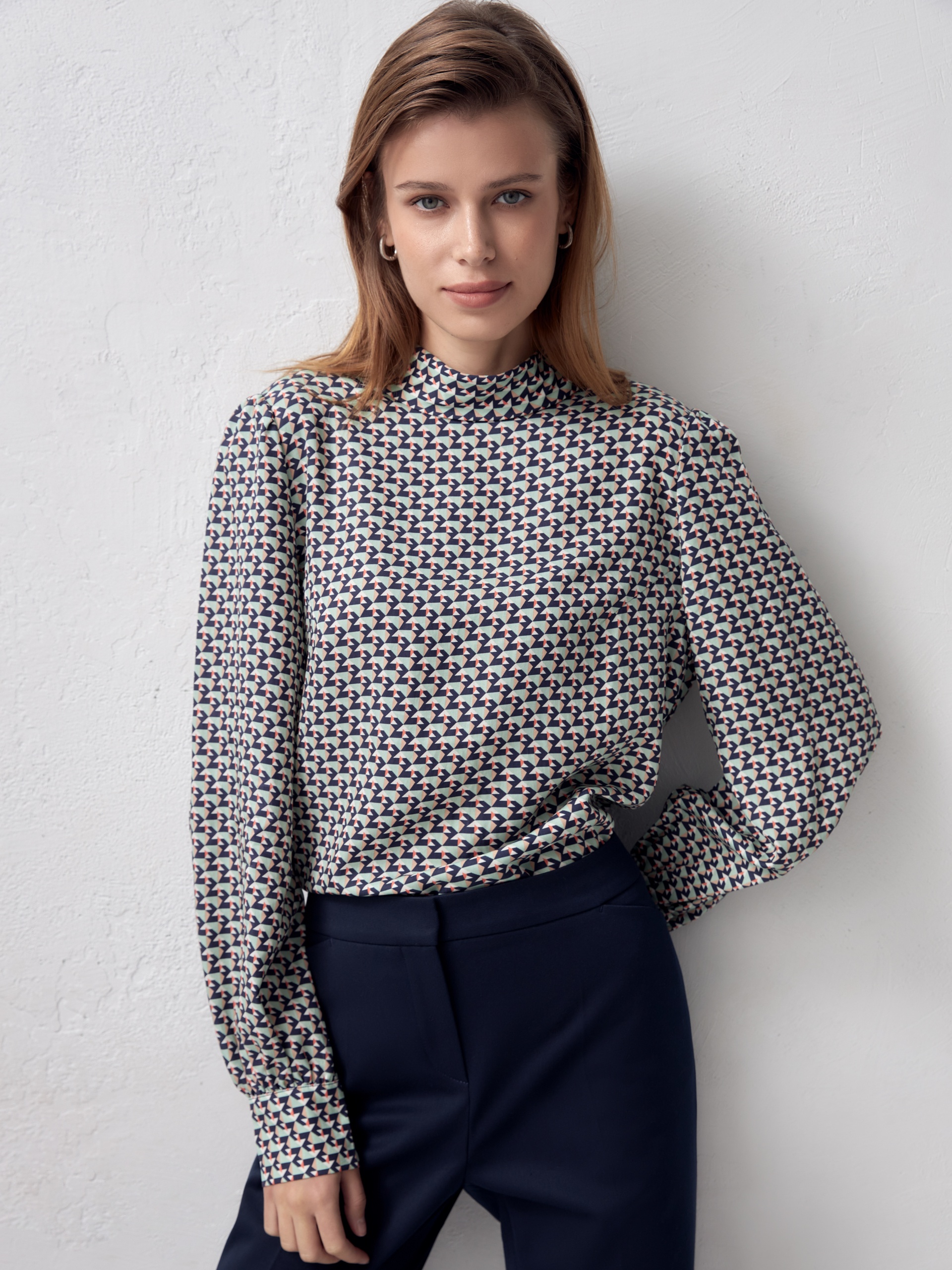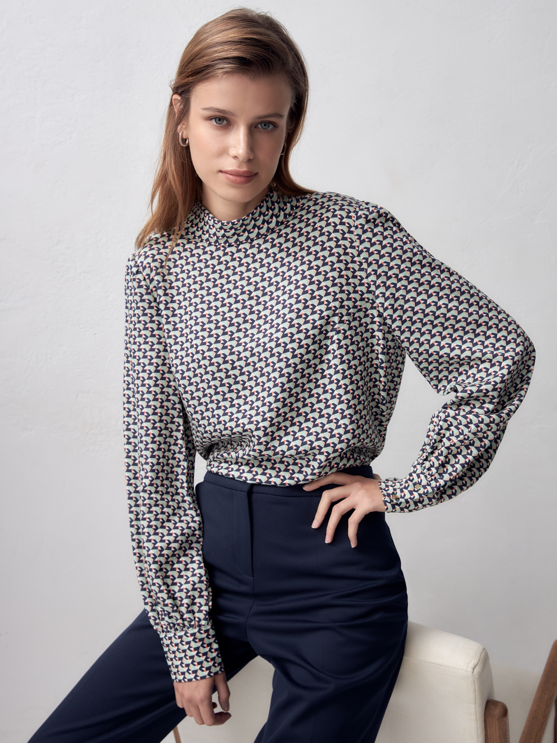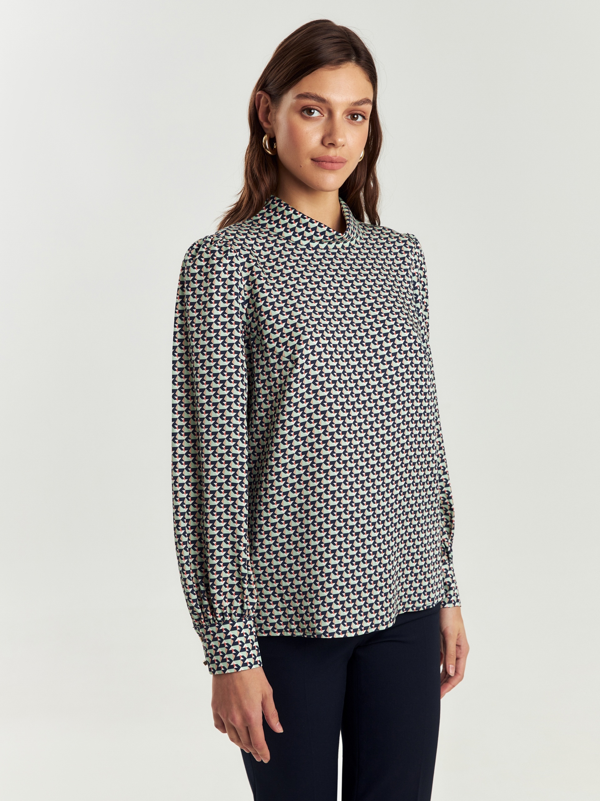 Прямая блуза из плательной ткани с высоким воротником-стойкой и пуговицей на спинке. Блуза выполнена из 100% тенселя. Спущенный рукав со сборкой на манжете с акцентными пуговицами. По бокам небольшие разрезы.