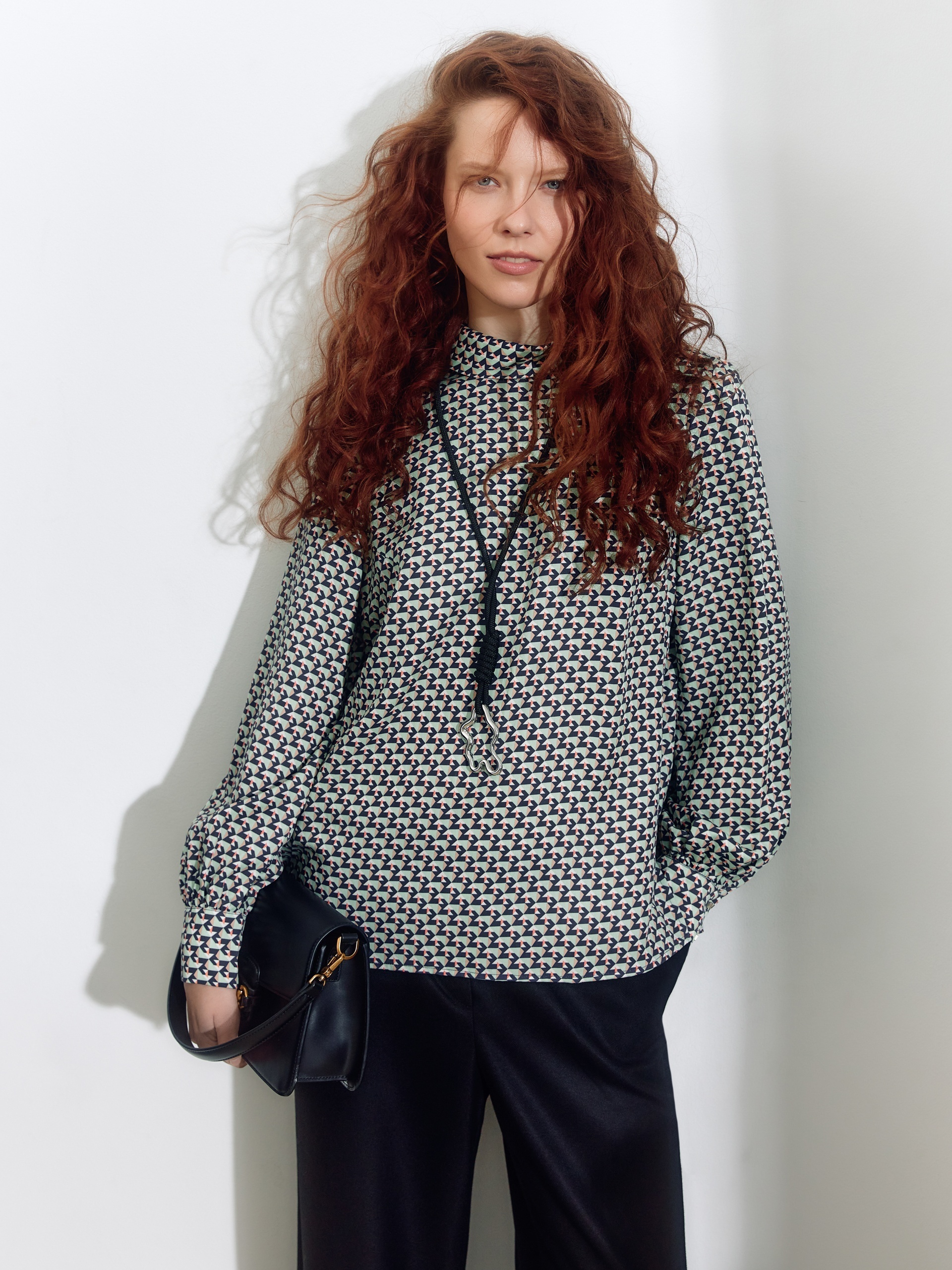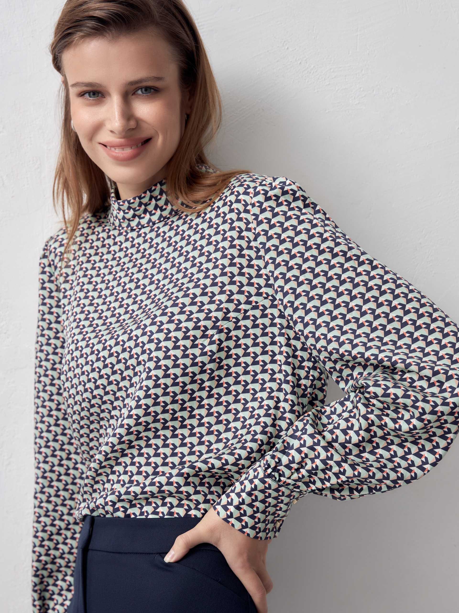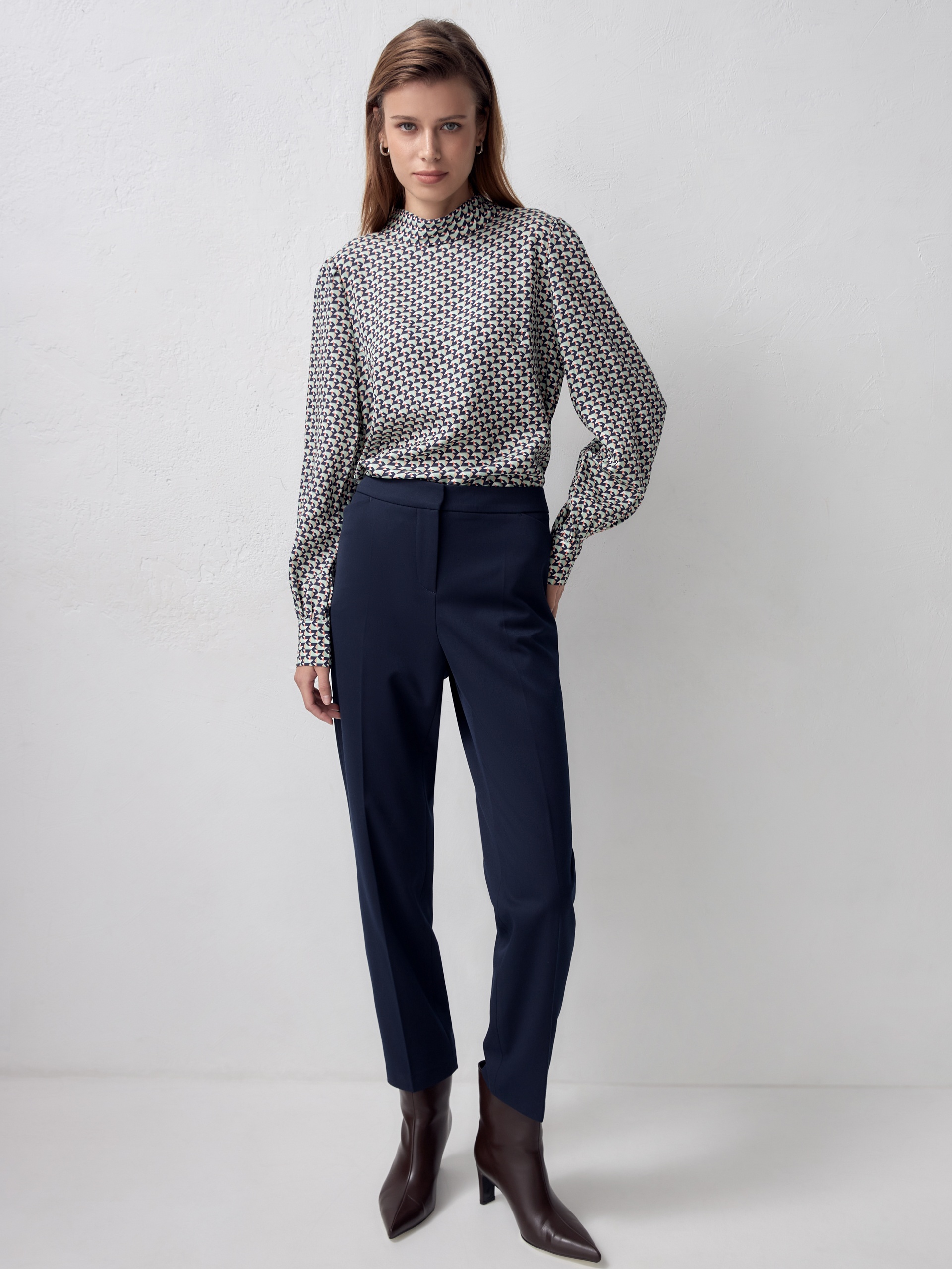 Прямая блуза из плательной ткани с высоким воротником-стойкой и пуговицей на спинке. Блуза выполнена из 100% тенселя. Спущенный рукав со сборкой на манжете с акцентными пуговицами. По бокам небольшие разрезы.