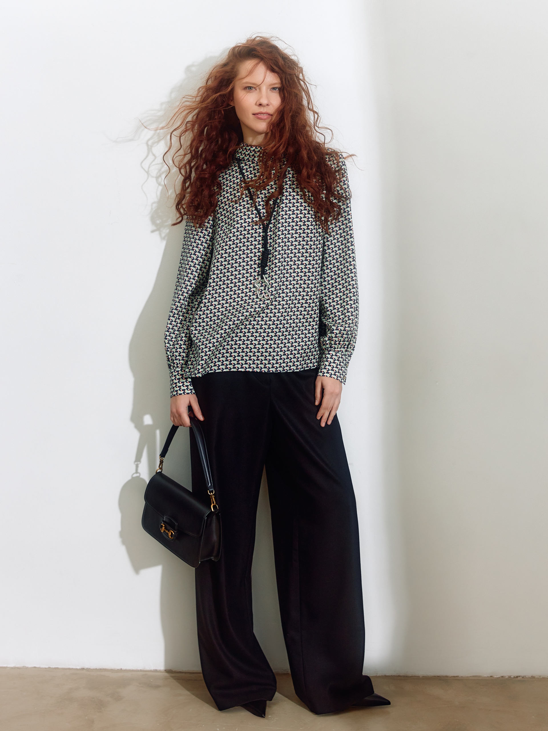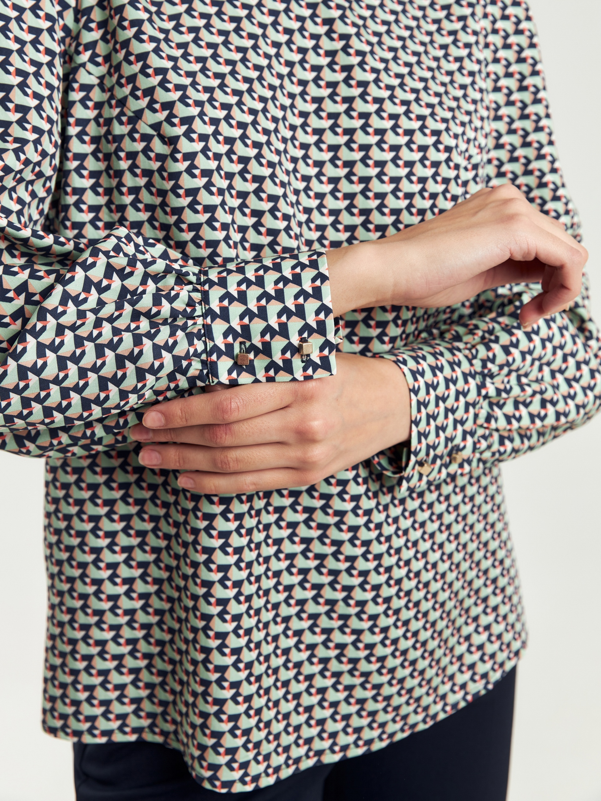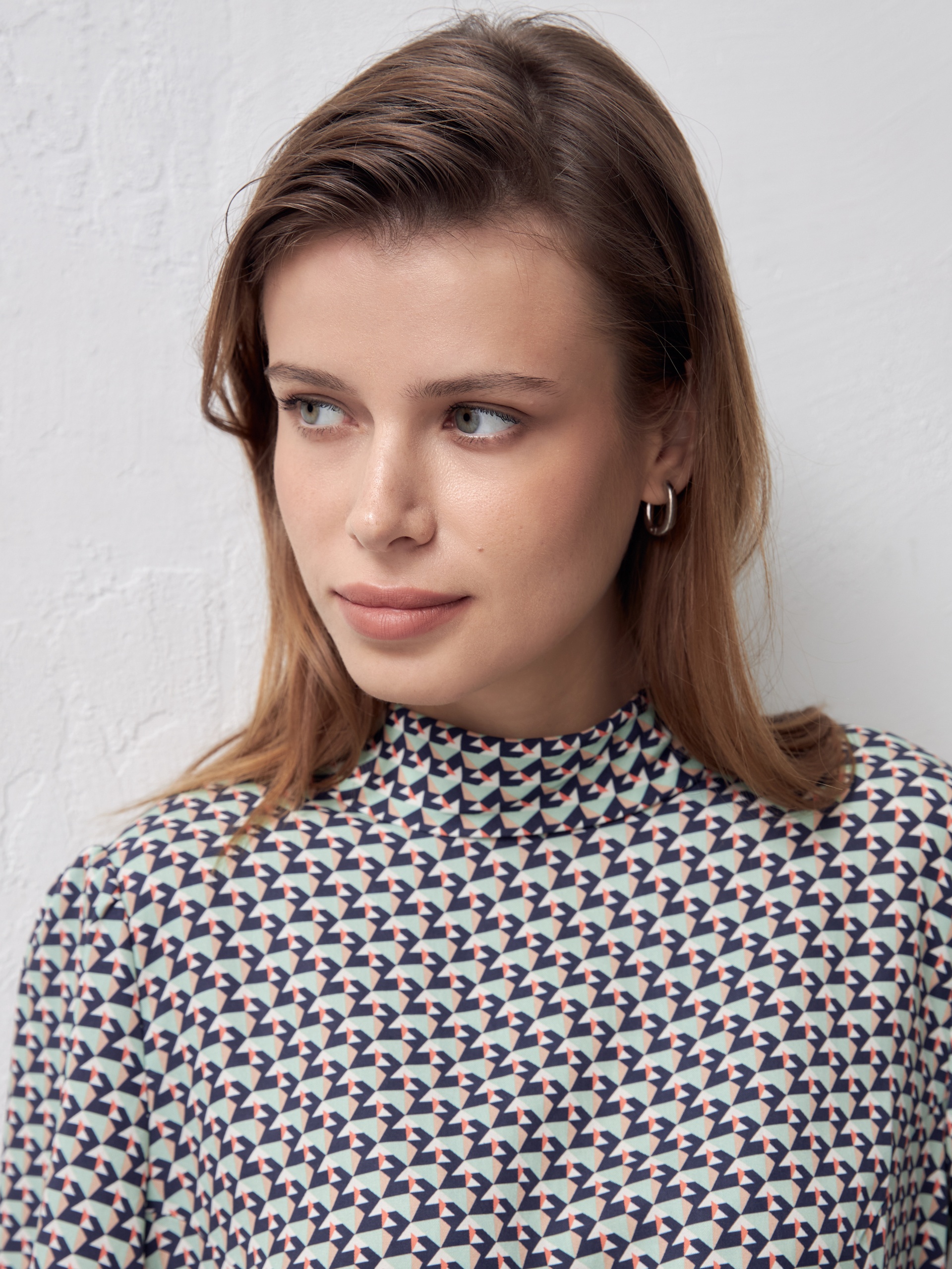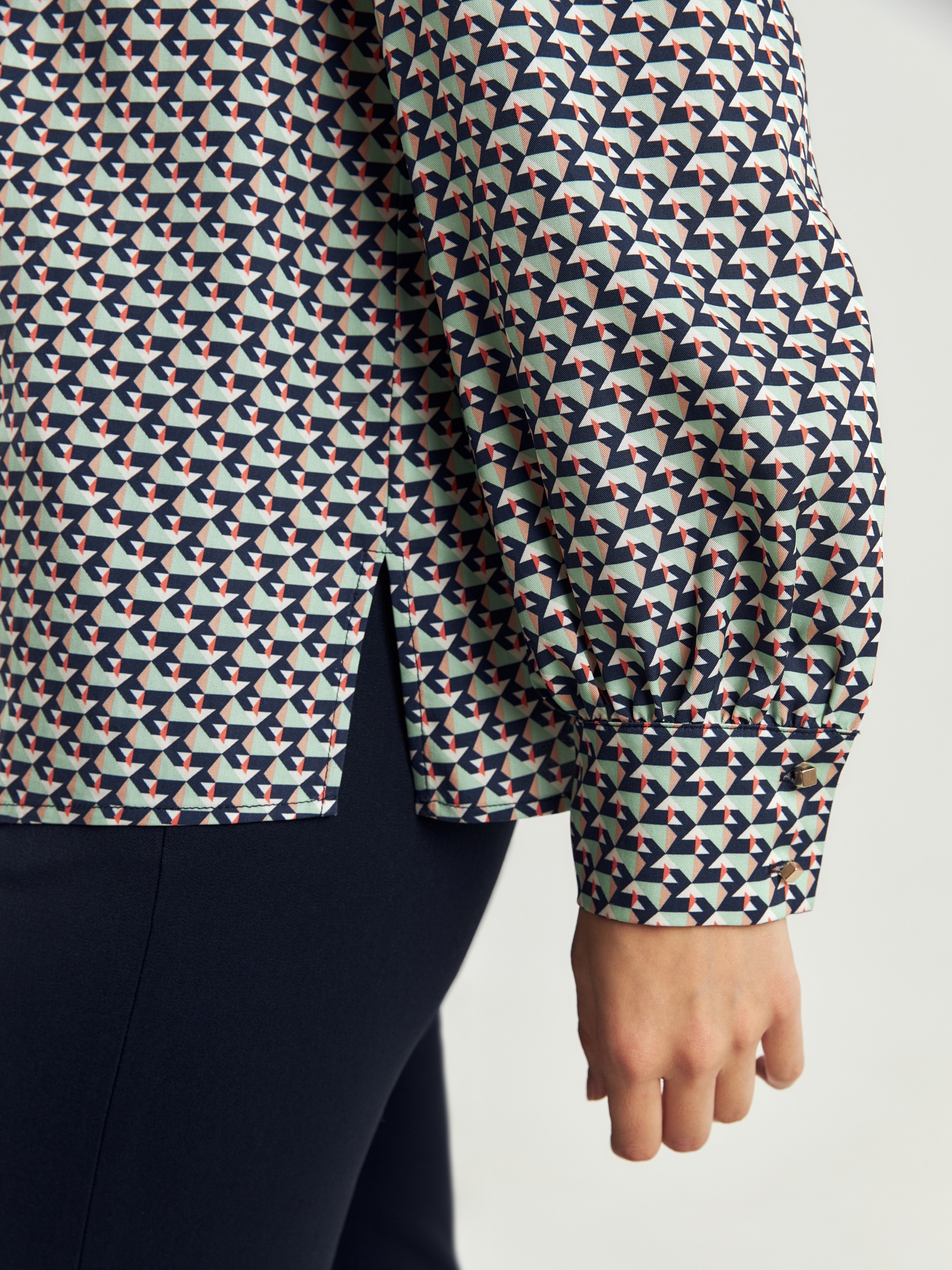 Прямая блуза из плательной ткани с высоким воротником-стойкой и пуговицей на спинке. Блуза выполнена из 100% тенселя. Спущенный рукав со сборкой на манжете с акцентными пуговицами. По бокам небольшие разрезы.