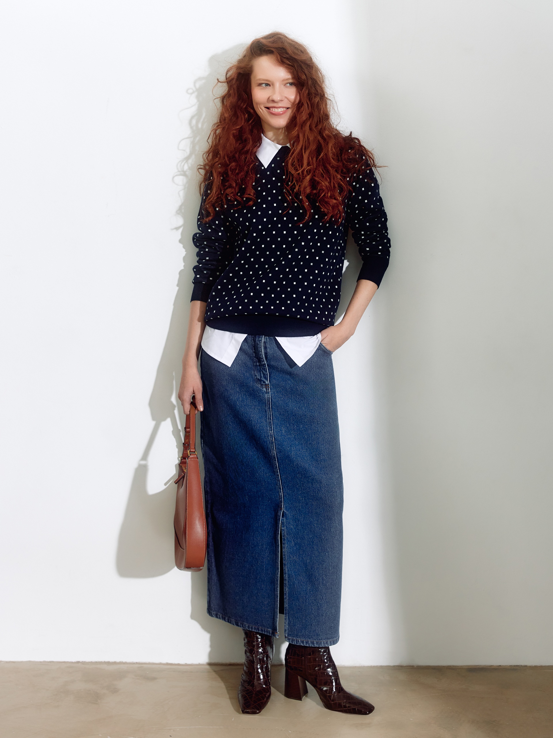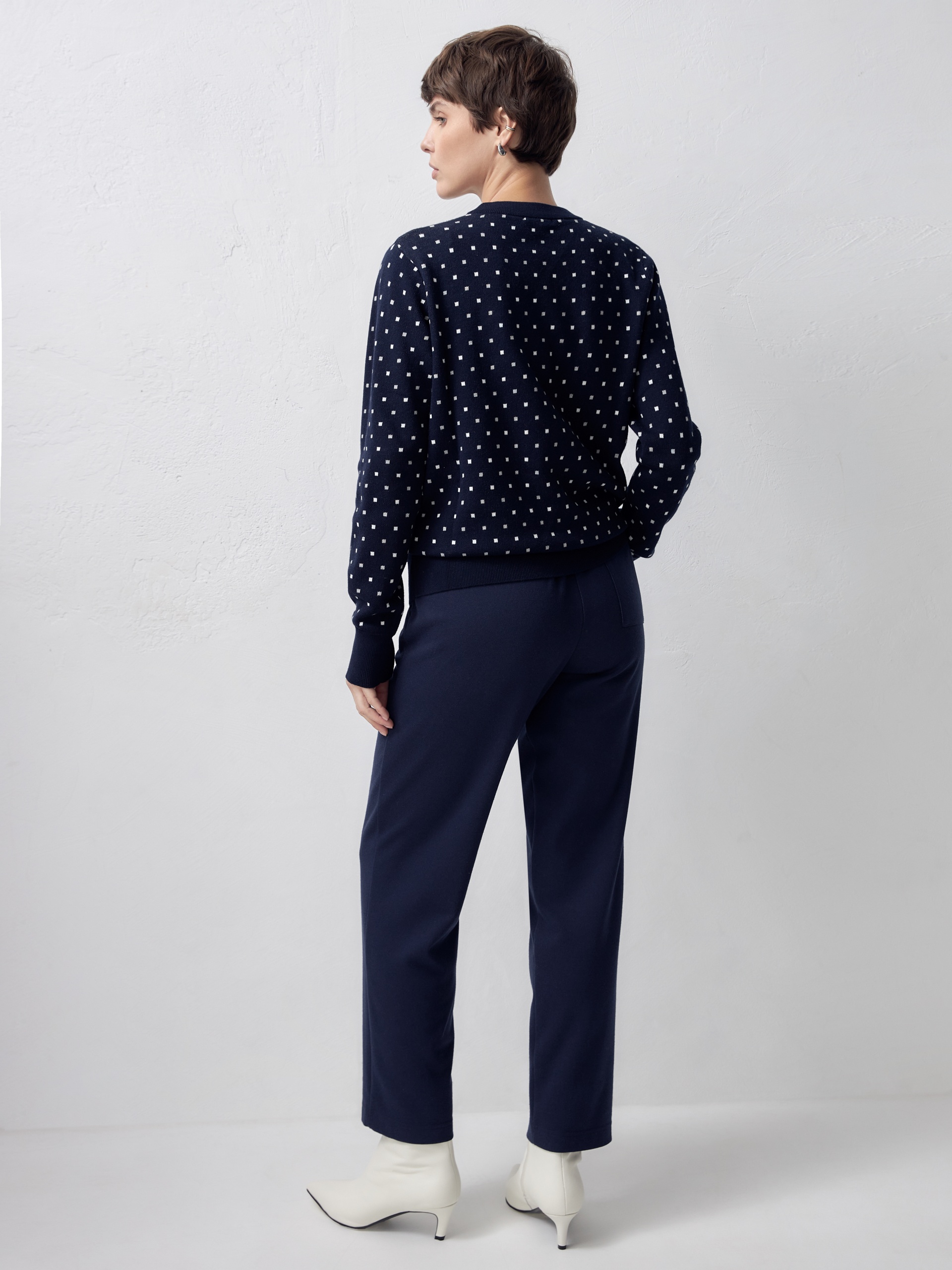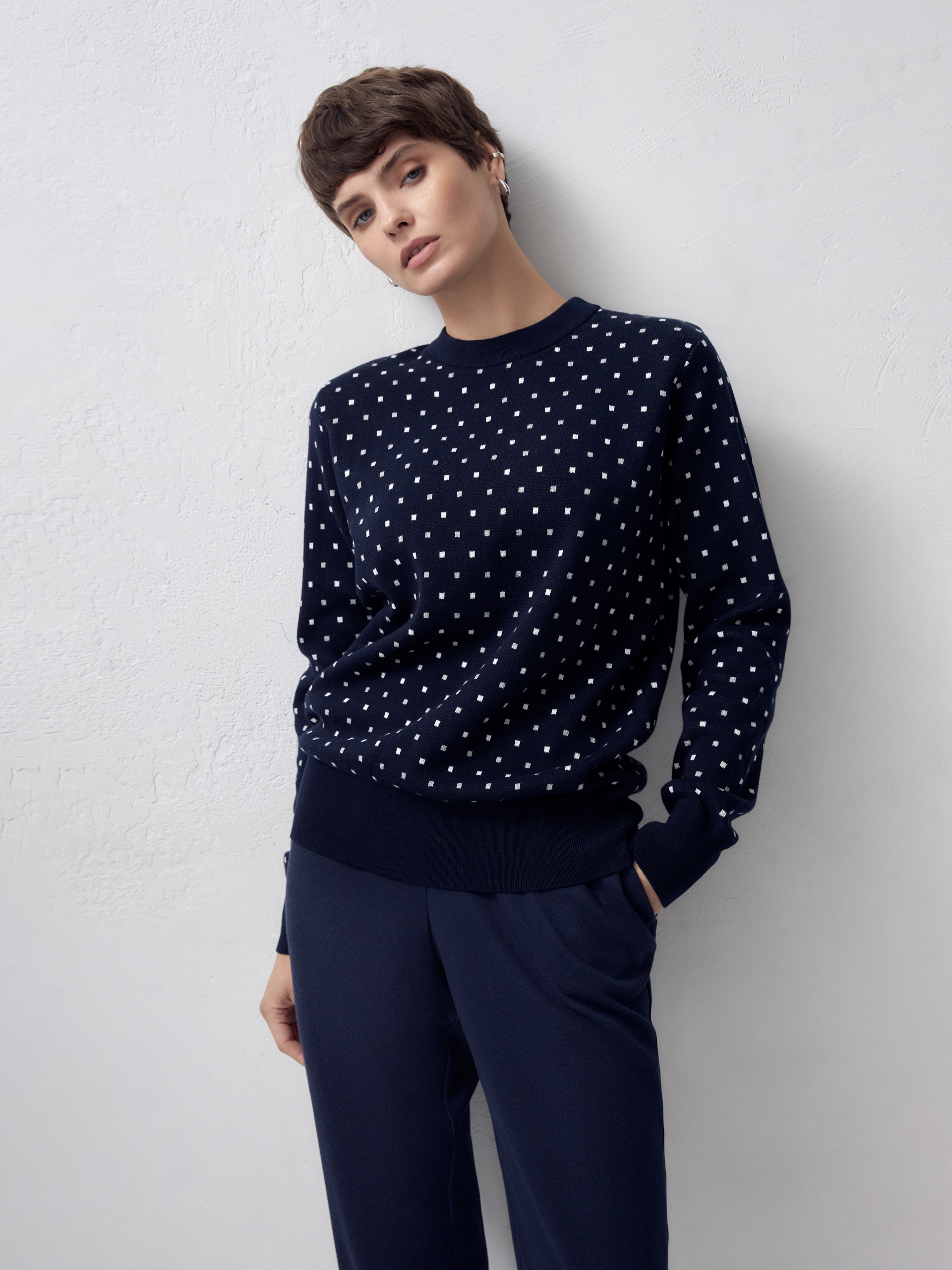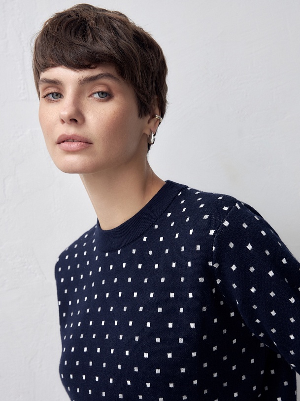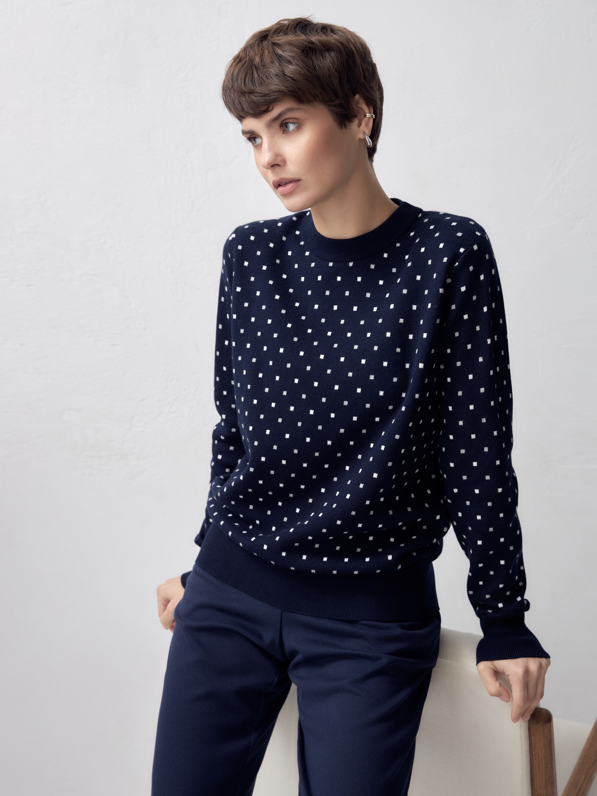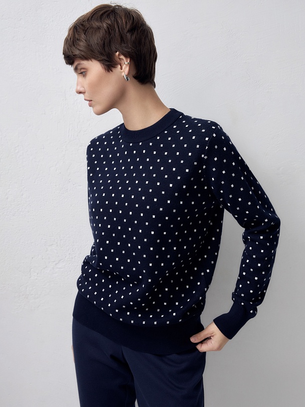 Вязаный жаккардовый джемпер базовой посадки глубокого синего цвета, разбавленного мелкими графичными квадратами, создаст прекрасную пару не только синим однотонным низам, но и джинсам.