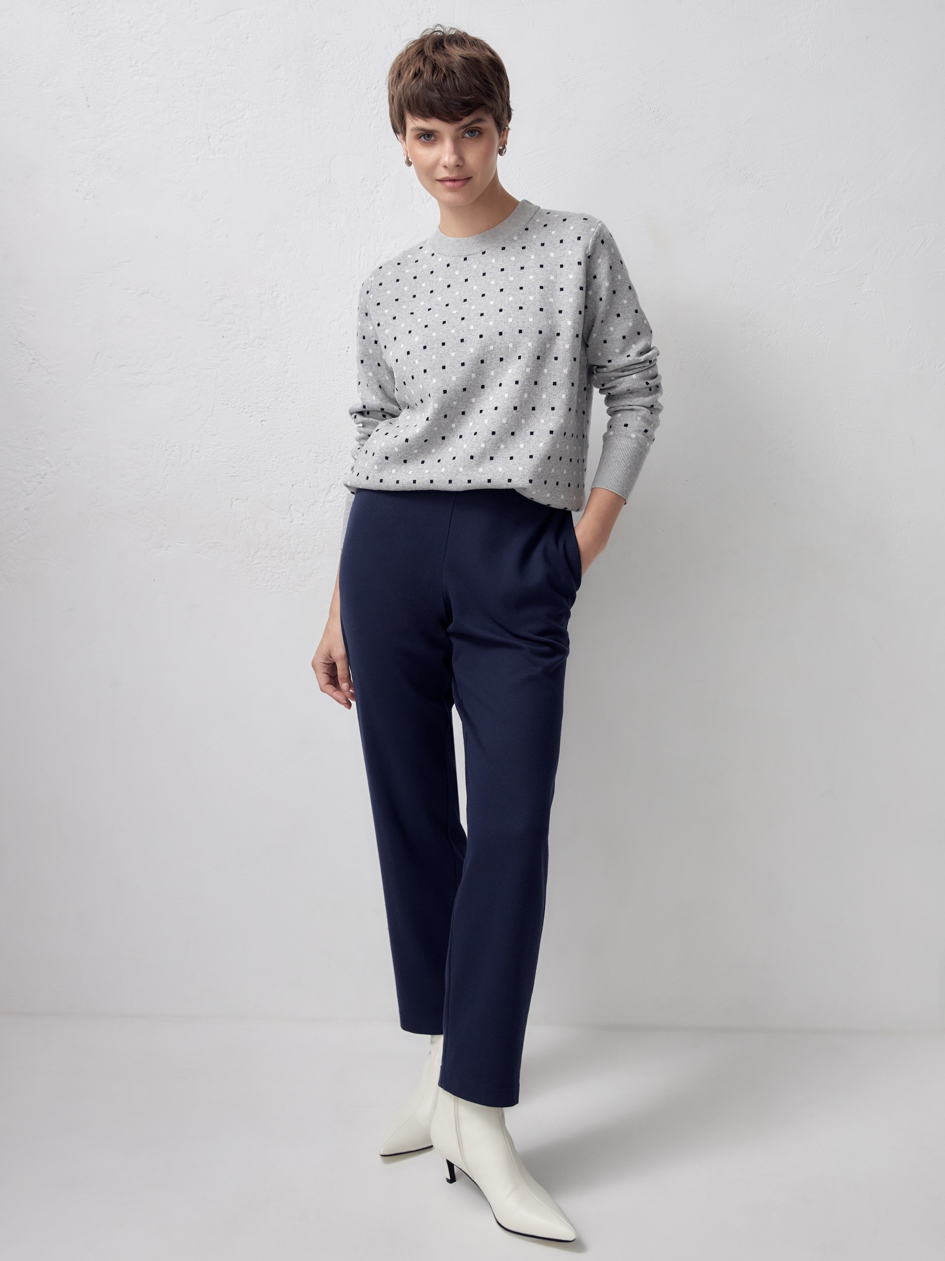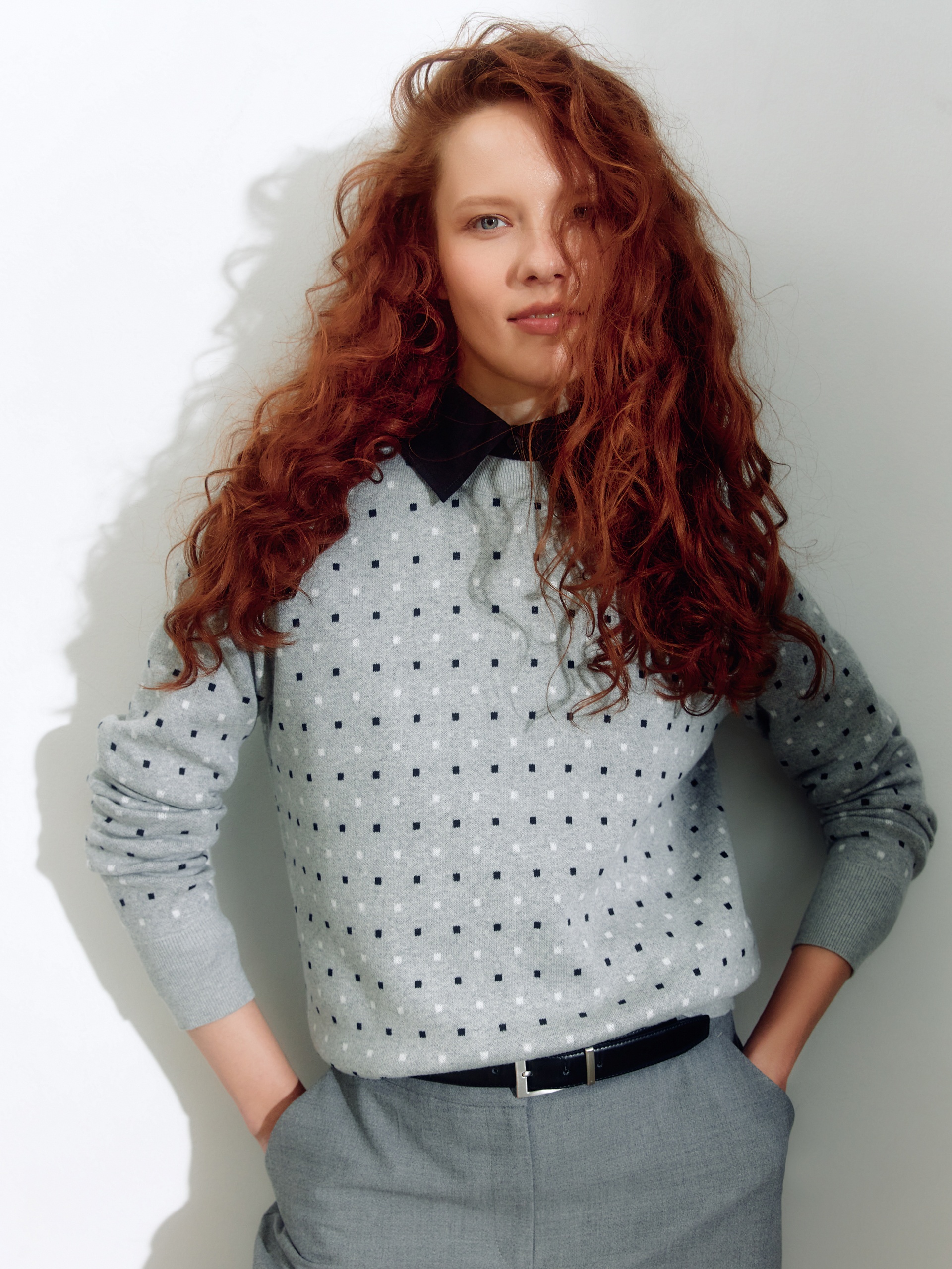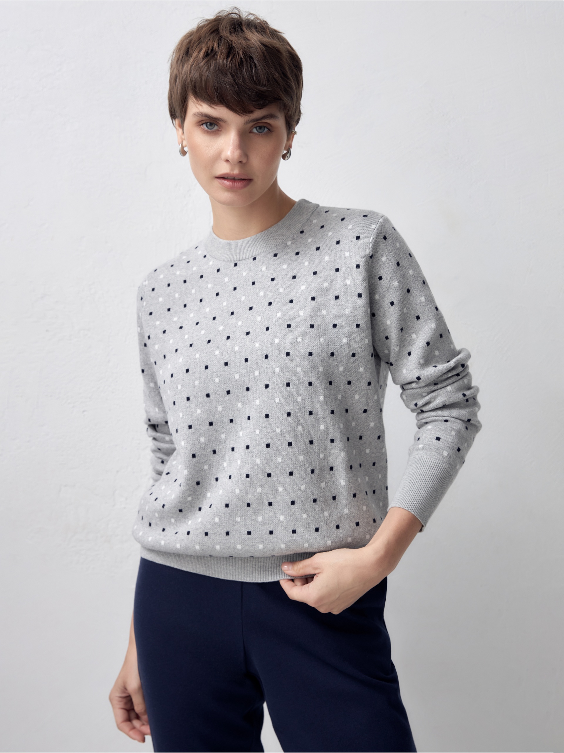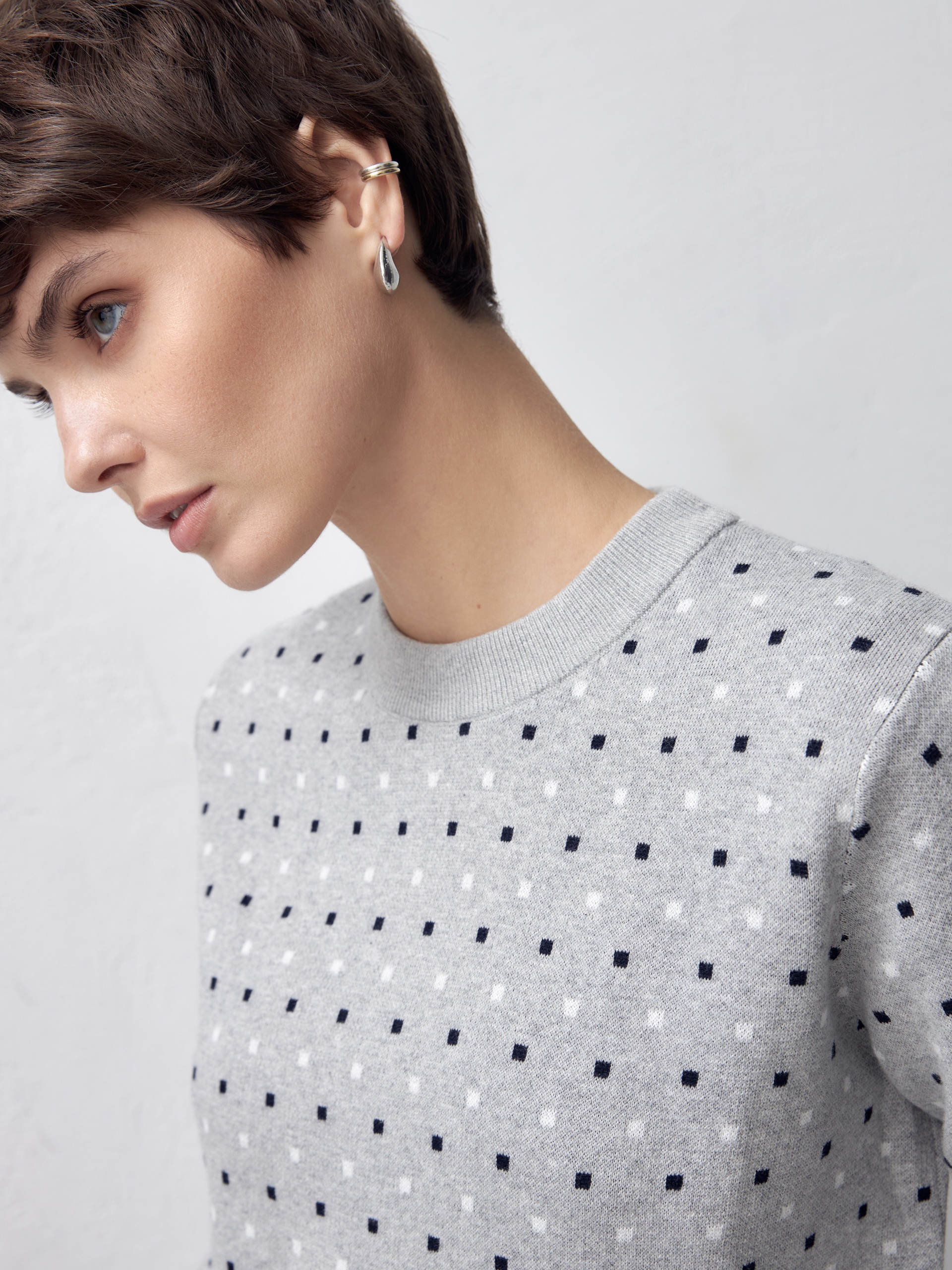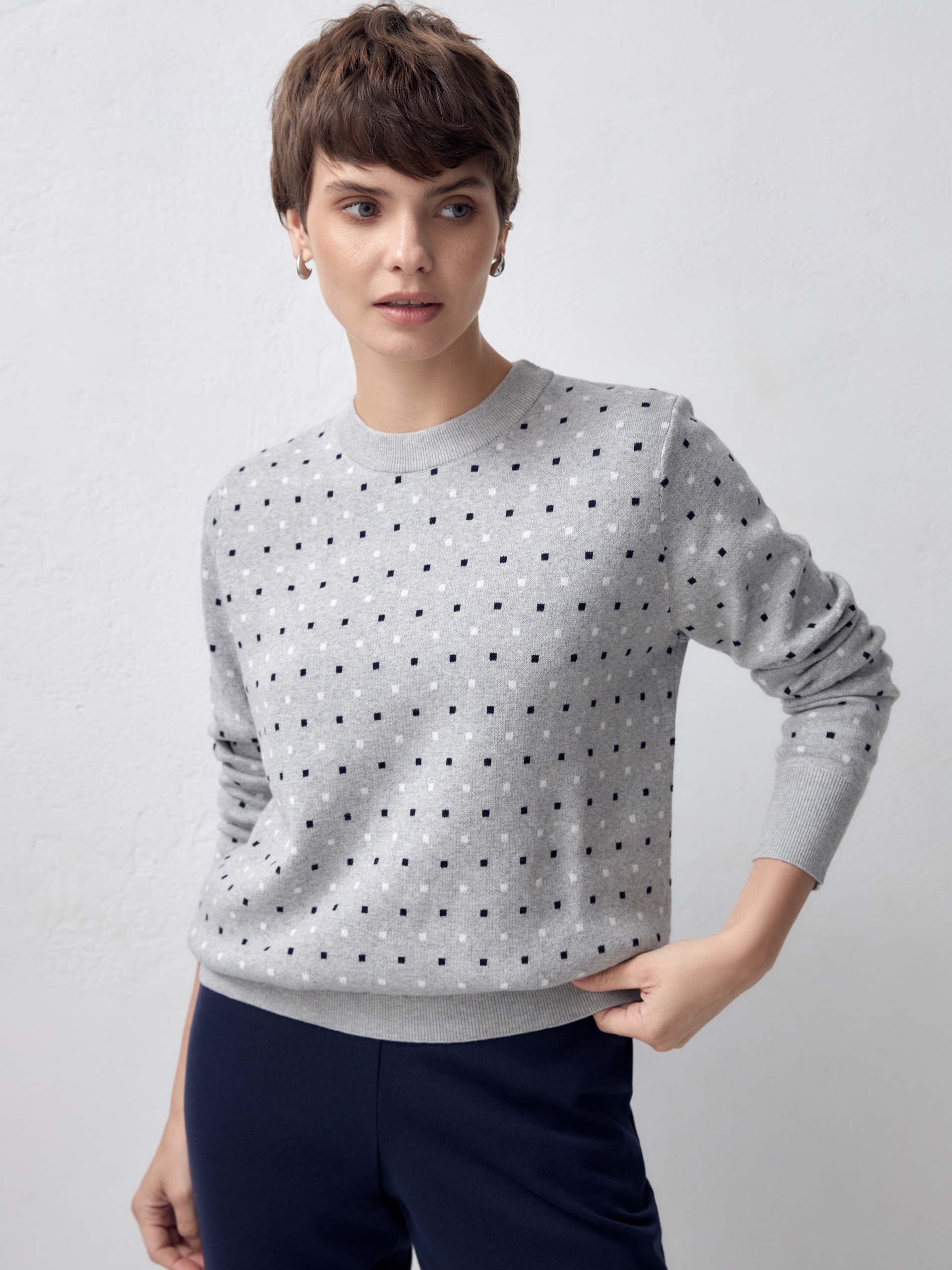 Вязаный жаккардовый джемпер базовой посадки серого меланжированного цвета, разбавленного мелкими графичными квадратами, создаст прекрасную пару не только синим однотонным низам, но и джинсам.