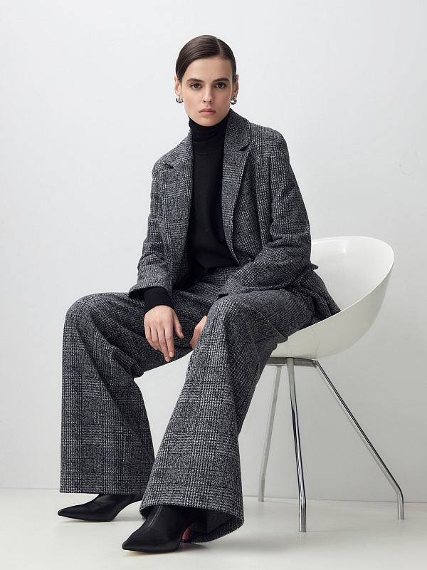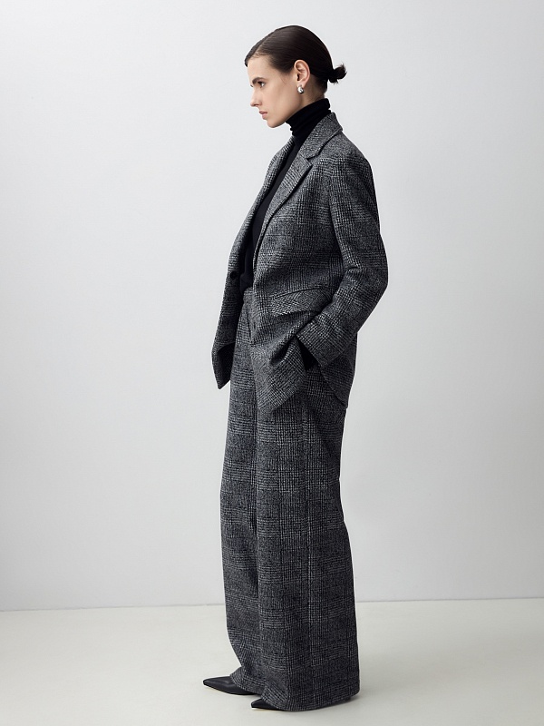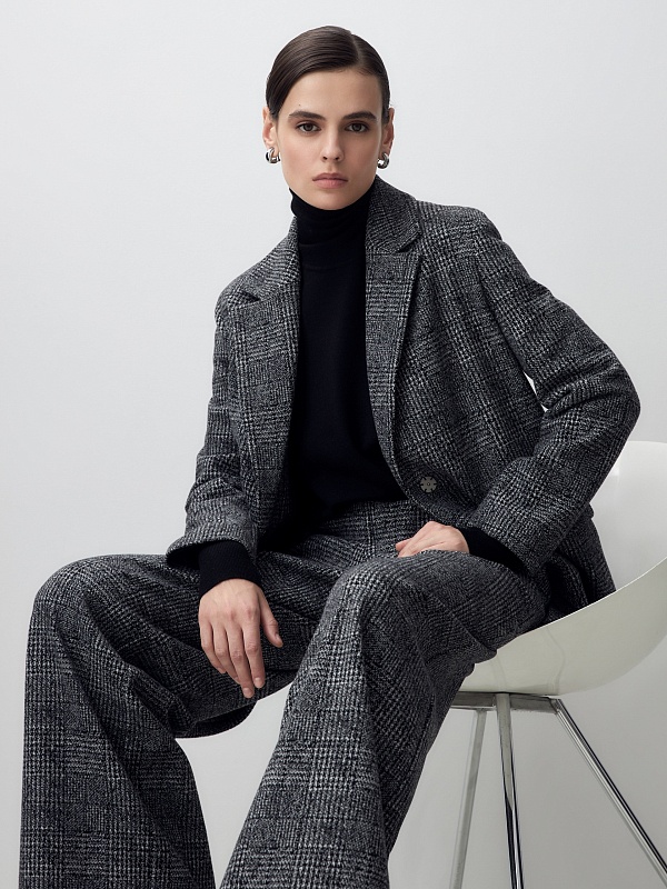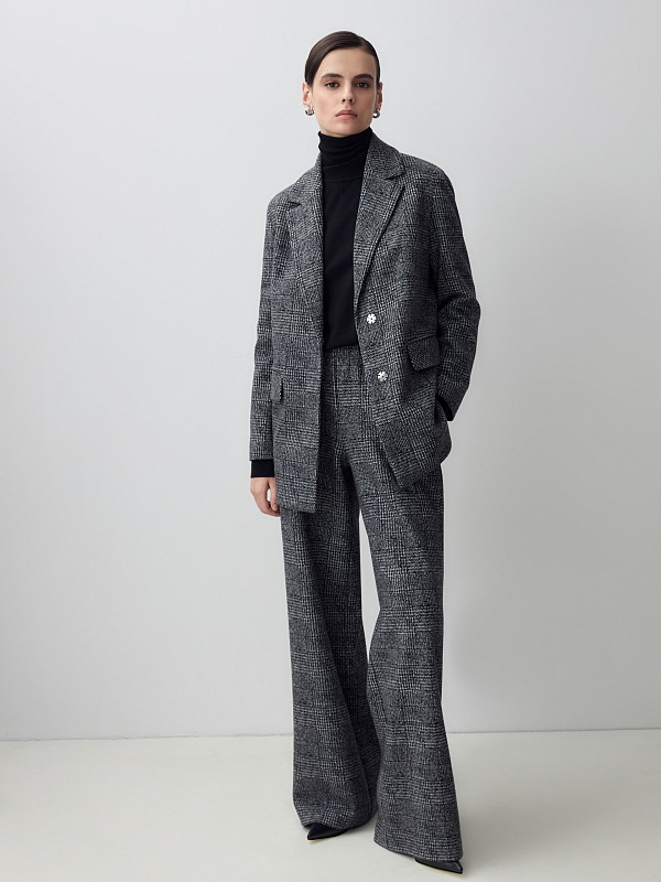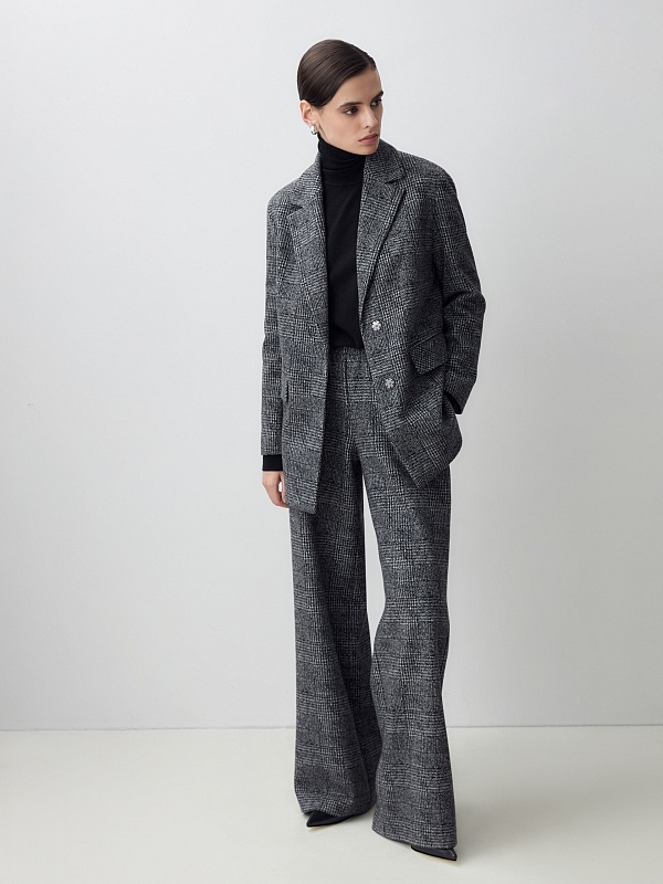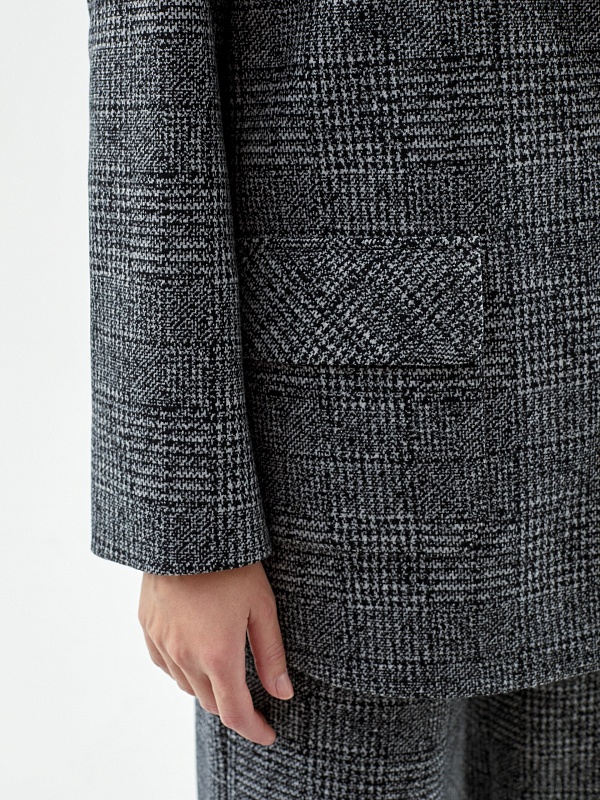 Жакет из мягкого трикотажа в принте пье-де-пуль будет органично смотреться с цветными и монохромными вещами, а также с изделиями из этой же ткани.