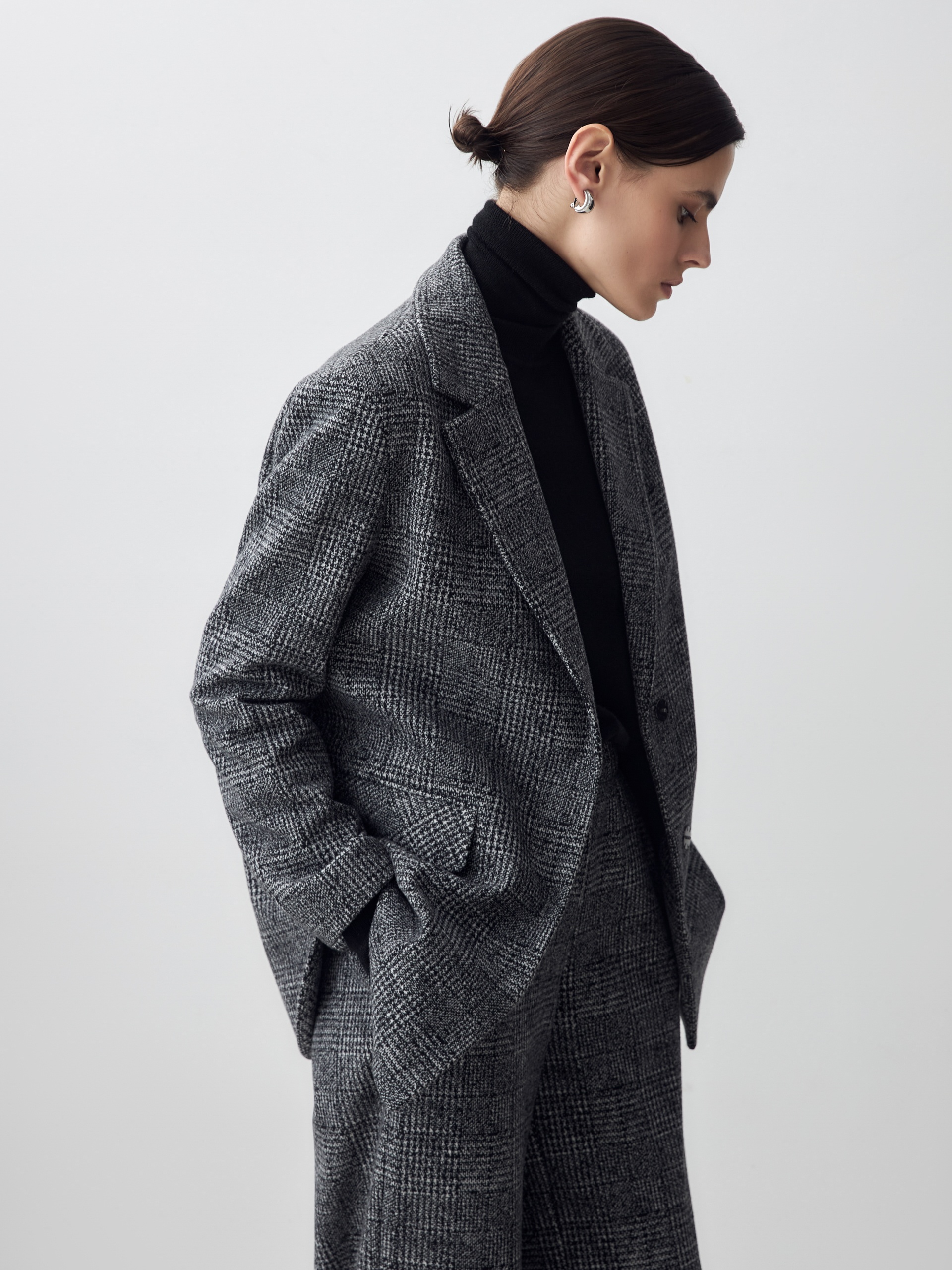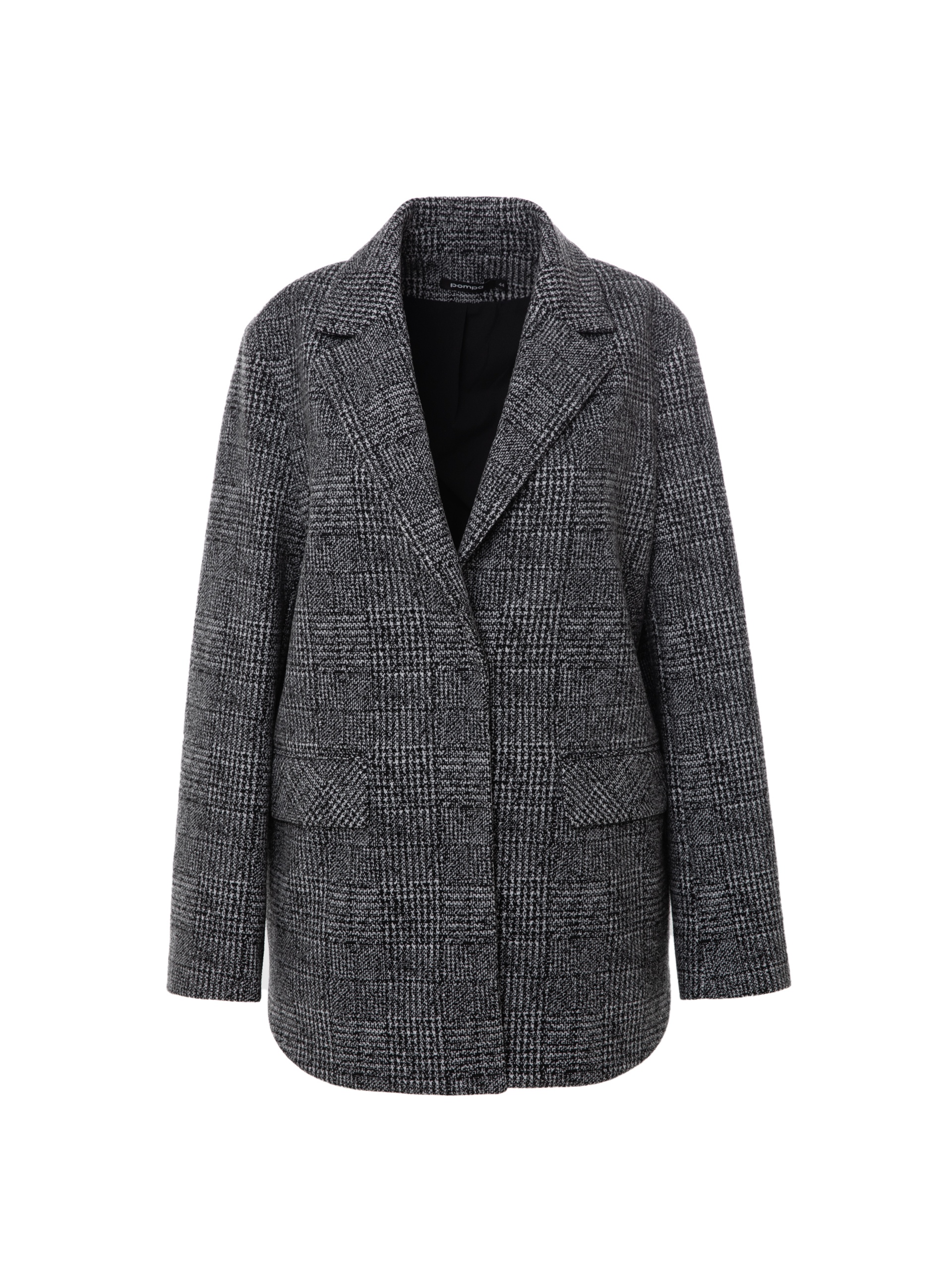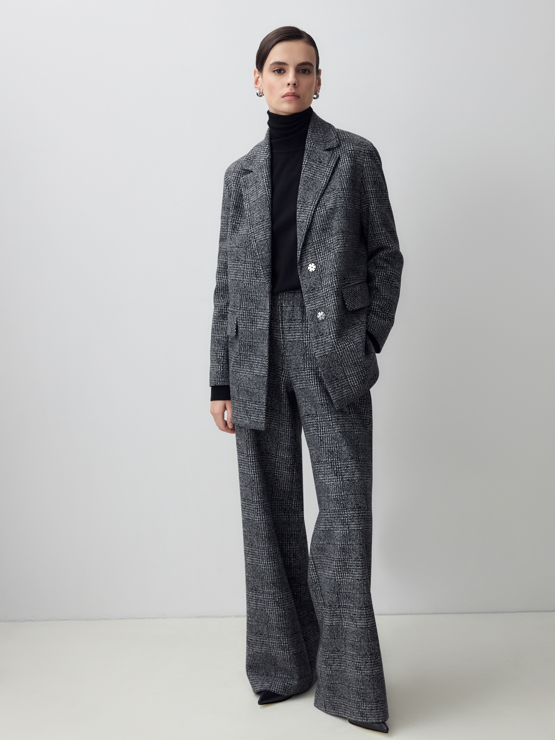 Жакет из мягкого трикотажа в принте пье-де-пуль будет органично смотреться с цветными и монохромными вещами, а также с изделиями из этой же ткани.
