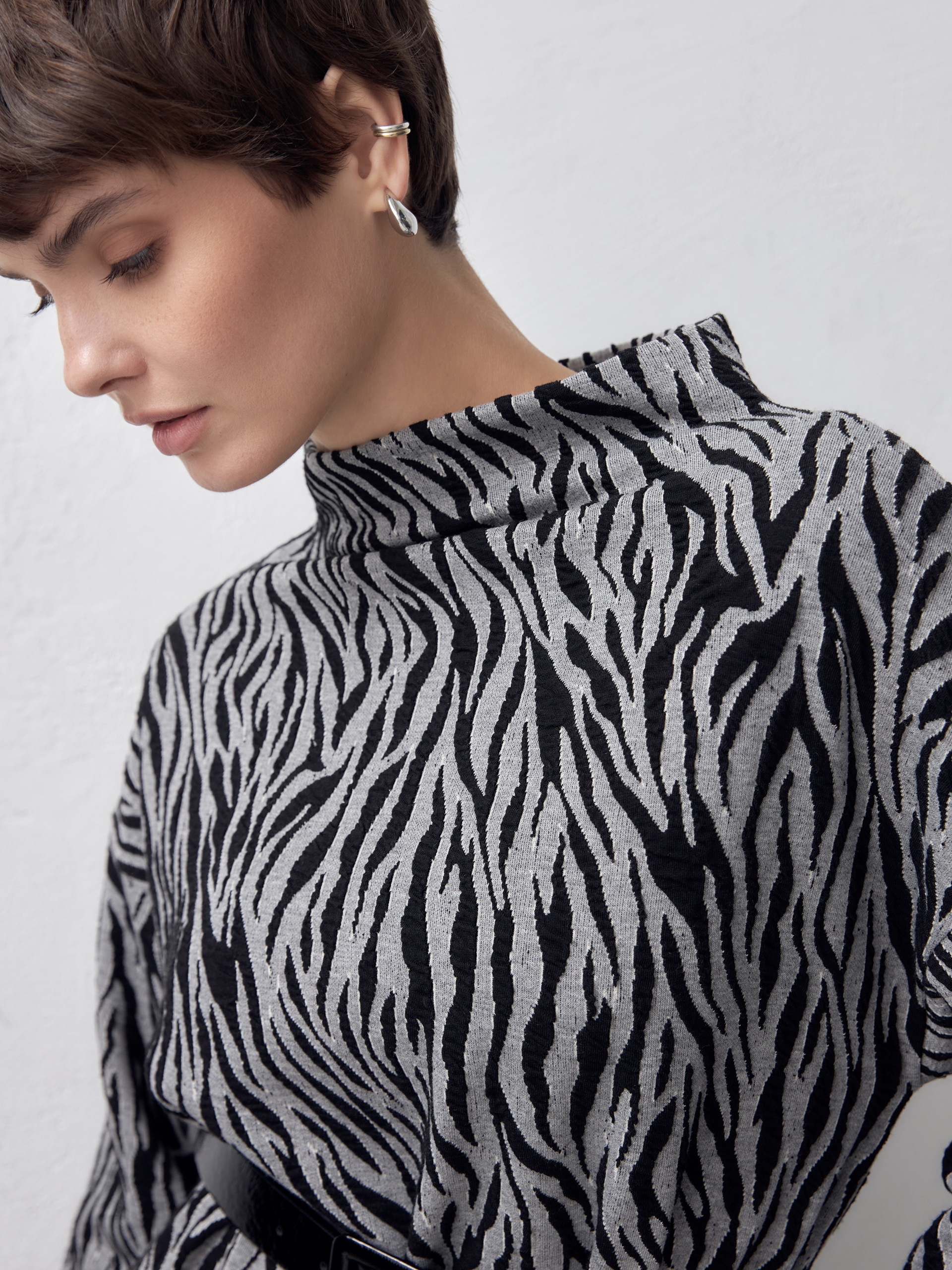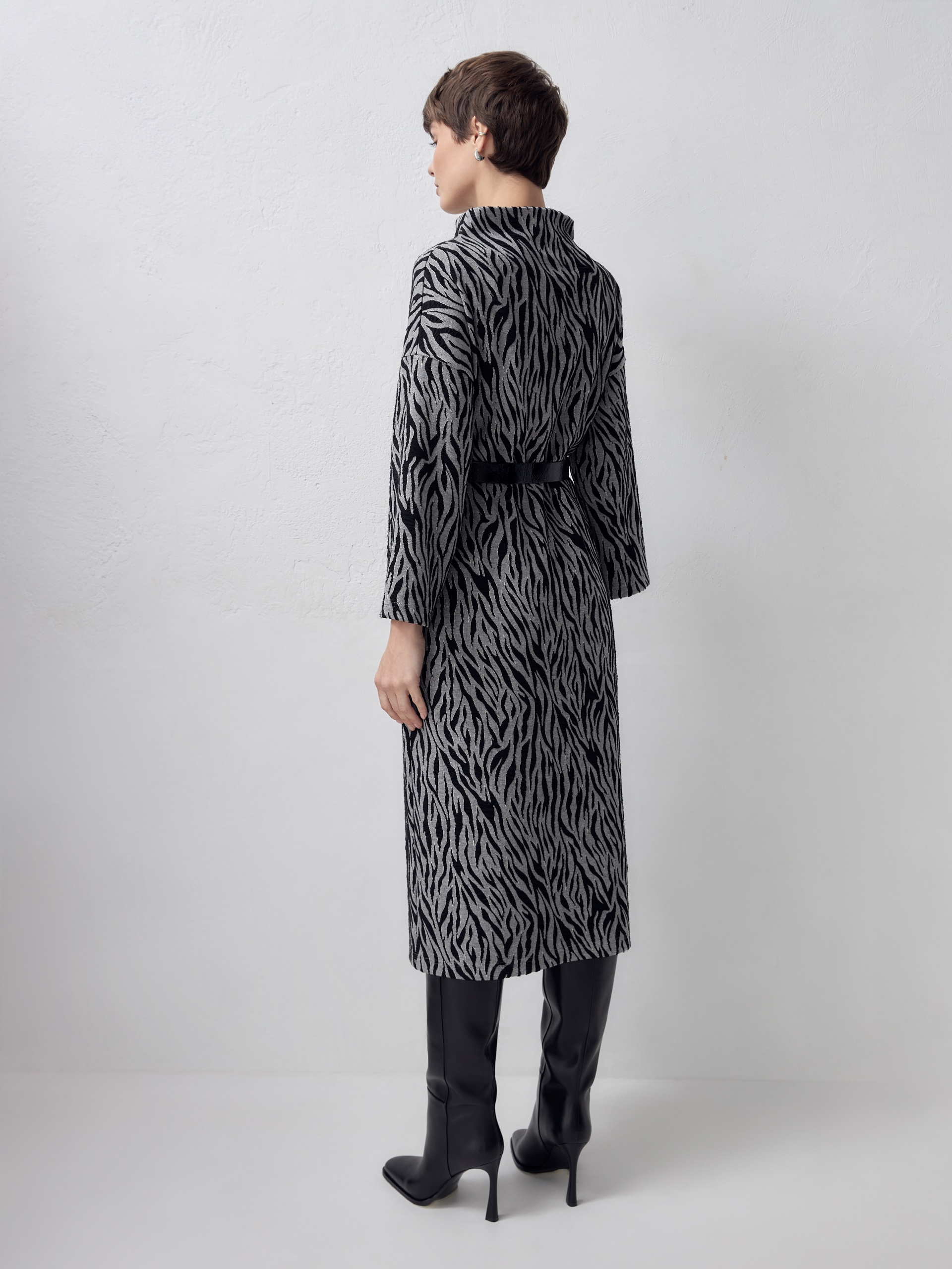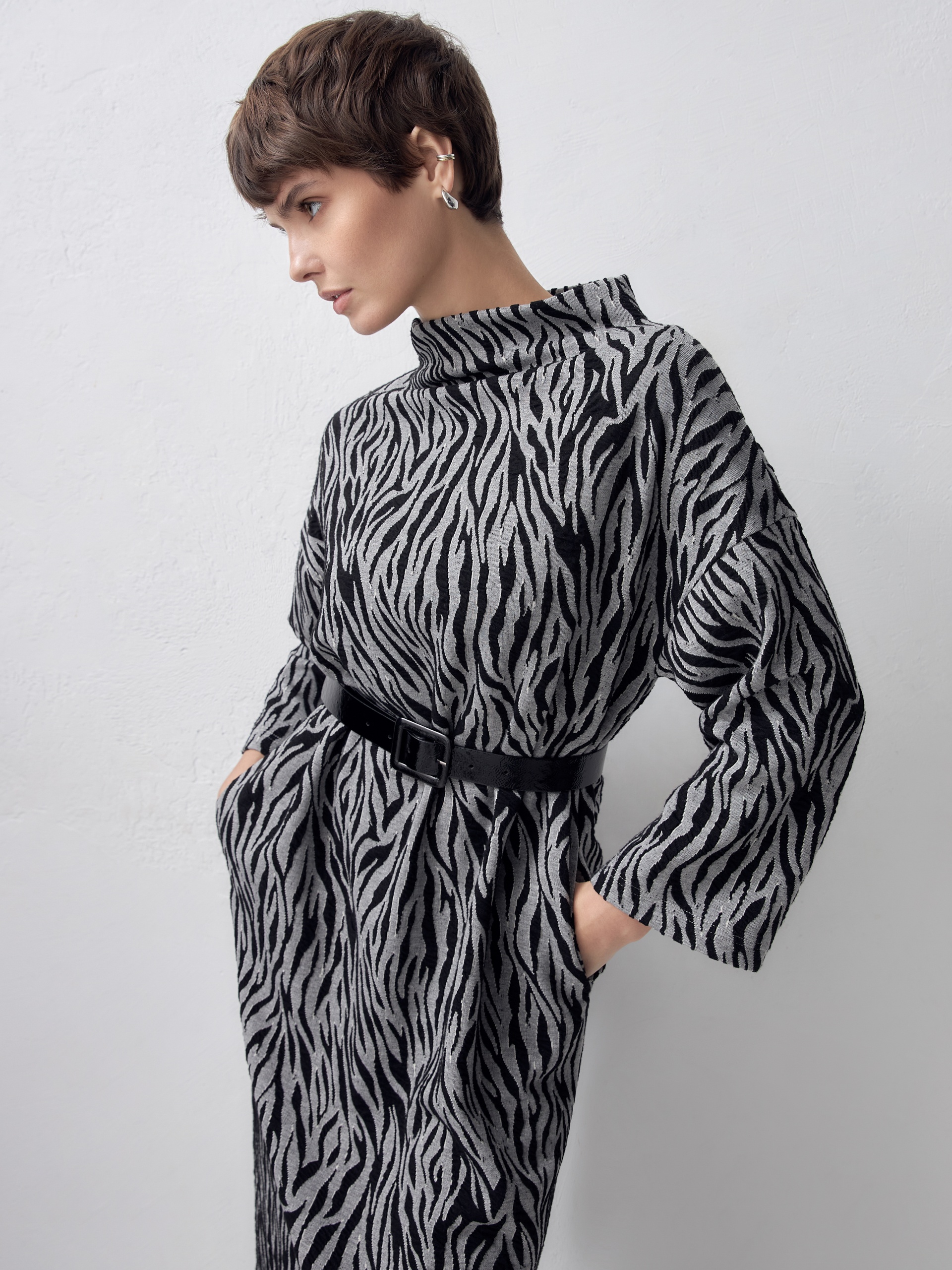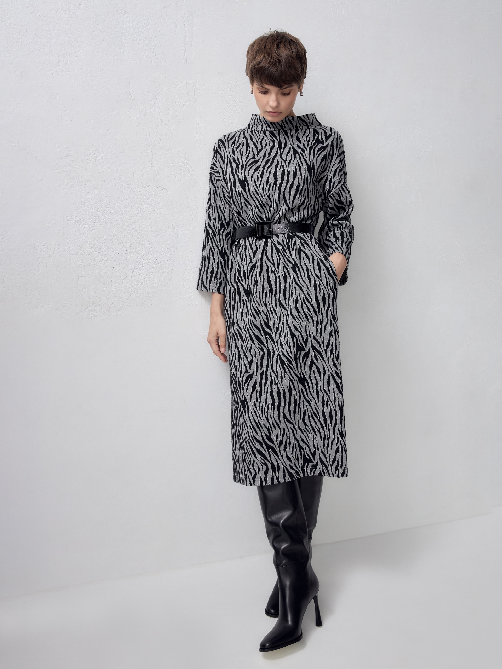 Платье свободного кроя из эффектного трикотажа рисунка "зебра". Спущенный рукав для создания мягкой линии плеча. Пояс из искусственной лаковой кожи для создания более приталенного силуэта.
