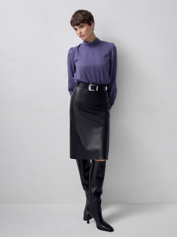 Юбка-карандаш классического кроя с рельефами из черной экокожи с потайной молнией на спинке. Юбка длиной до колена.