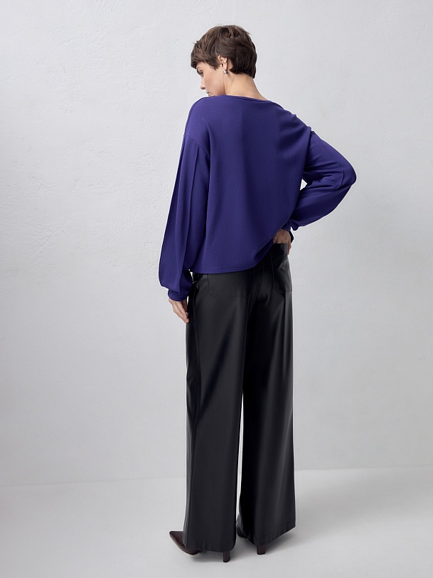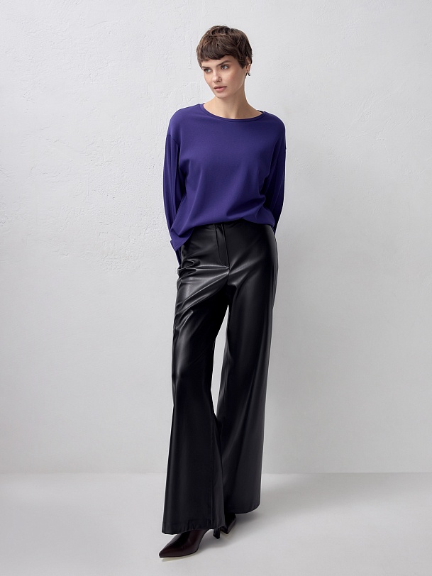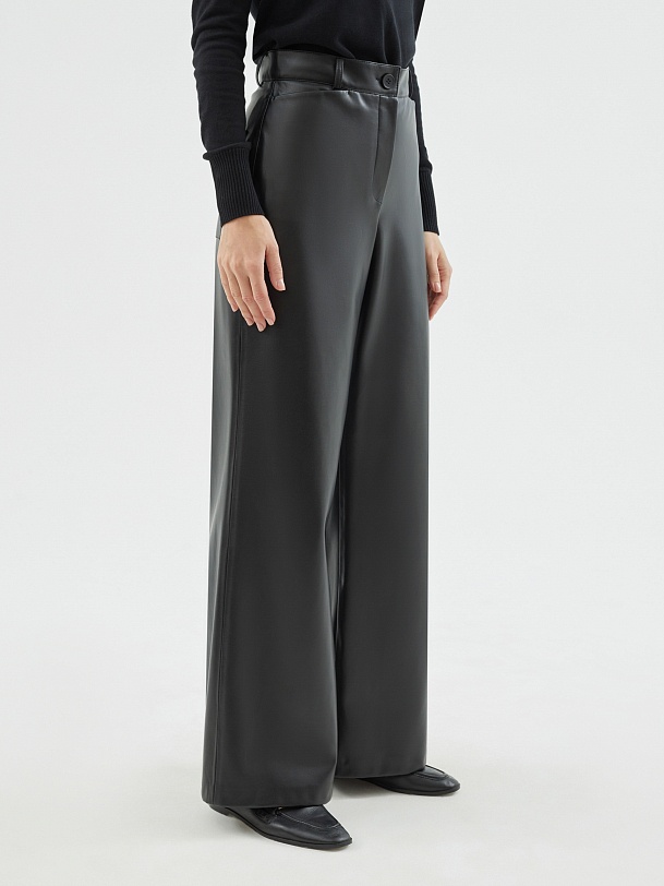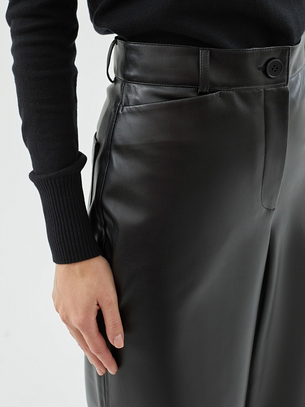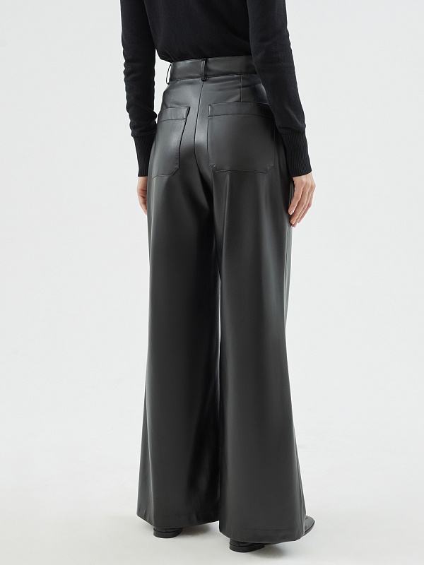 Широкие расклешенные брюки из черной экокожи на высокой посадке с притачным поясом и шлевками. На задней половине брюк накладные карманы.