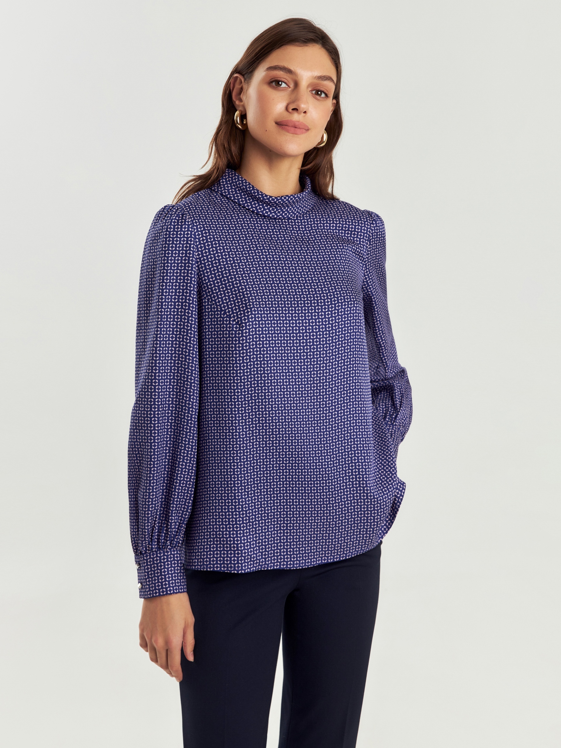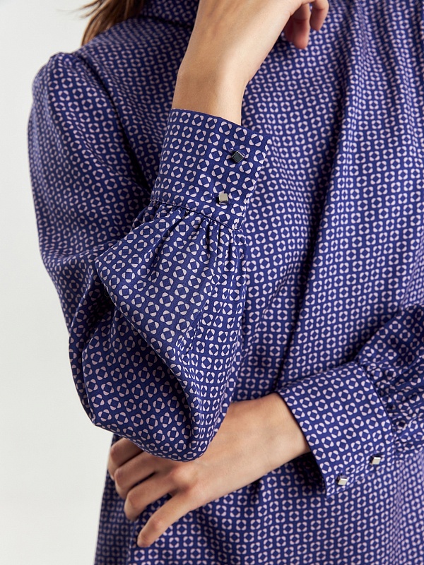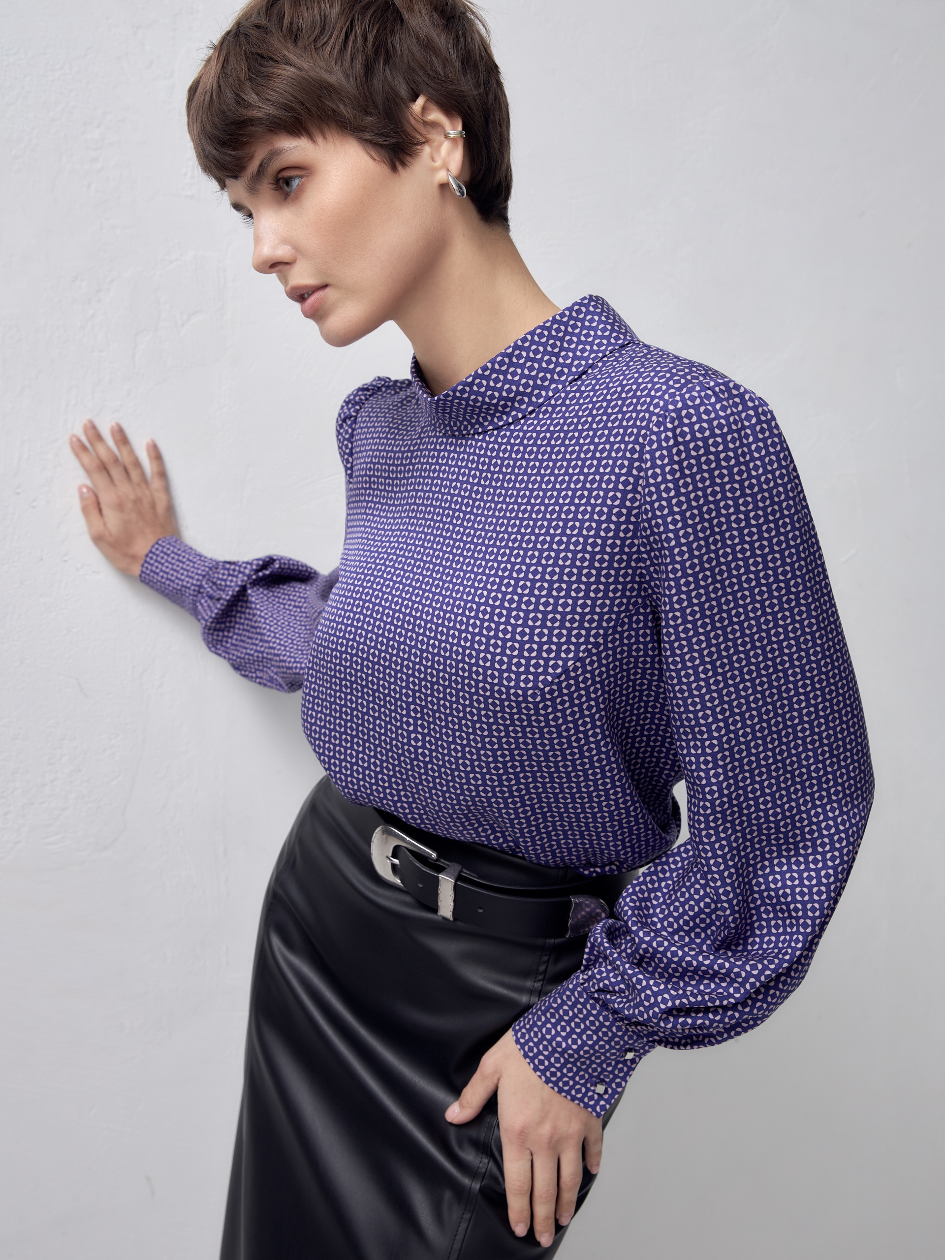 Прямая блуза из плательной ткани с высоким воротником-стойкой и пуговицей на спинке. Блуза выполнена из 100% тенселя. Спущенный рукав со сборкой на манжете с акцентными пуговицами. По бокам небольшие разрезы.