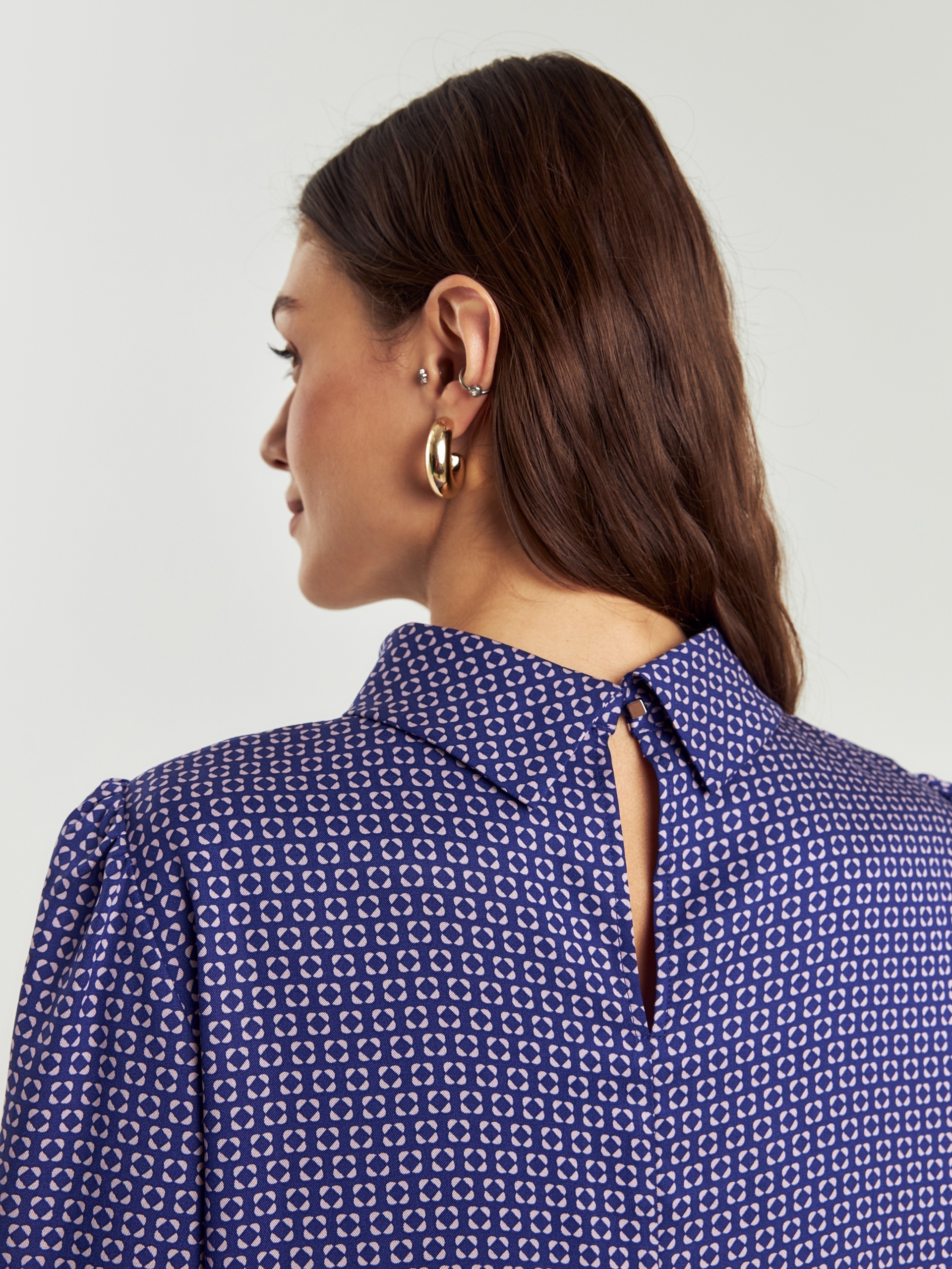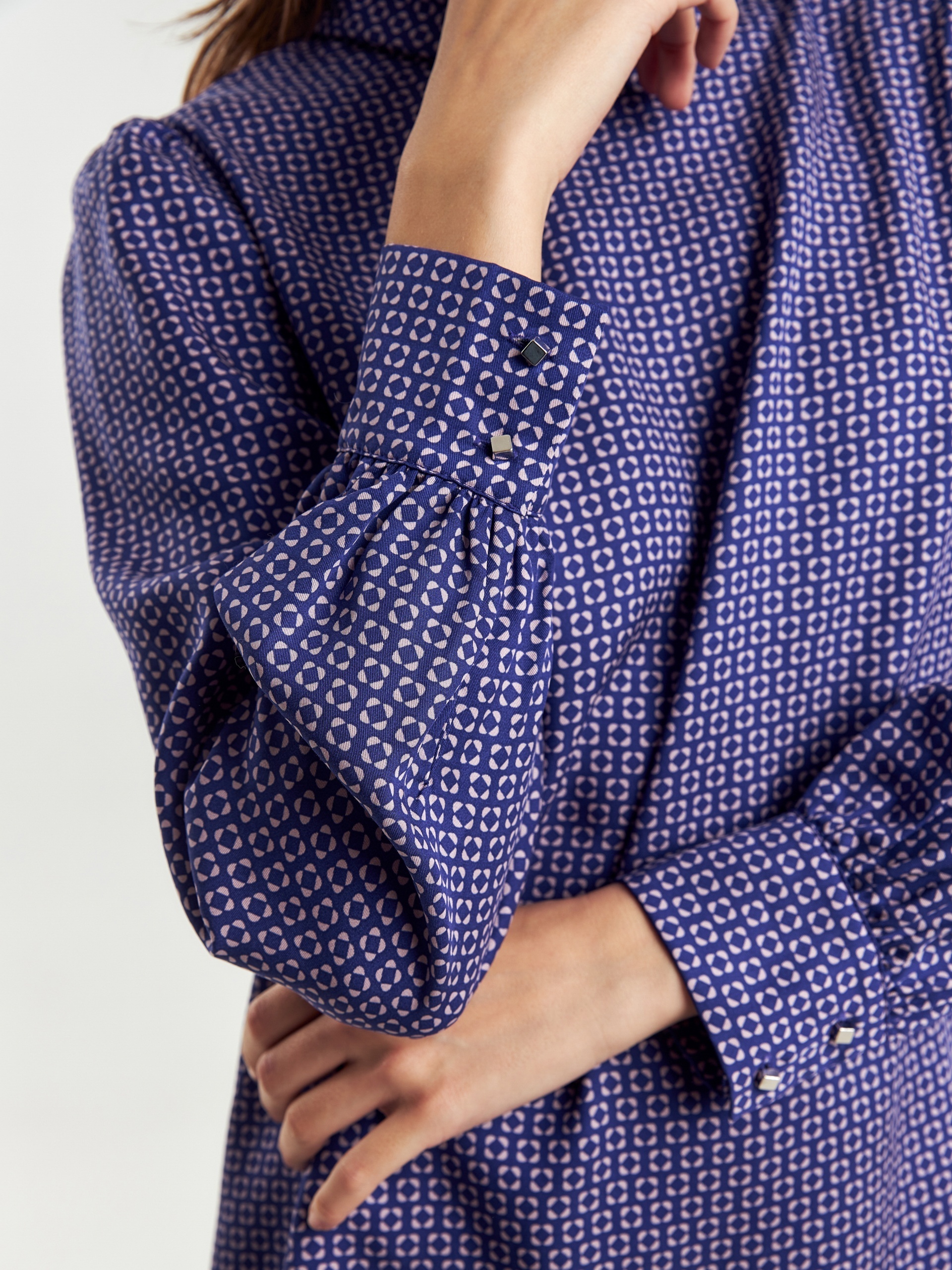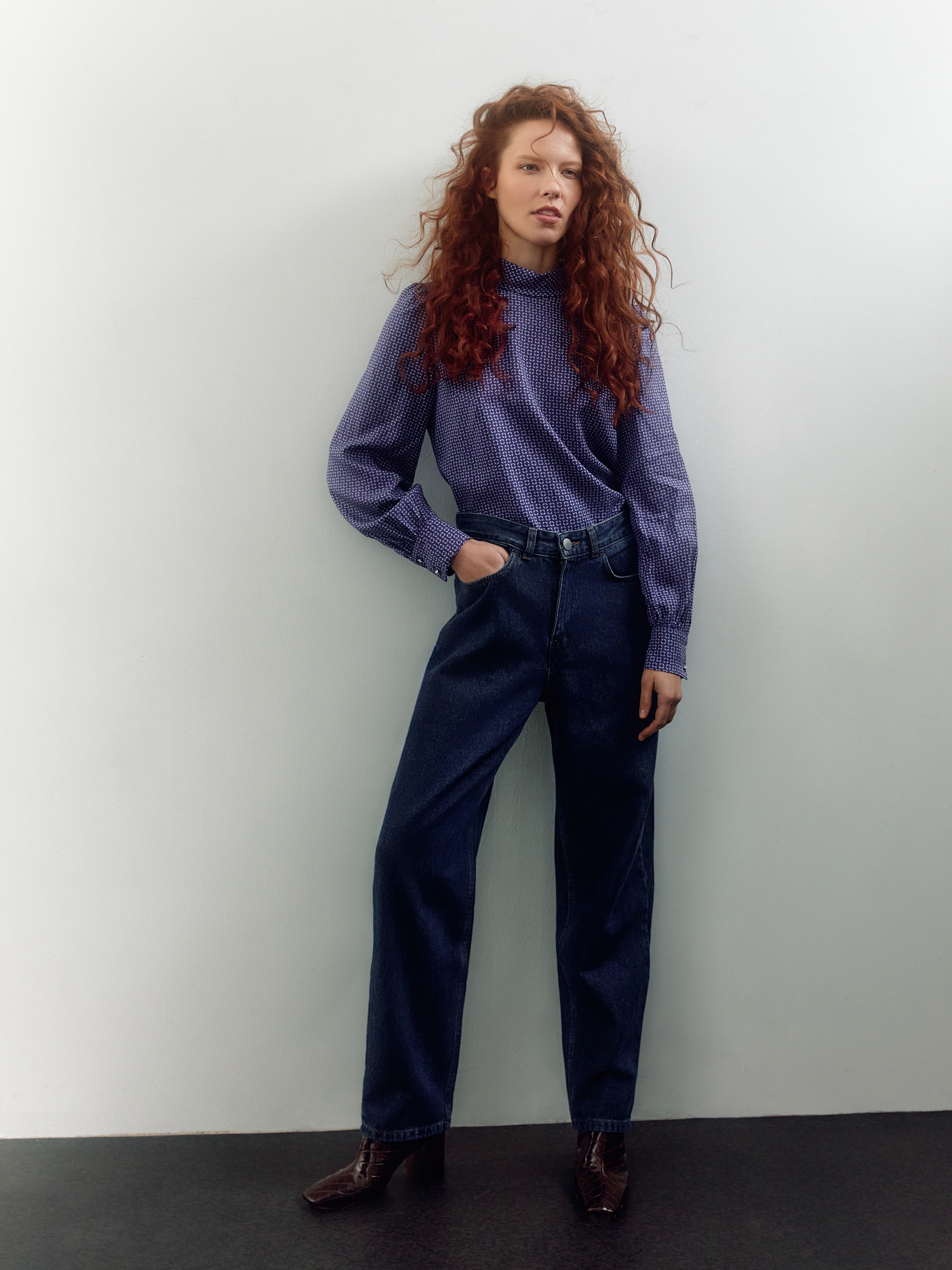 Прямая блуза из плательной ткани с высоким воротником-стойкой и пуговицей на спинке. Блуза выполнена из 100% тенселя. Спущенный рукав со сборкой на манжете с акцентными пуговицами. По бокам небольшие разрезы.