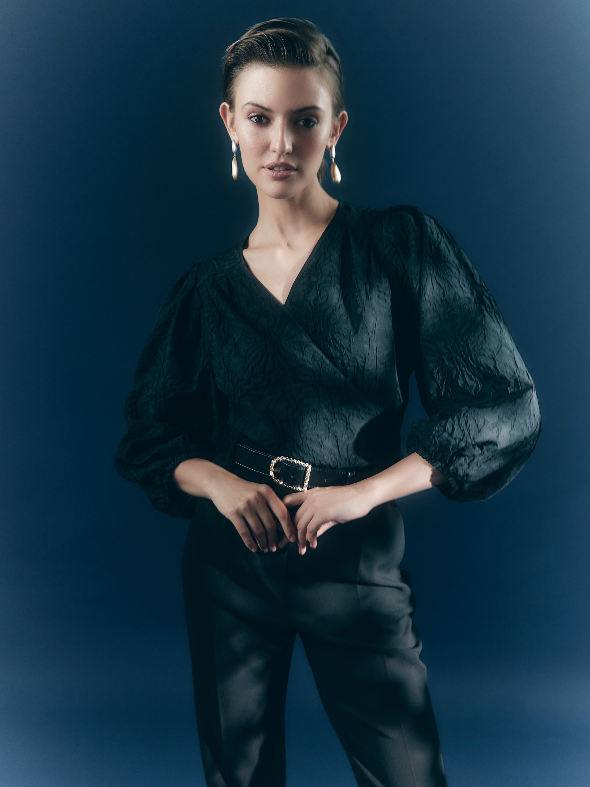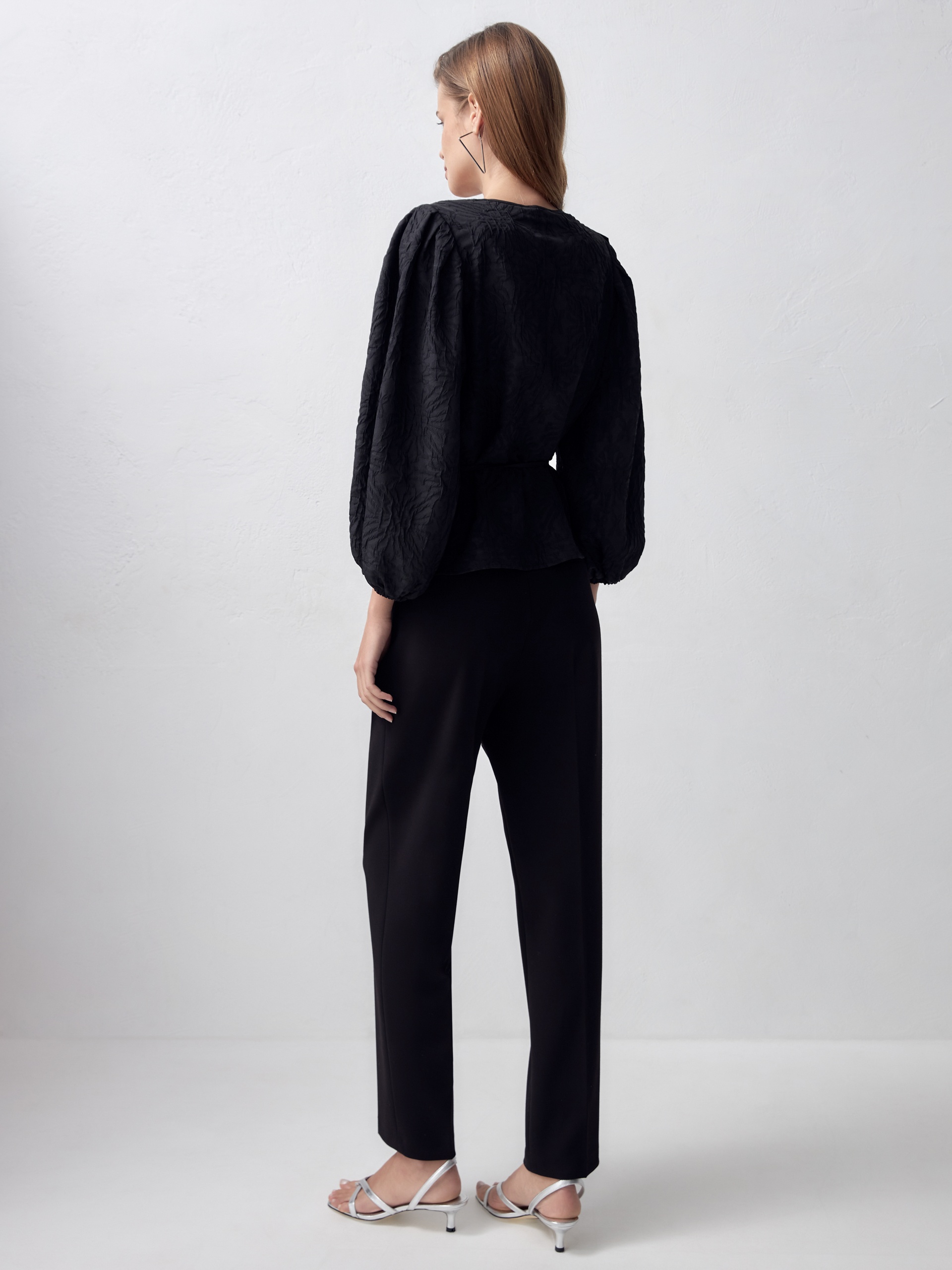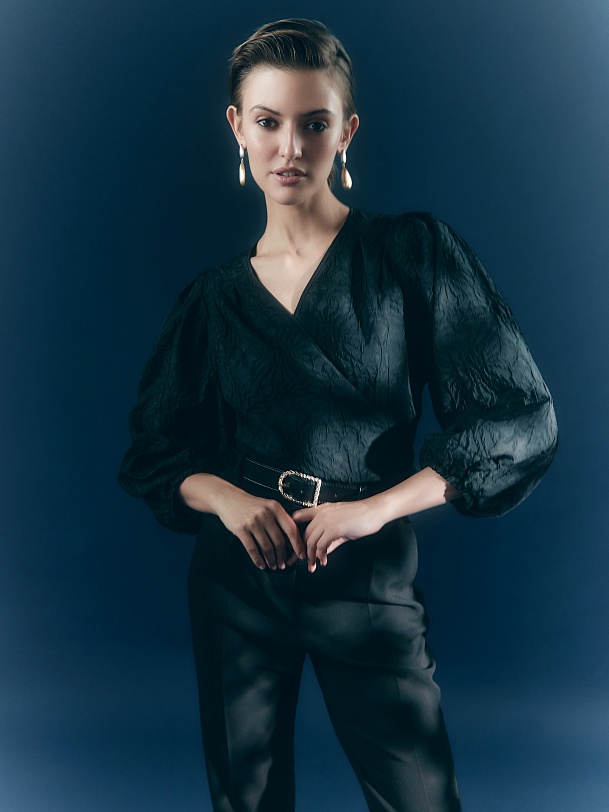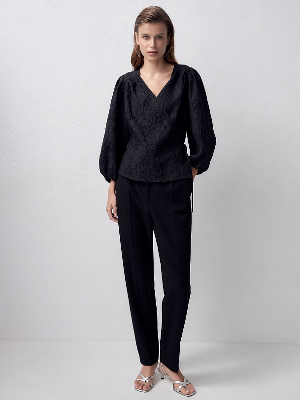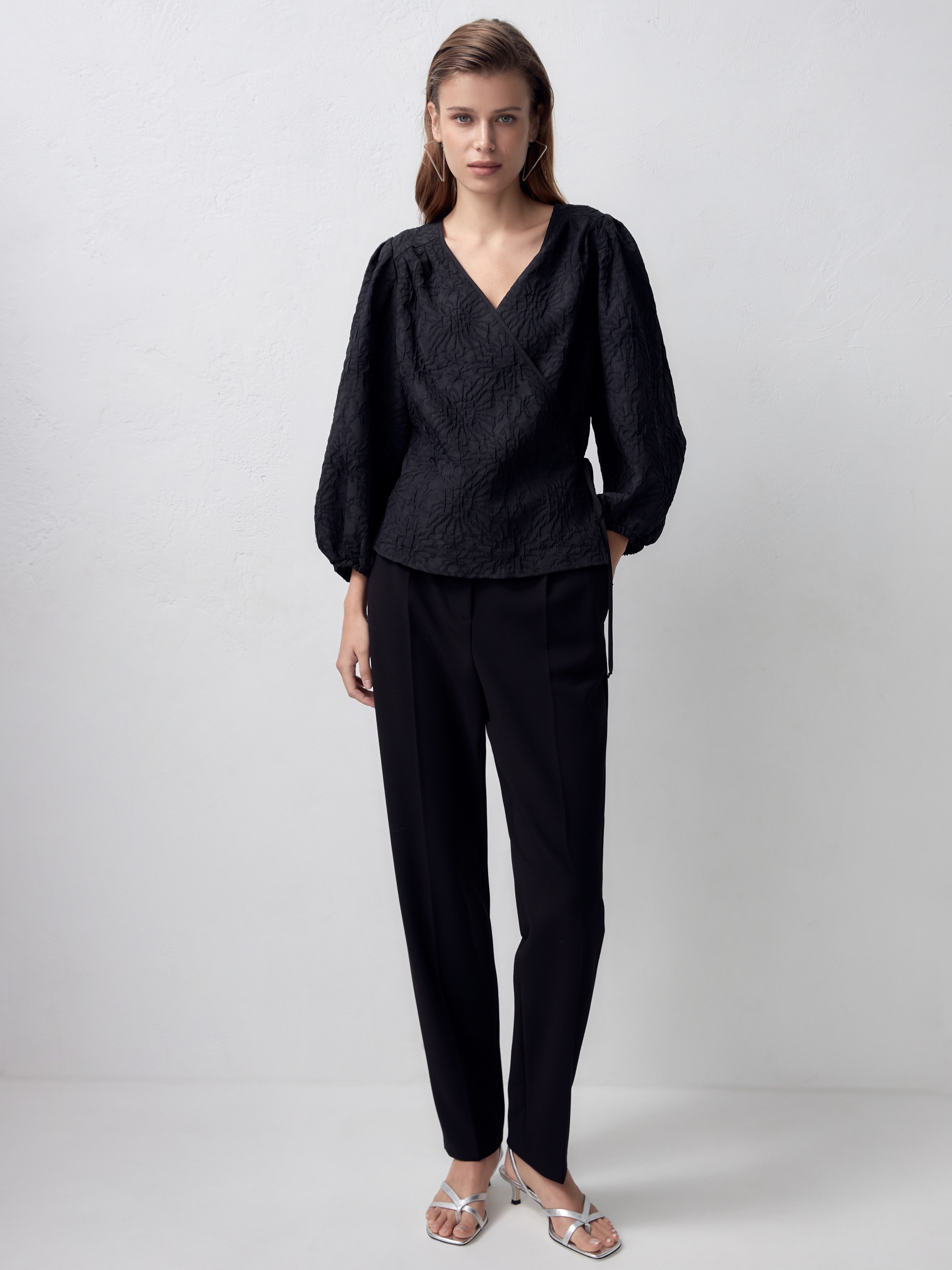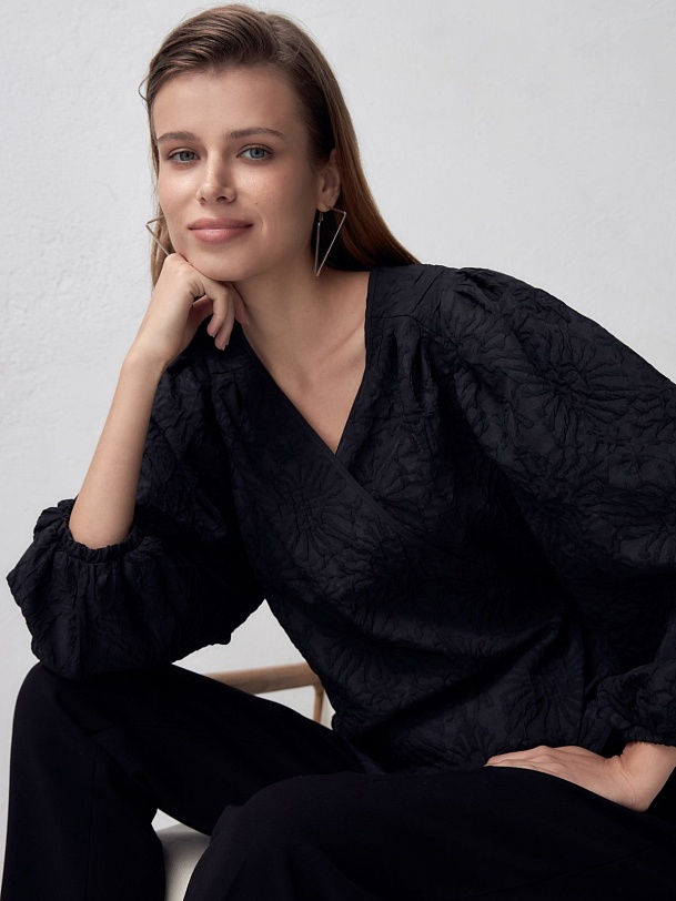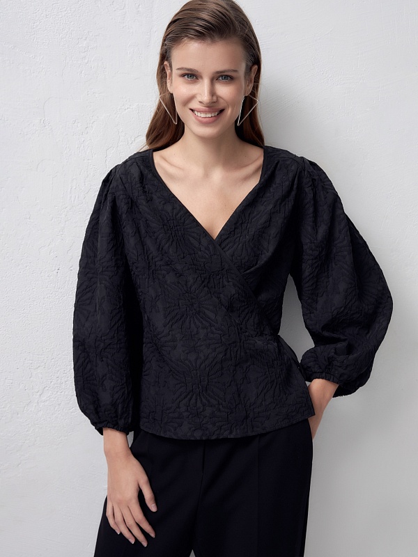 Полуприлегающая блуза на запах из фактурной плательной ткани с V-образным вырезом и объемными рукавами-буфами на резинке.