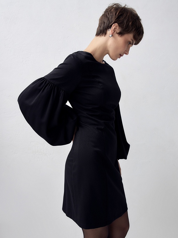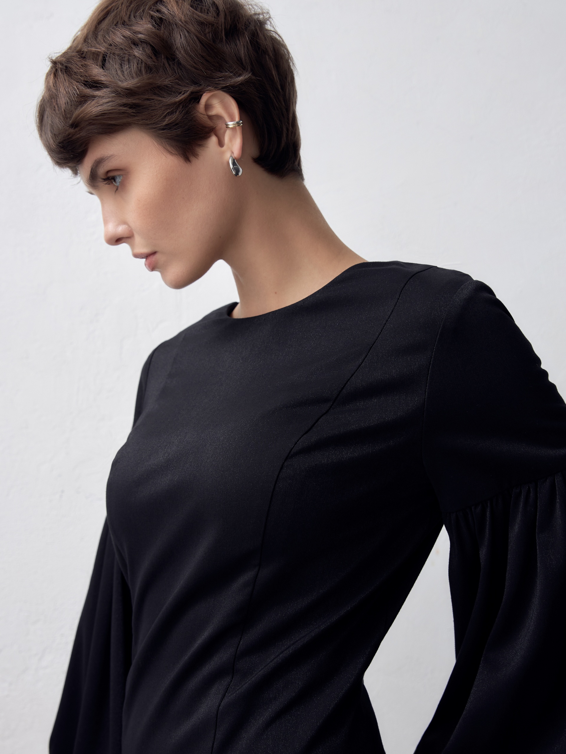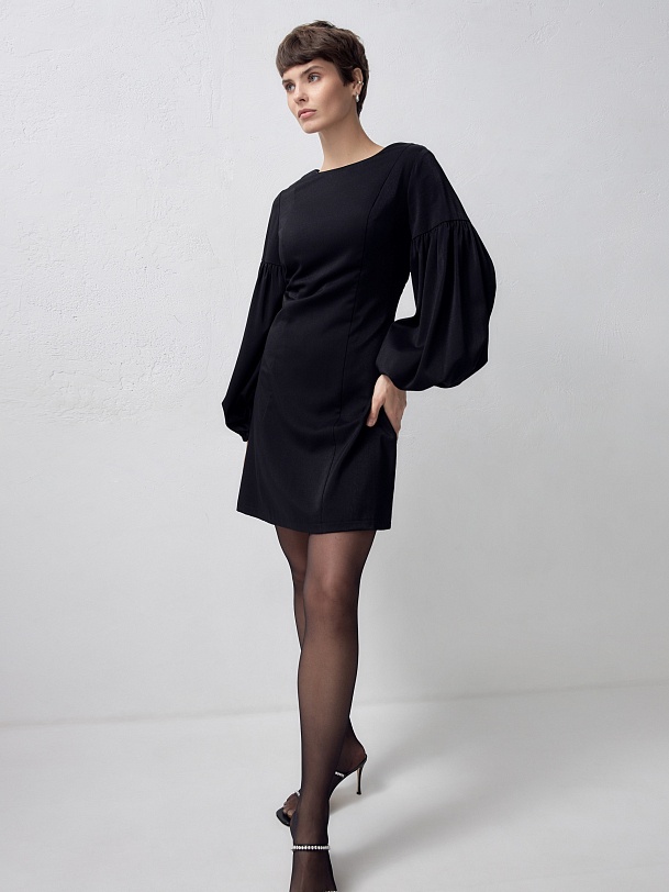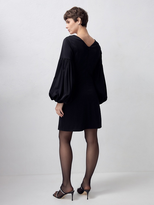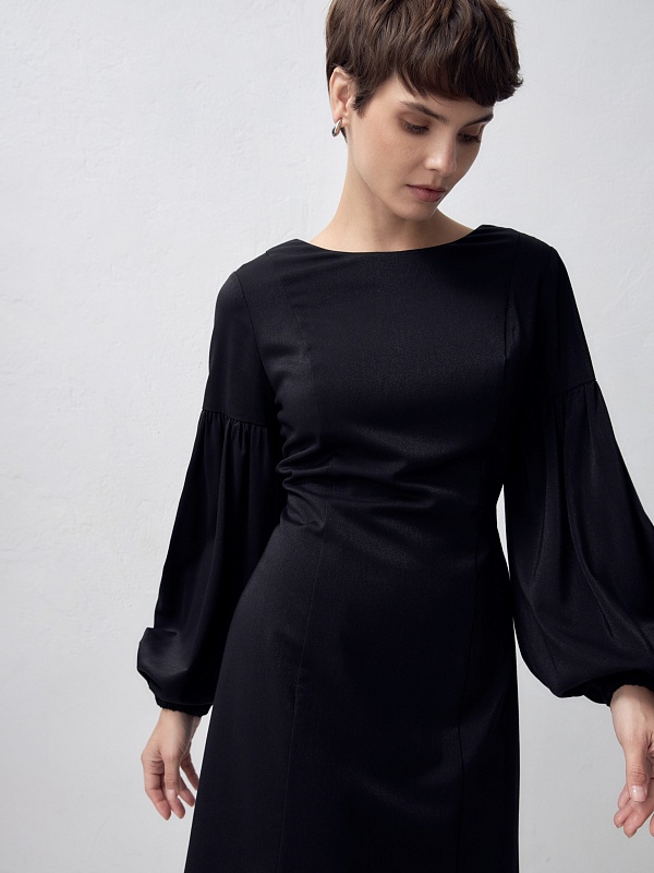 Стильное вечернее платье из жаккардовой ткани укороченного прилегающего силуэта с круглым вырезом горловины и объемным рукавом со сборкой. Эта модель идеально подчеркнет изящество ваших ног.