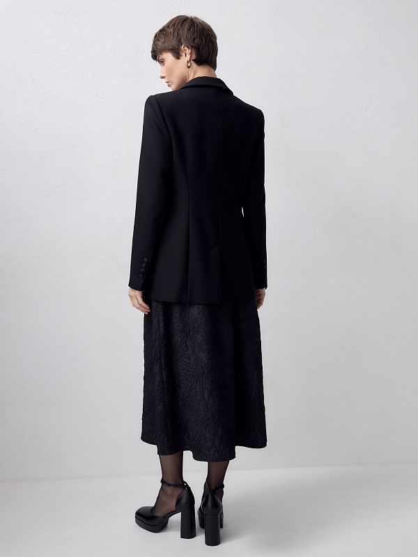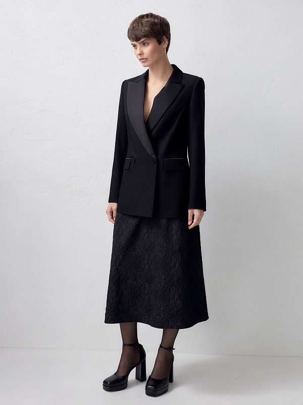 Классический двубортный жакет на одной пуговице приталенного силуэта с втачным плечом и акцентными лацканами из атласной ткани. Жакет имеет два прорезных кармана с клапанами. Вечернюю группу составляет с брюками из одной ткани.