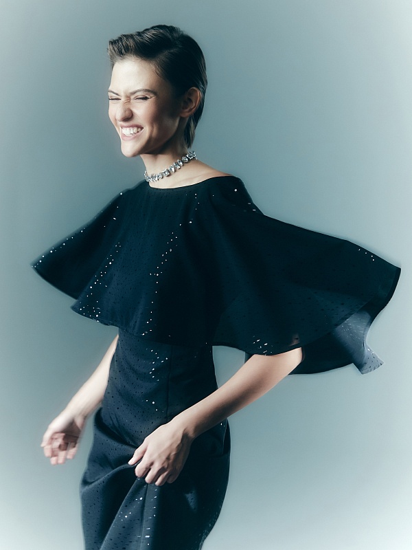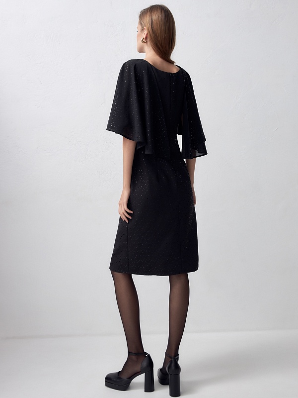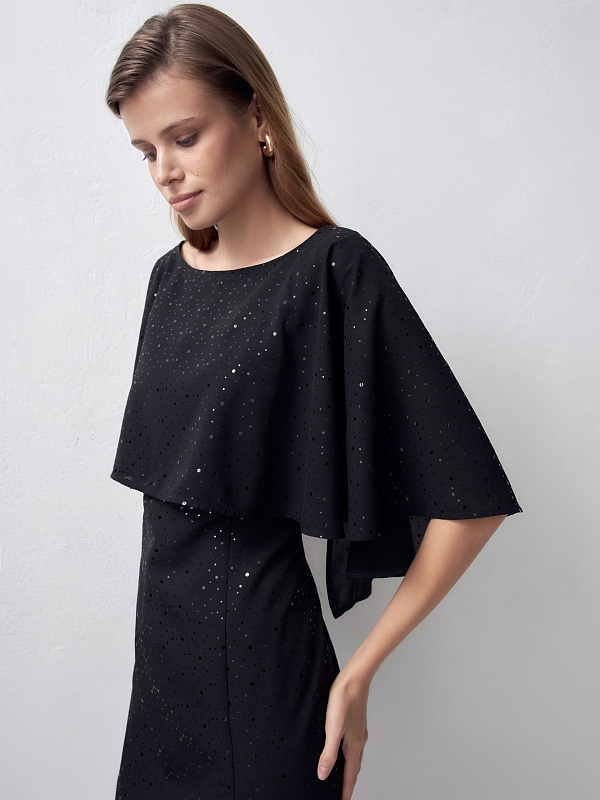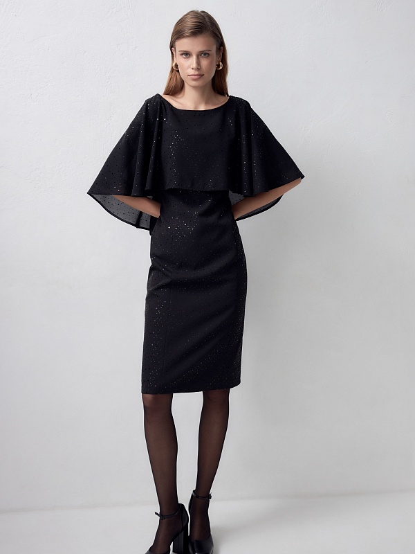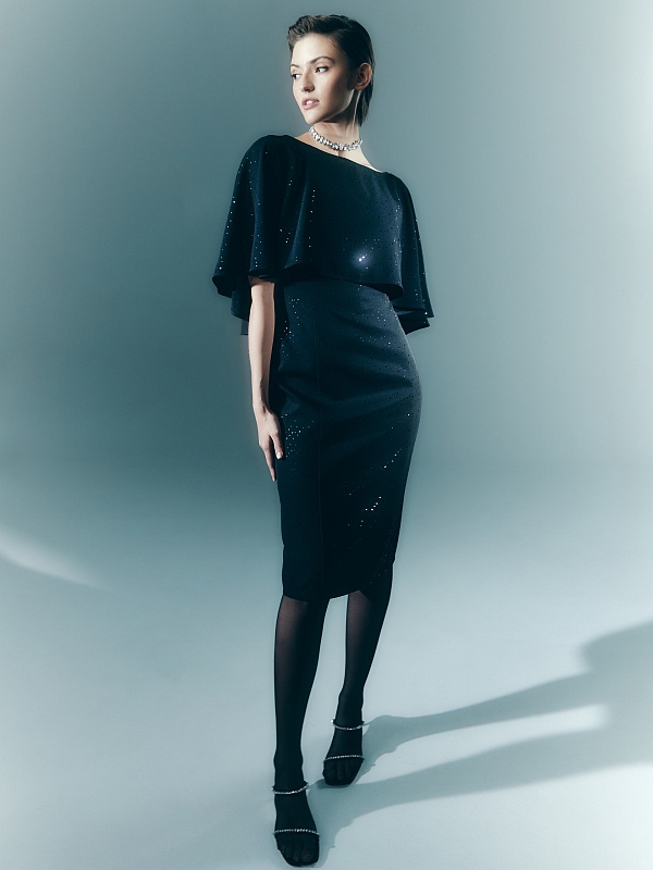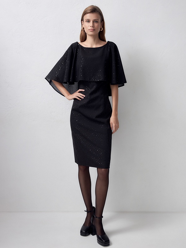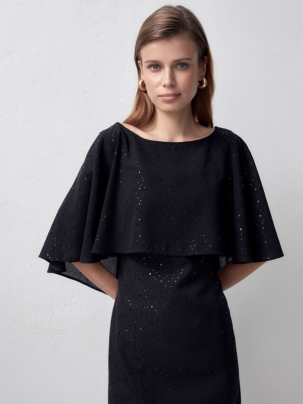 Платье-футляр на широких бретелях и квадратным вырезом из плательной ткани с металлизированным принтом. Платье с эффектом накидки из шифоновой ткани. На спинке углубленный вырез, застежка на потайную молнию.