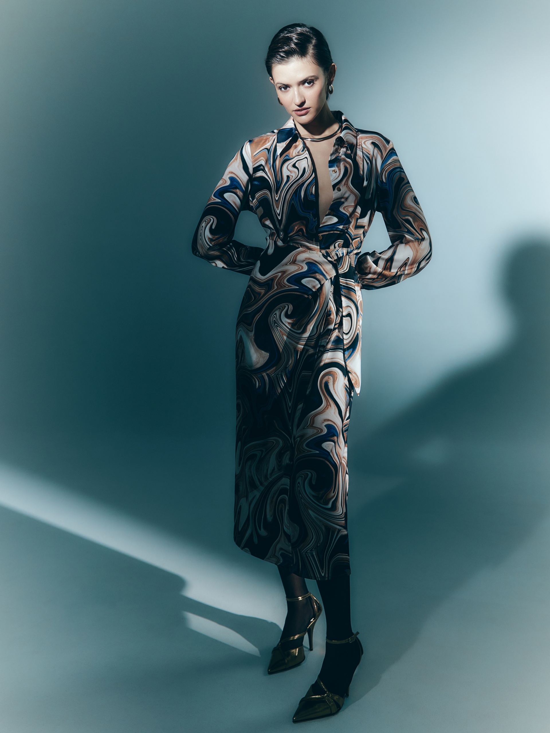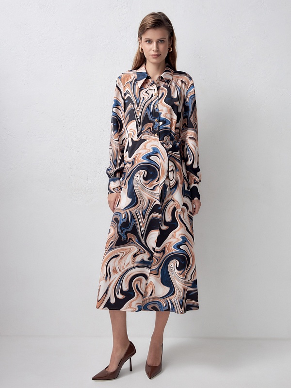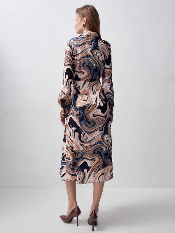 Полуприлегающее платье с эффектом запаха на пуговицах, выполненное из плательной ткани с акцентным принтом. Платье с отложным воротником и классическим втачным рукавом на манжете. Отлично подойдет для вечерних образов.