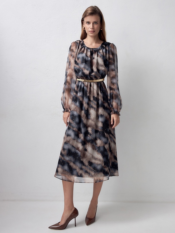 Прямое платье с резинкой по талии и круглым вырезом со складкой по горловине. Платье выполнено из плательной ткани с металлизированным принтом. Втачной рукав со сборкой по окату и резинкой-жилкой по низу. В комплекте идет пояс из экокожи.