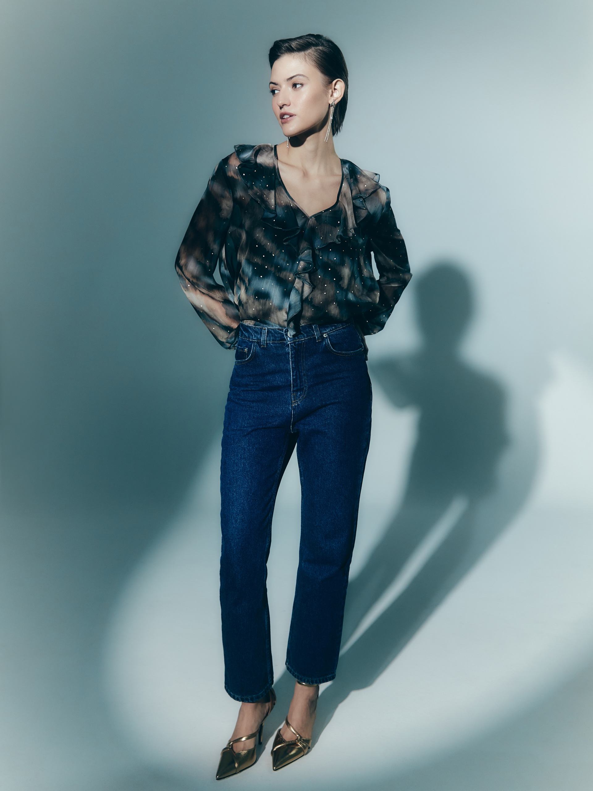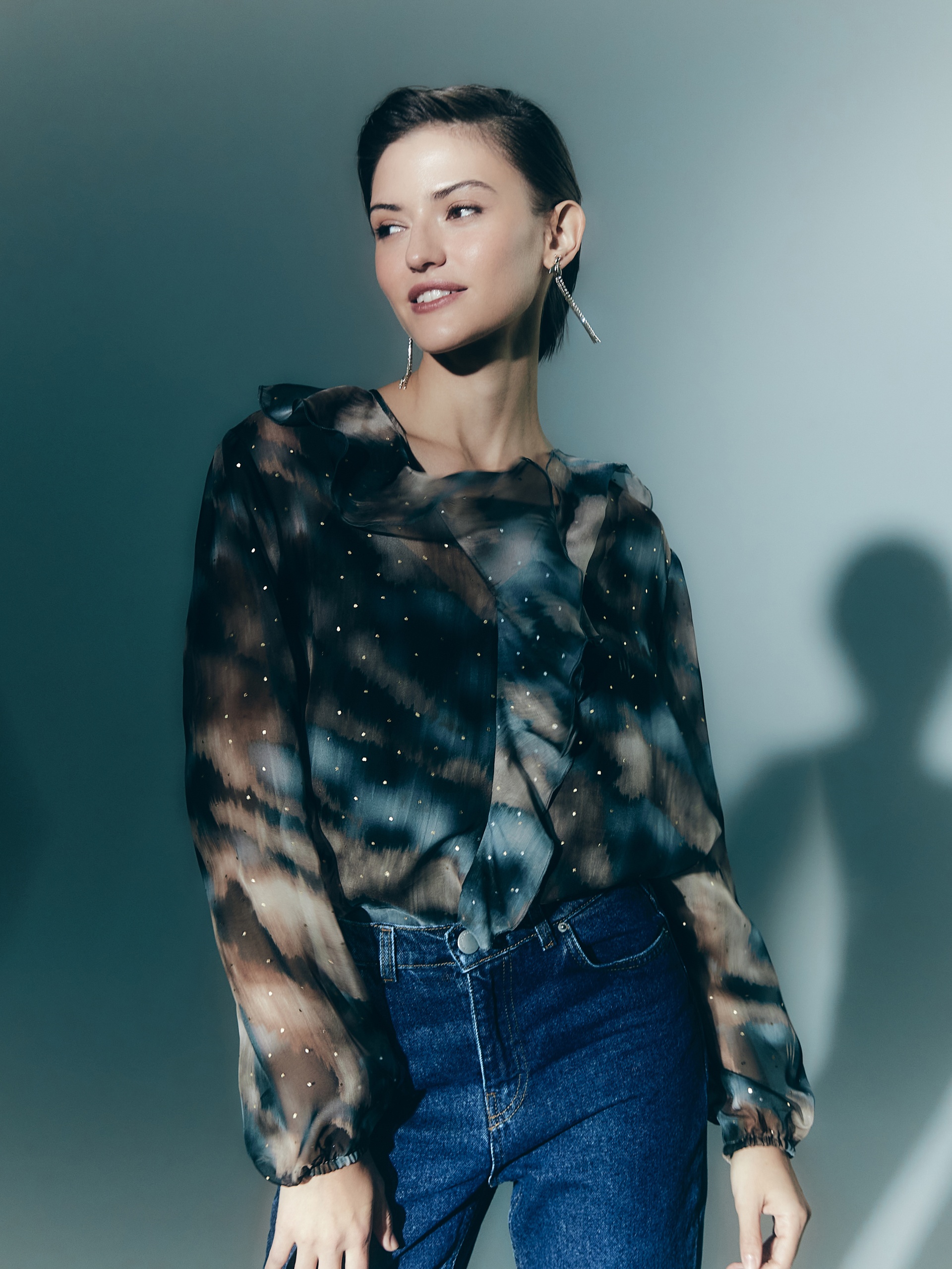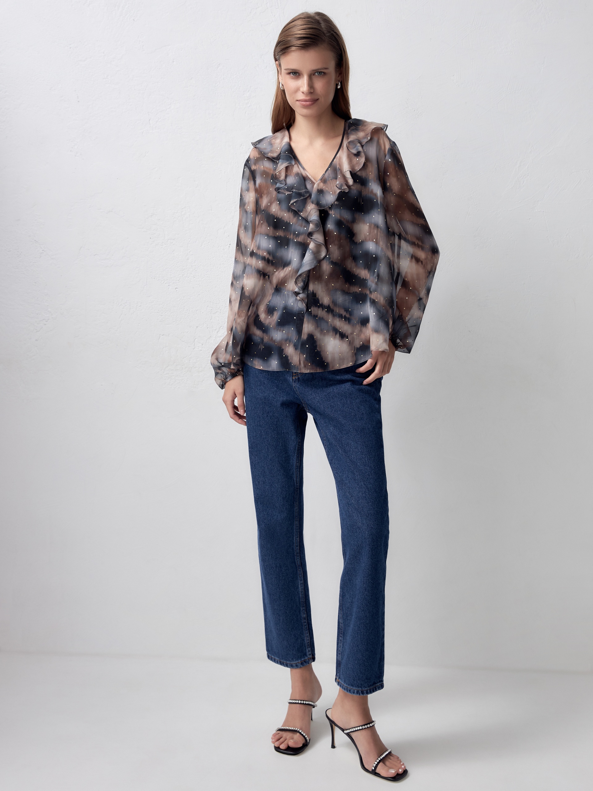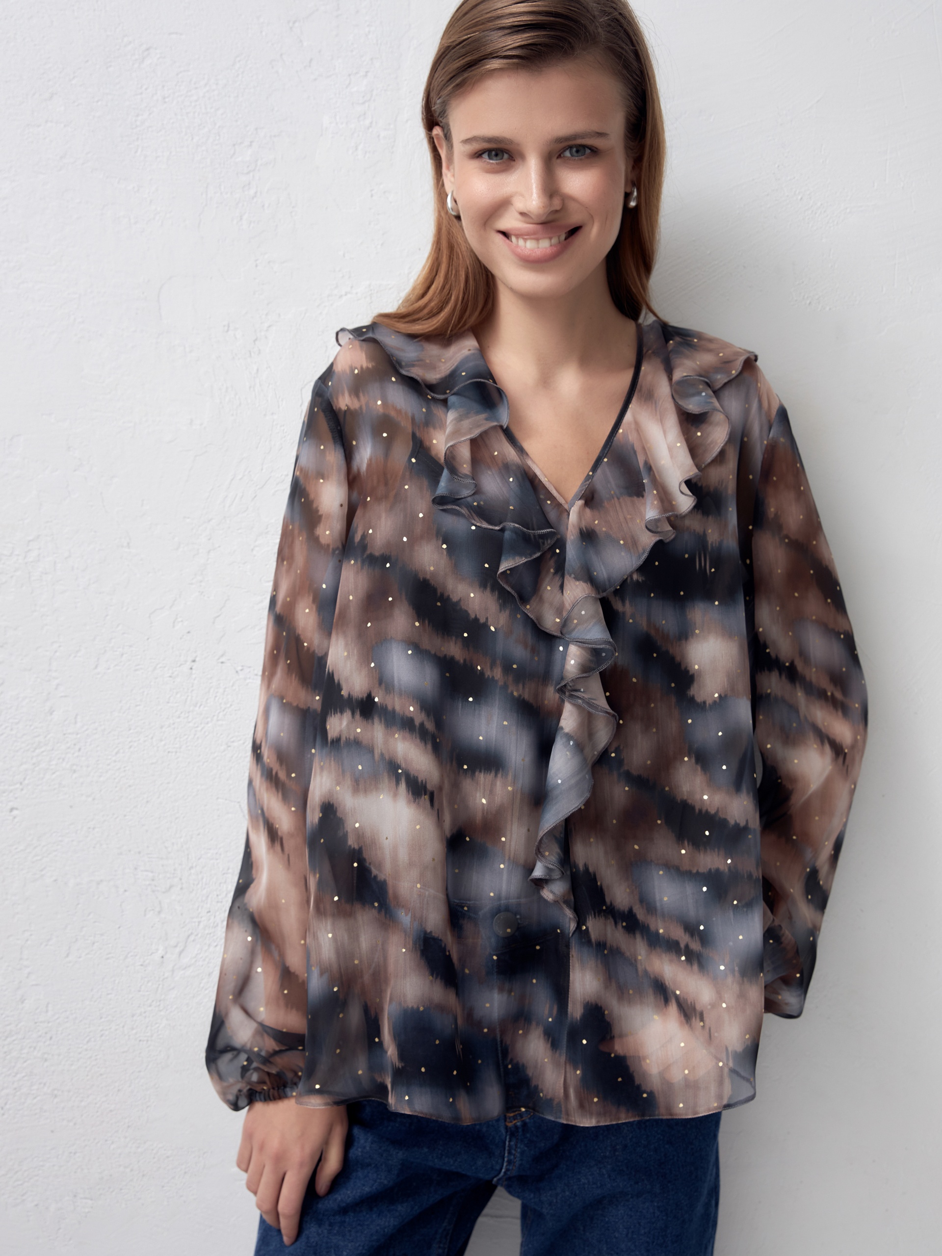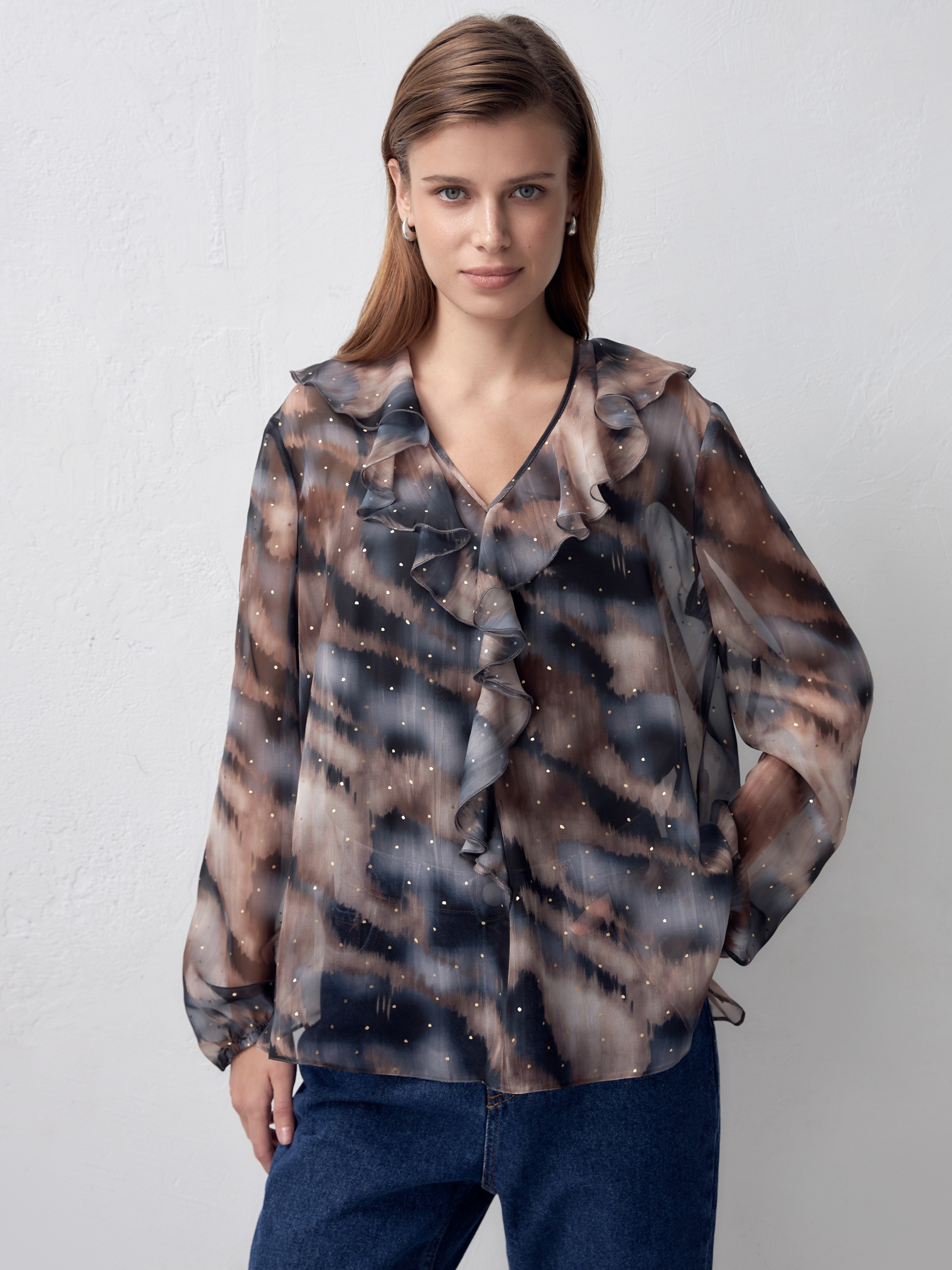 Блуза в романтическом стиле прямого силуэта. V-образный вырез горловины и воротник-рюша, переходящий в центральный шов переда. Рукав втачной на манжете, полной длины. На спинке кокетка со сборкой. Отлично подойдет для вечерних образов....