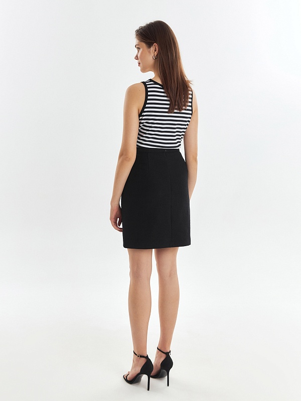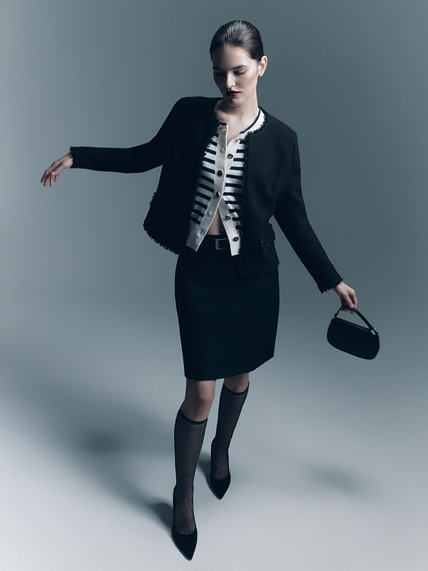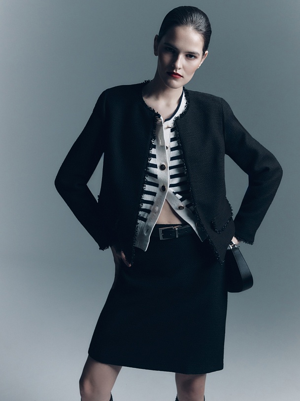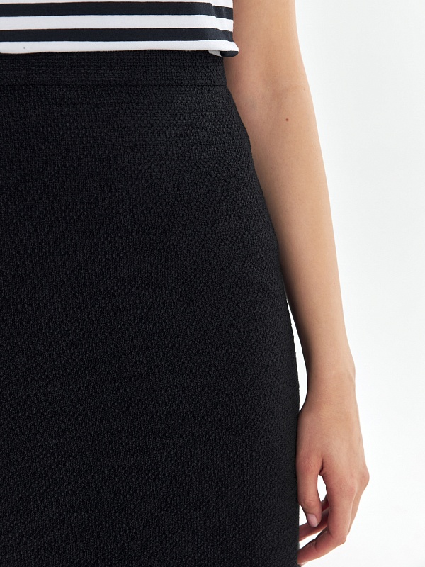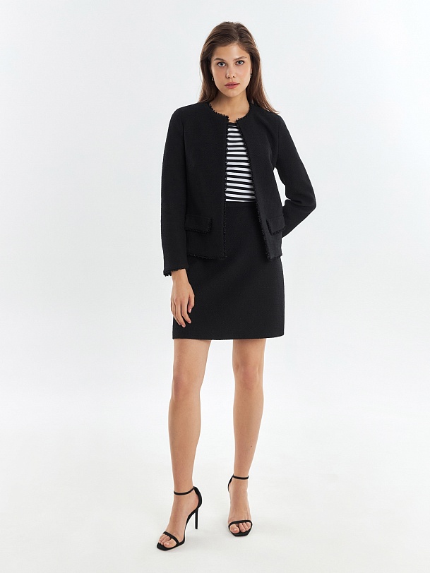 Мини-юбка из буклированной хлопковой ткани в черном цвете отличается элегантным, слегка расклешенным силуэтом. Мини-юбку можно носить с жакетом из одной ткани или миксовать ее с однотонными жакетами.