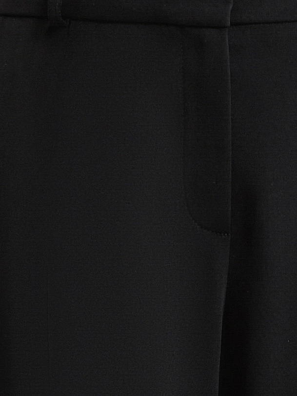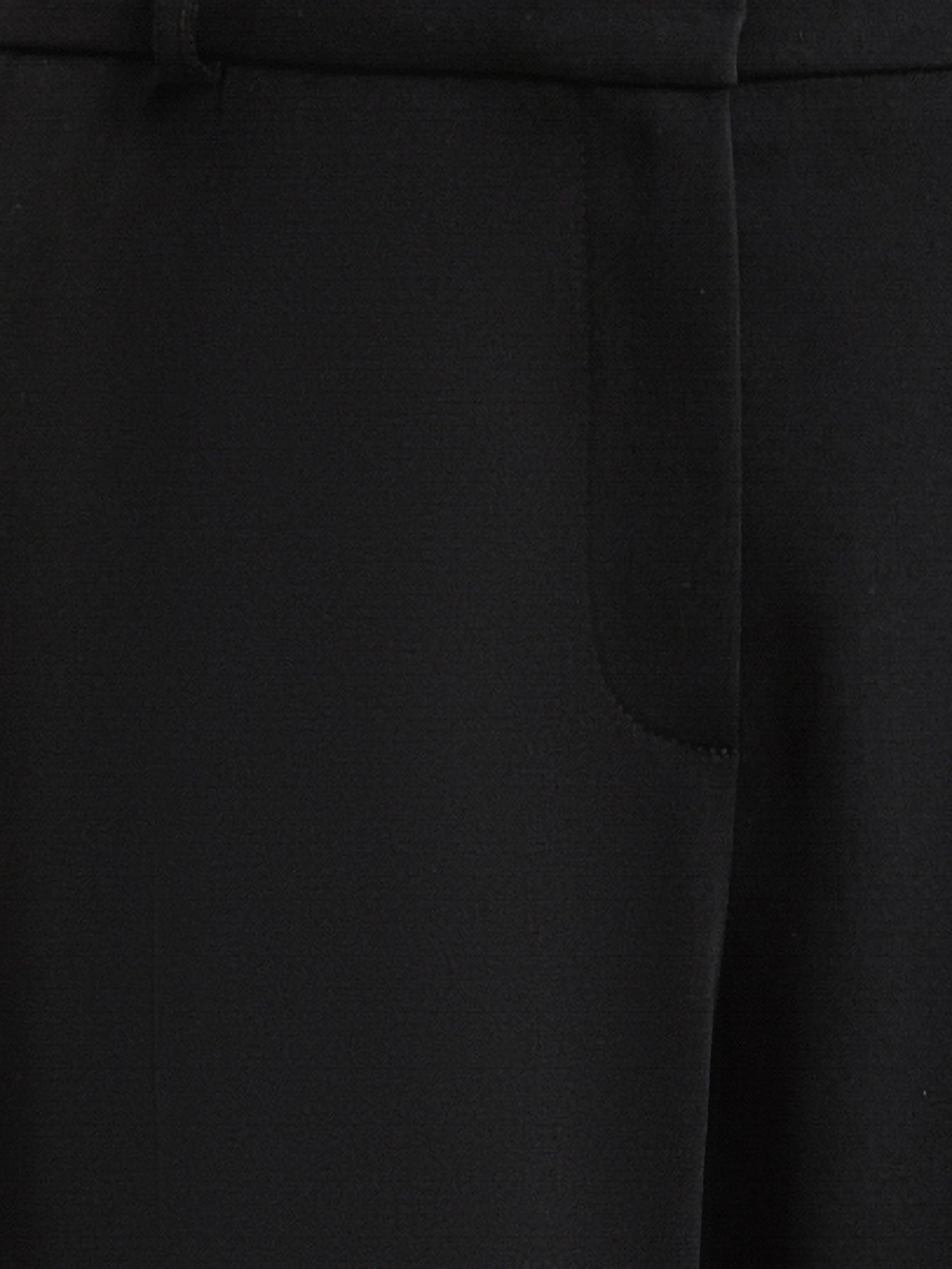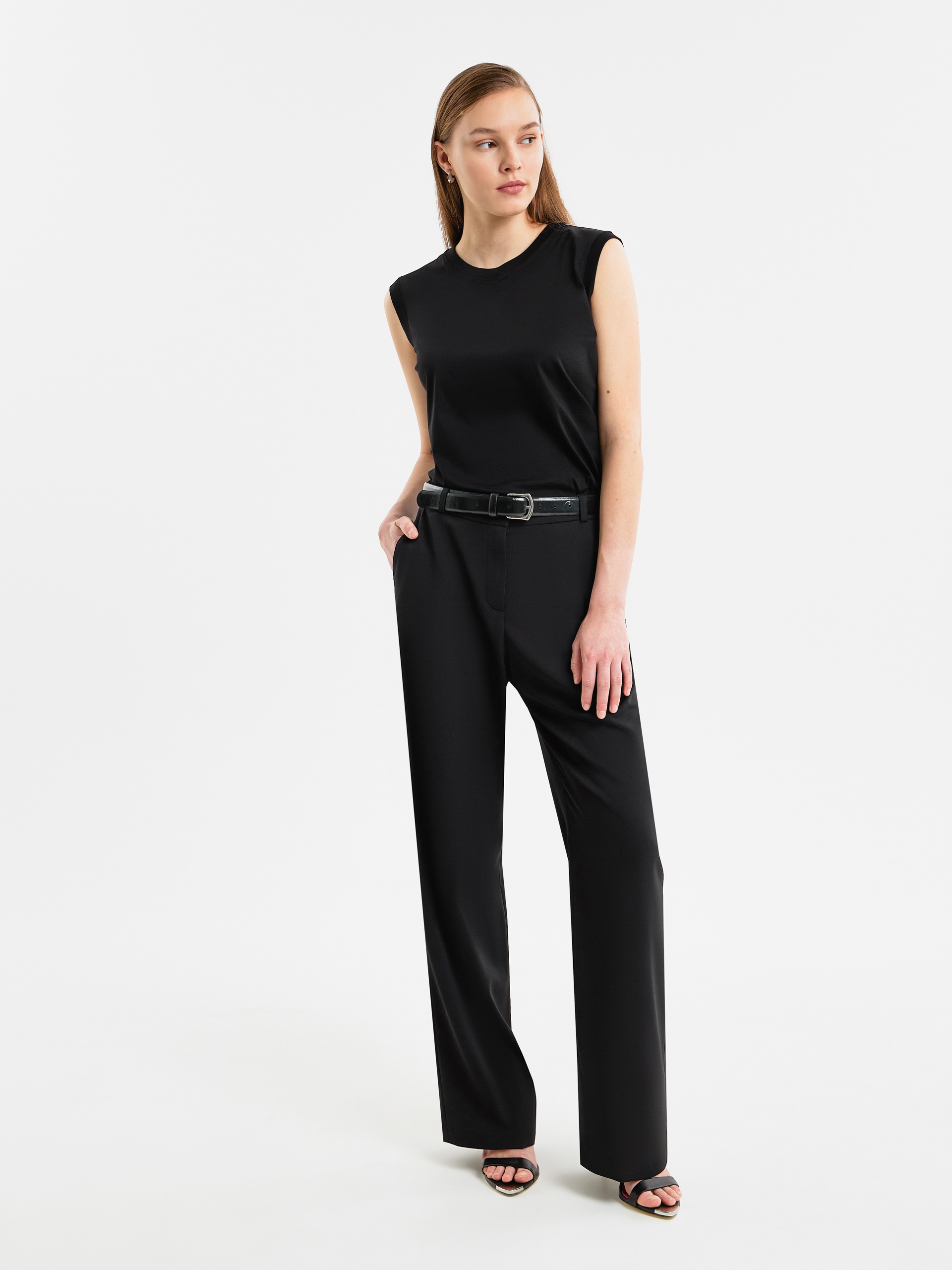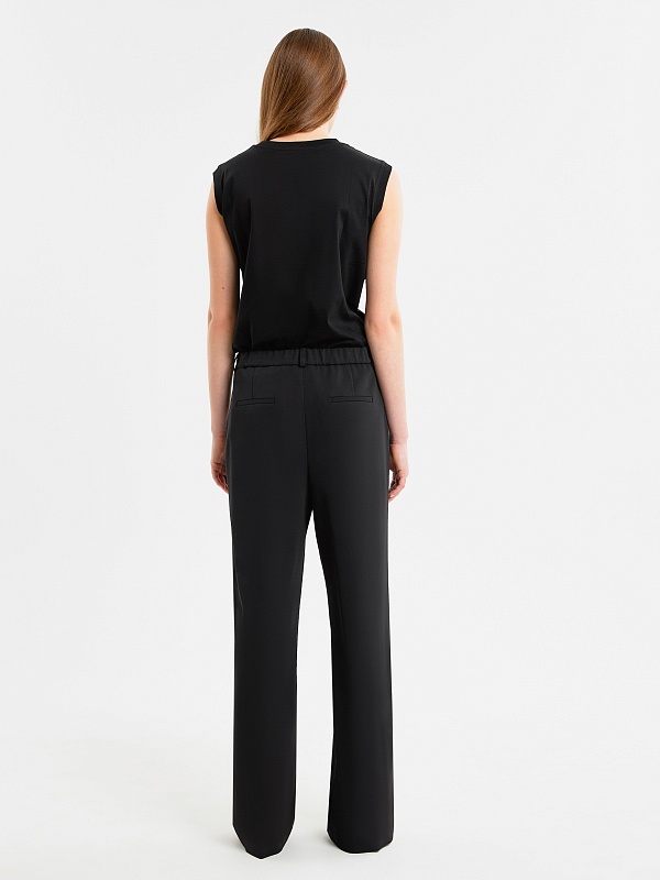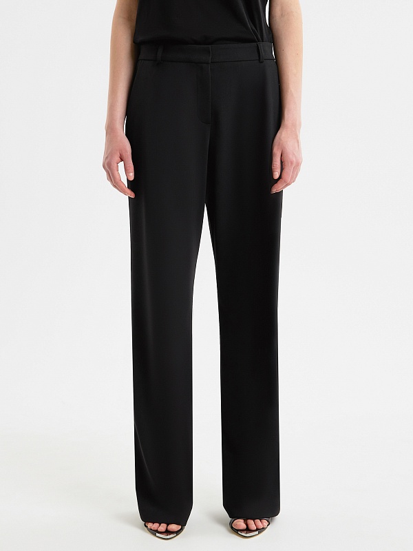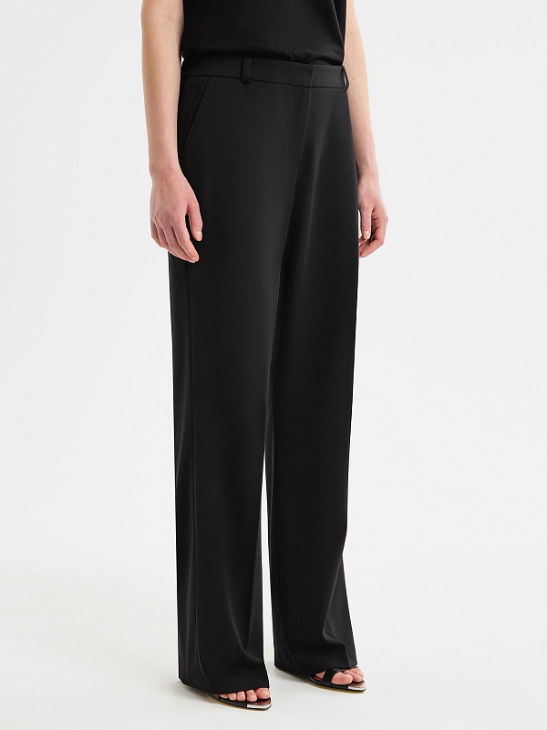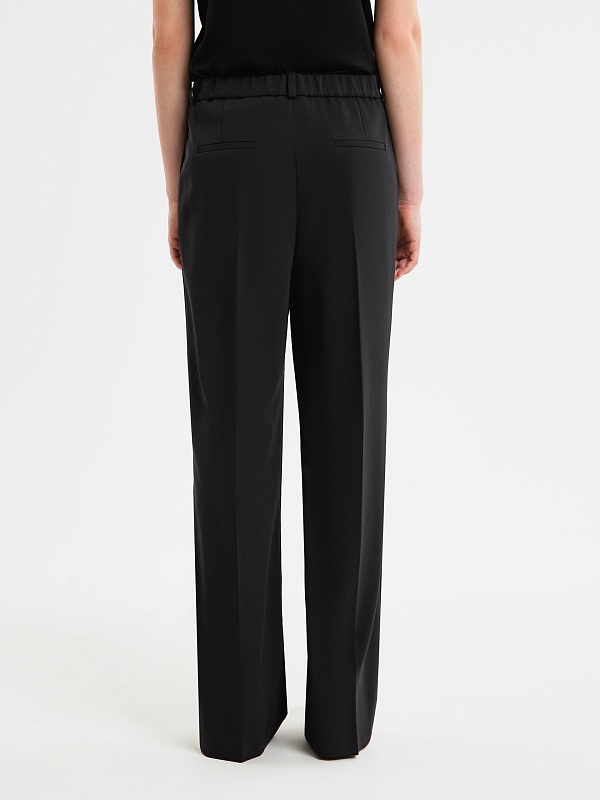Стильные широкие брюки прямого струящегося силуэта из мягкой костюмной ткани, со складками, на притачном поясе с резинкой на спинке и шлевками. Застежка спереди на молнию, пуговицу и крючок. Карманы рабочие в боковых швах.