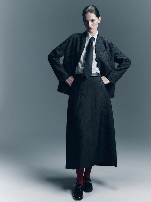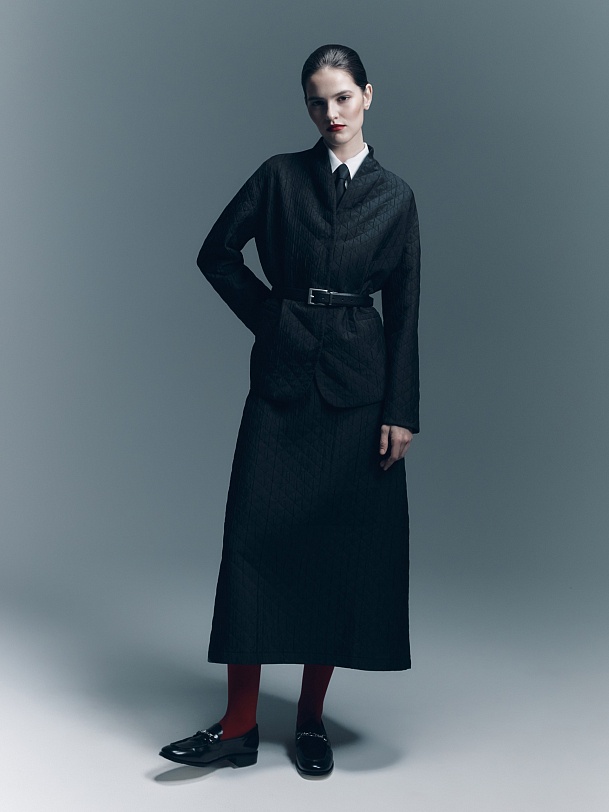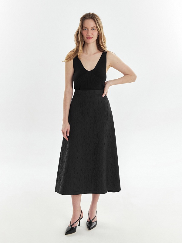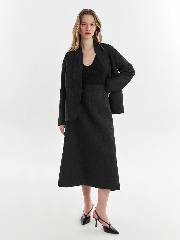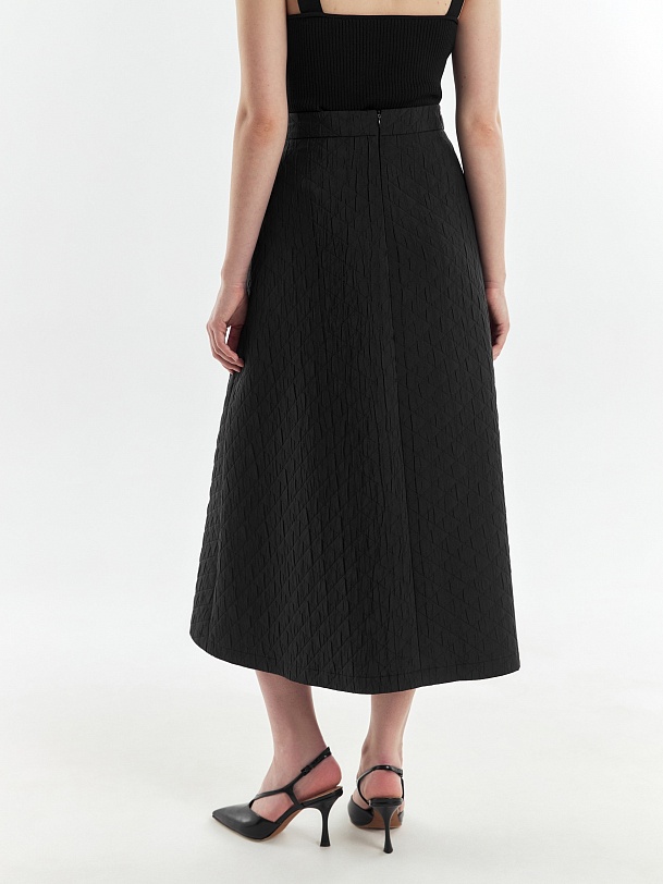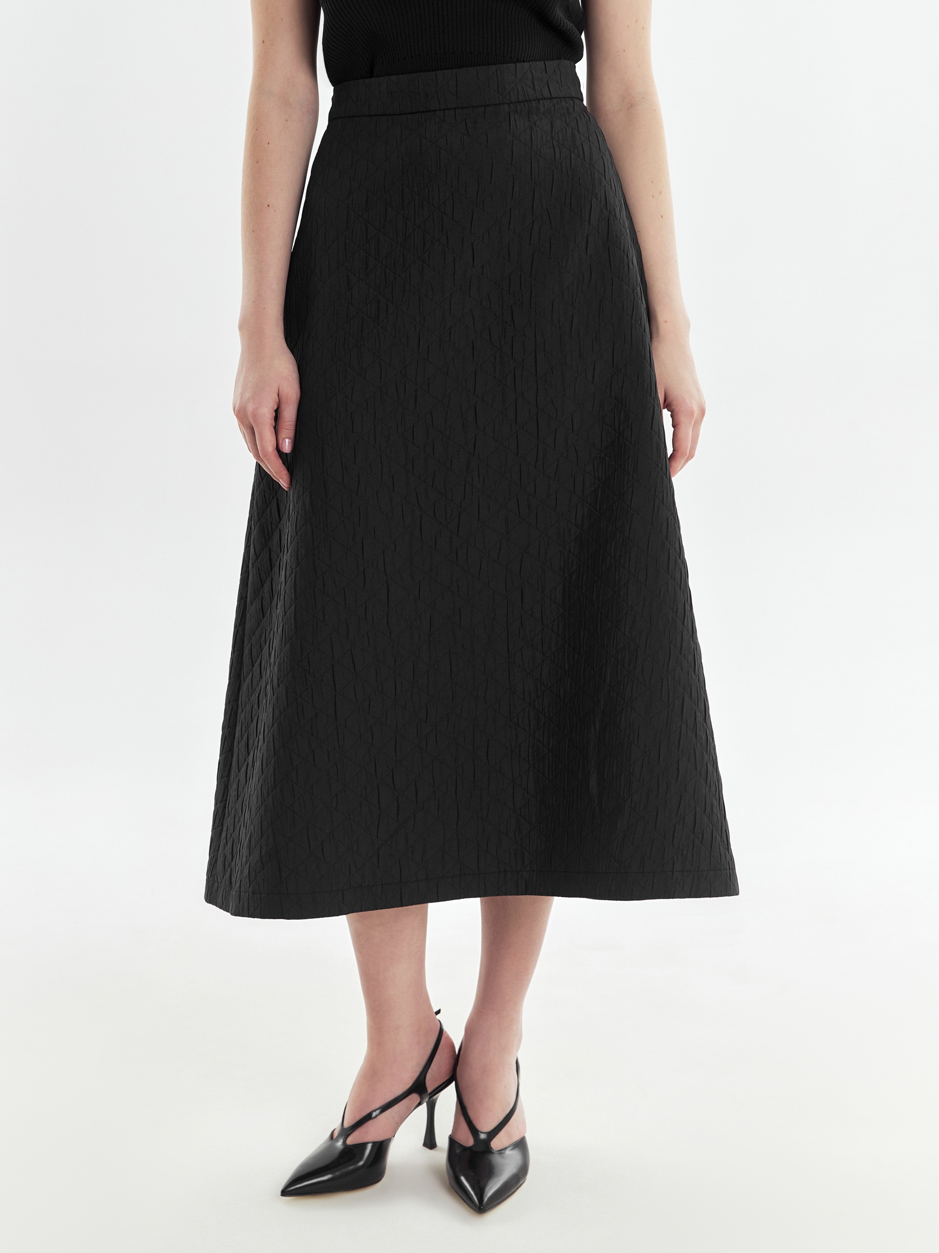 Юбка миди силуэта колокол на притачном поясе из стеганой ткани в черном цвете. Станет трендовым акцентом в вашем гардеробе!