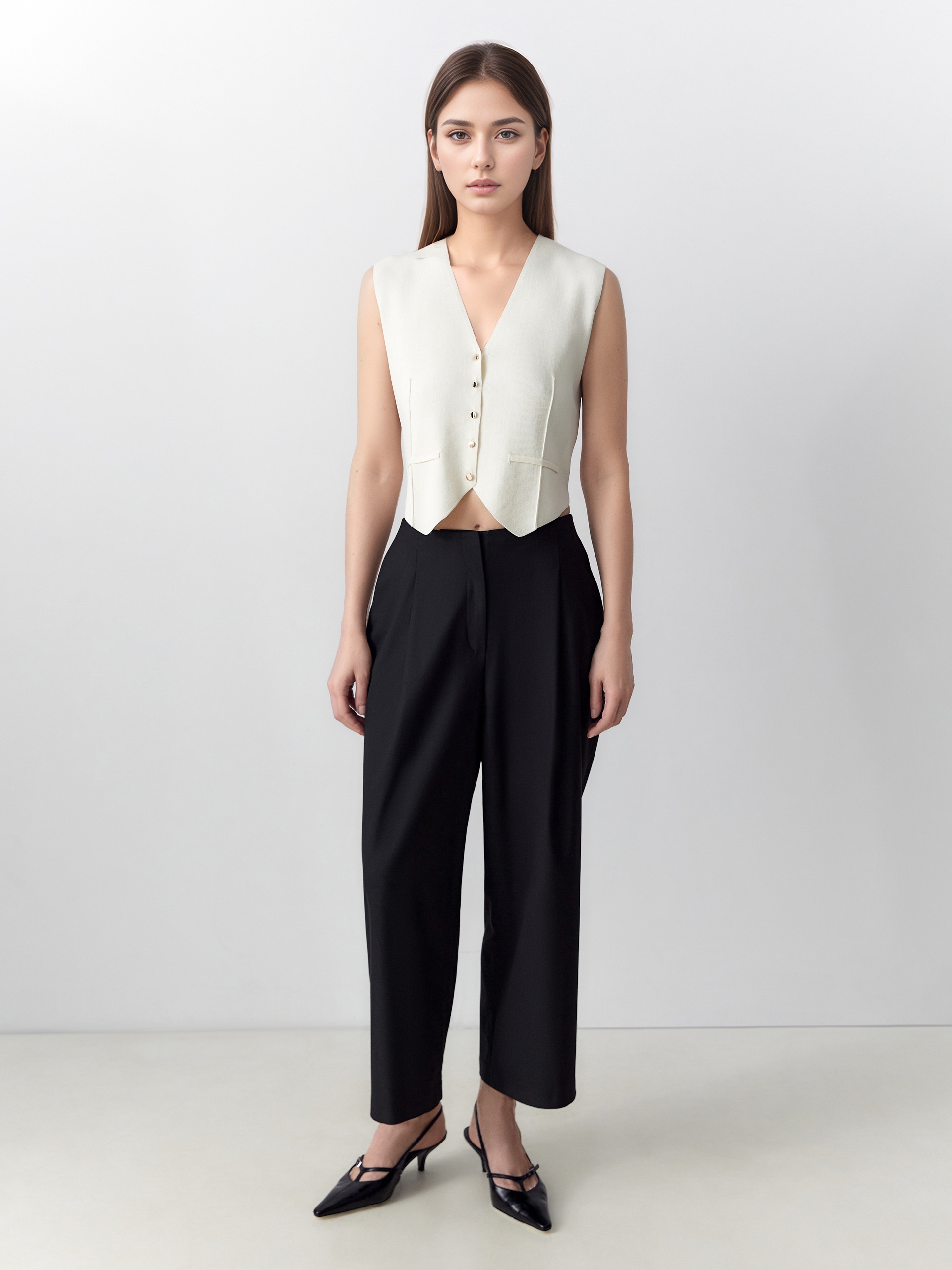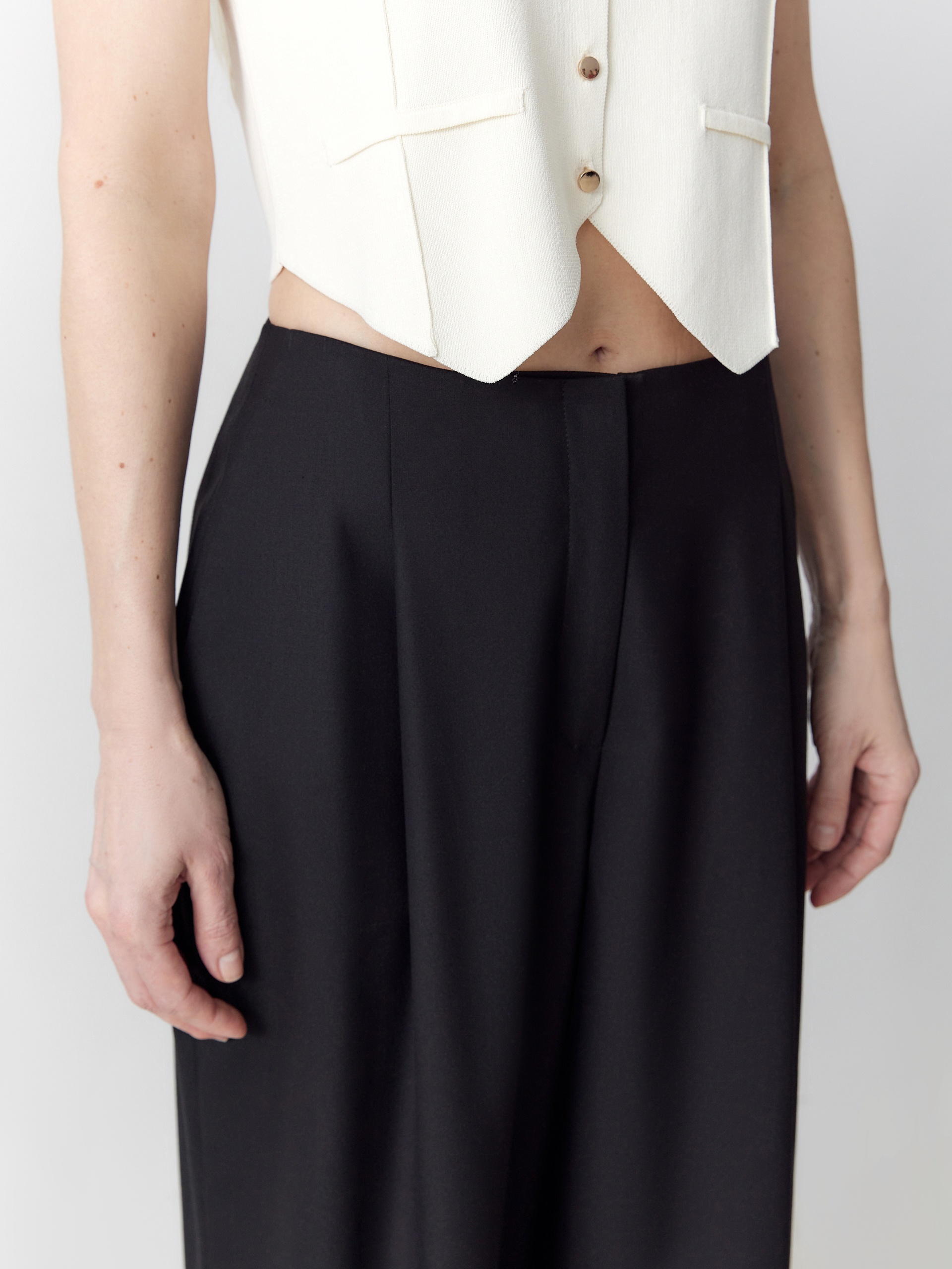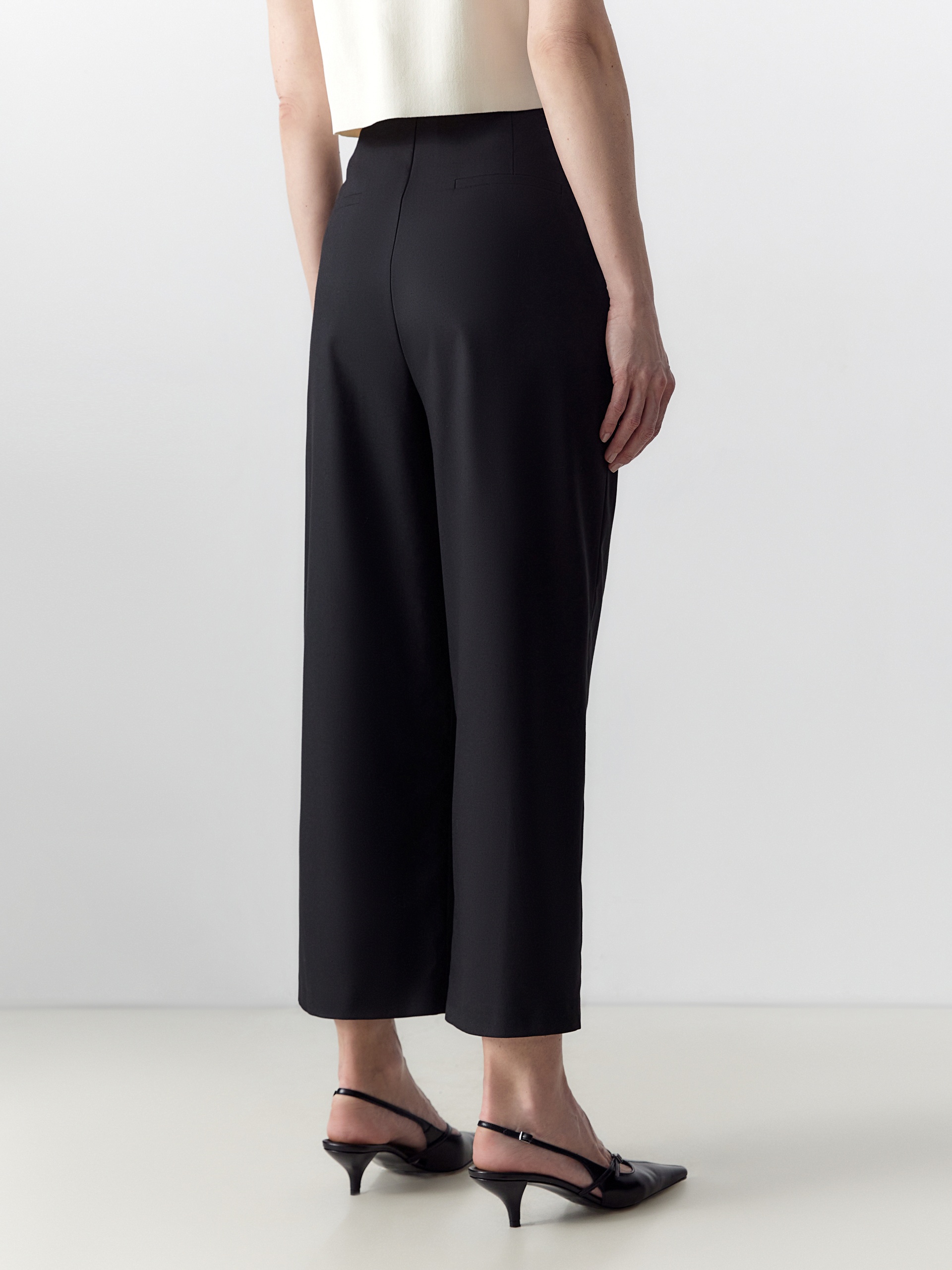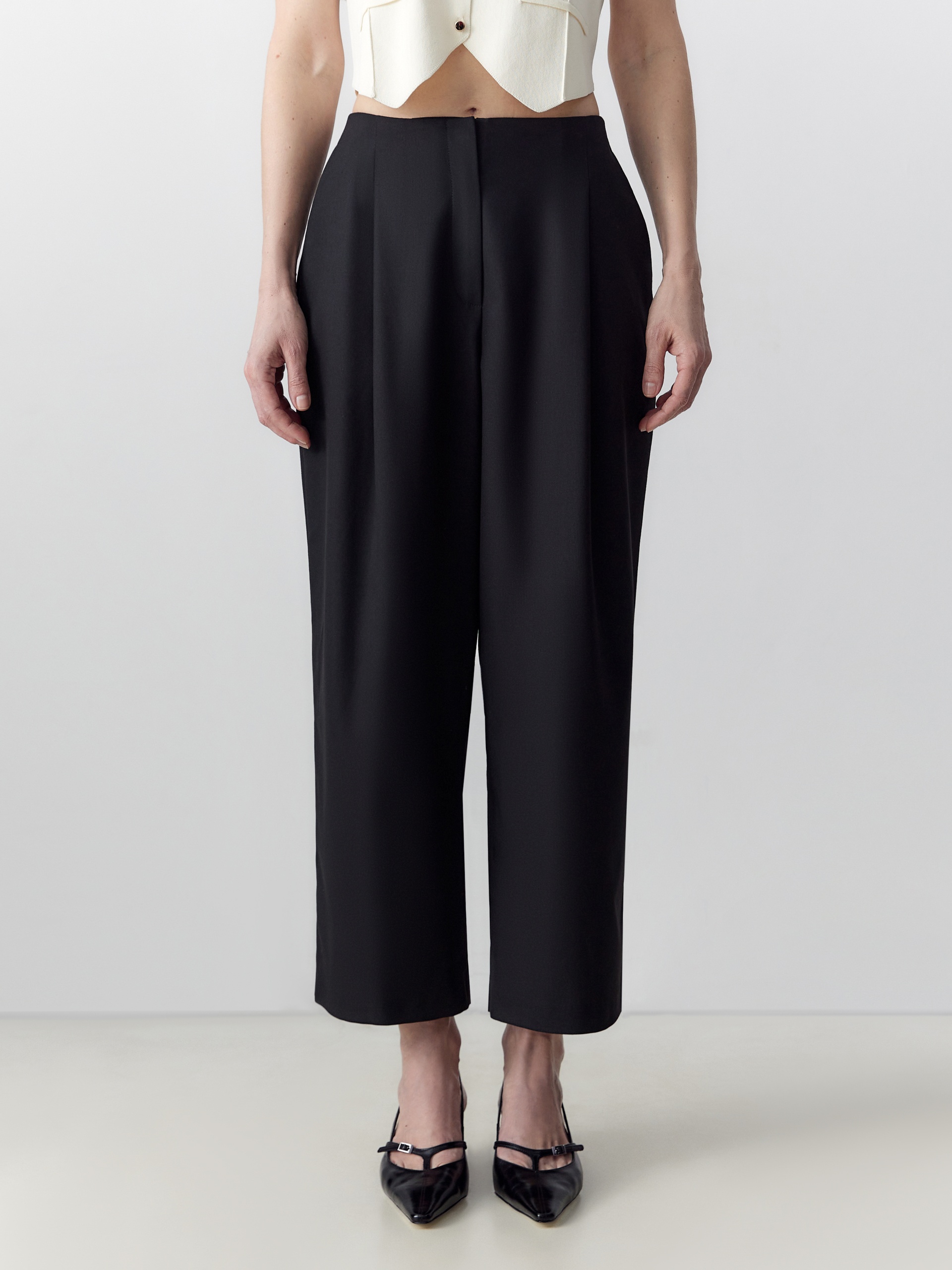 Фантазийные брюки из вискозной костюмной ткани прямого силуэта, длина 7/8. Высокая посадка. Спереди глубокие складки. Застежка на молнию и крючок. Боковые карманы рабочие.
