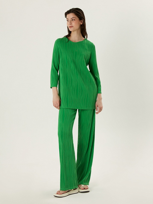 Туника из фактурного яркого трикотажного полотна, прямого силуэта, слегка спущенный рукав длиной 7/8. В комплекте с брюками из того же трикотажа становится ярким трендовым и привлекающим взгляд тандемом.