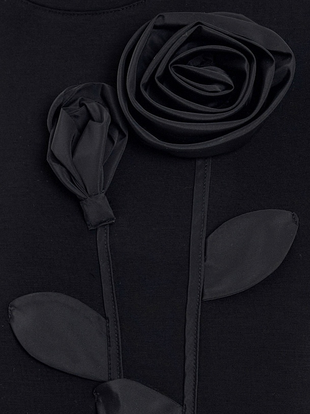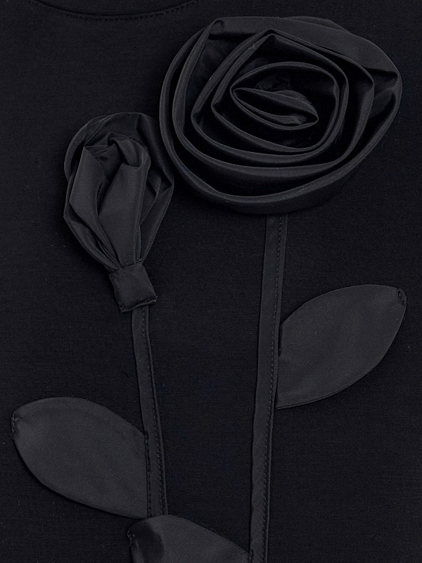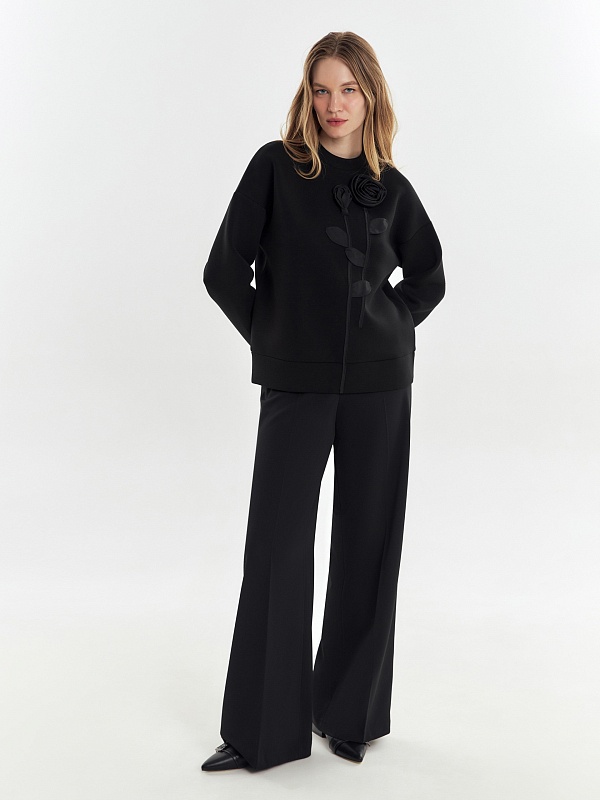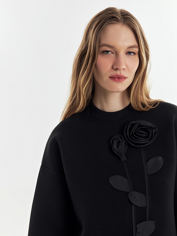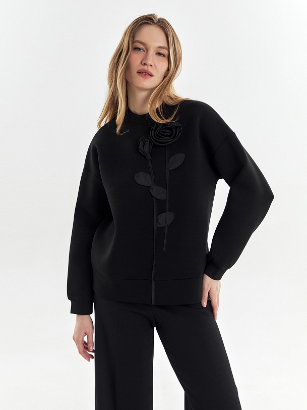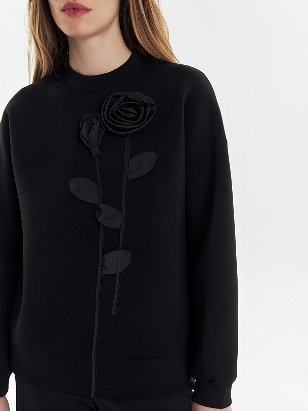 Эффектный и мягкий трикотажный джемпер свободного силуэта, с круглой горловиной, спущенной линией рукава. Украшен аппликацией в виде цветочной композиции из ткани с матовым блеском.