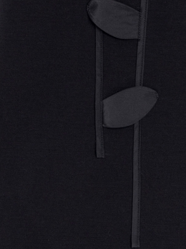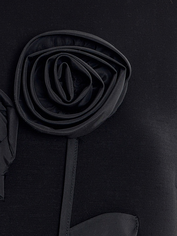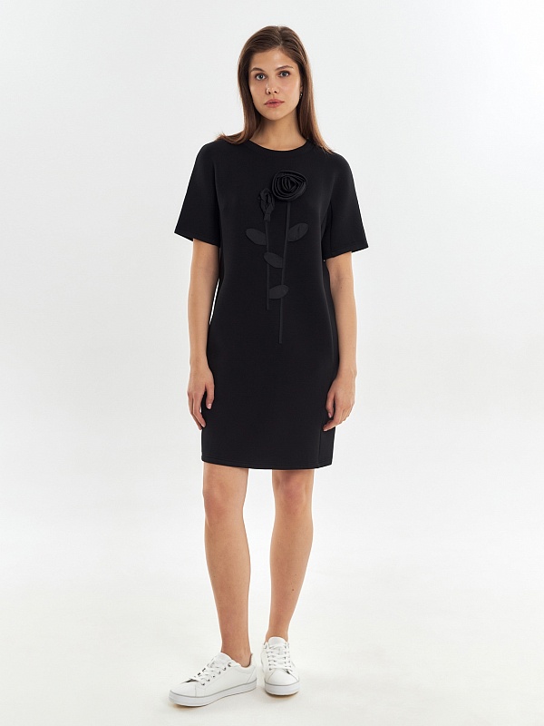 Платье прямого силуэта из мягкого трикотажа, длиной до колена, рукав цельнокроеный и укороченный. Платье украшено аппликацией в виде цветочной композиции из ткани с матовым блеском.