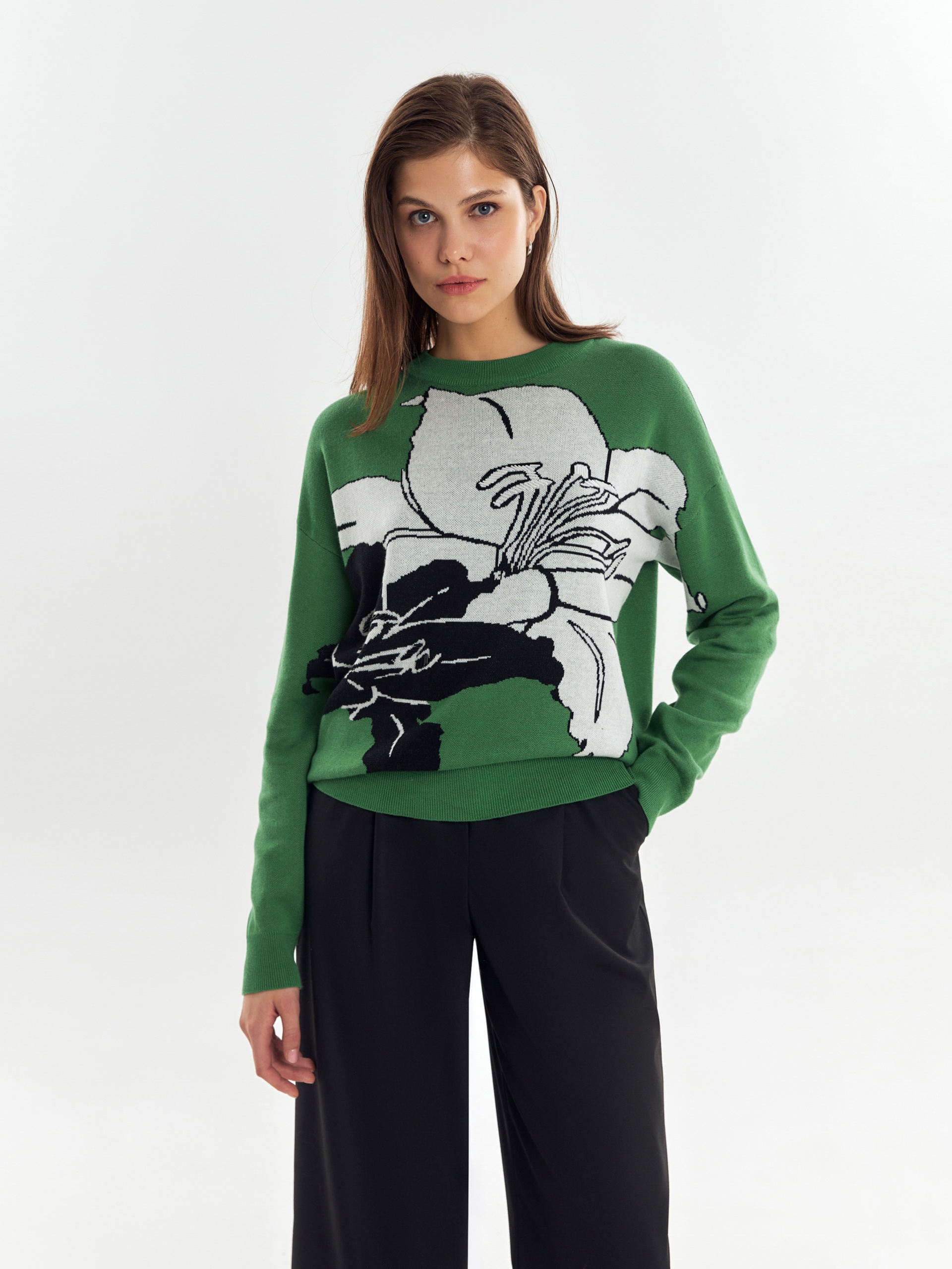 Жаккардовый джемпер с контрастным цветочным мотивом по всему изделию станет вашим теплым спутником не только предстоящей весной, но и в течение всего года!...