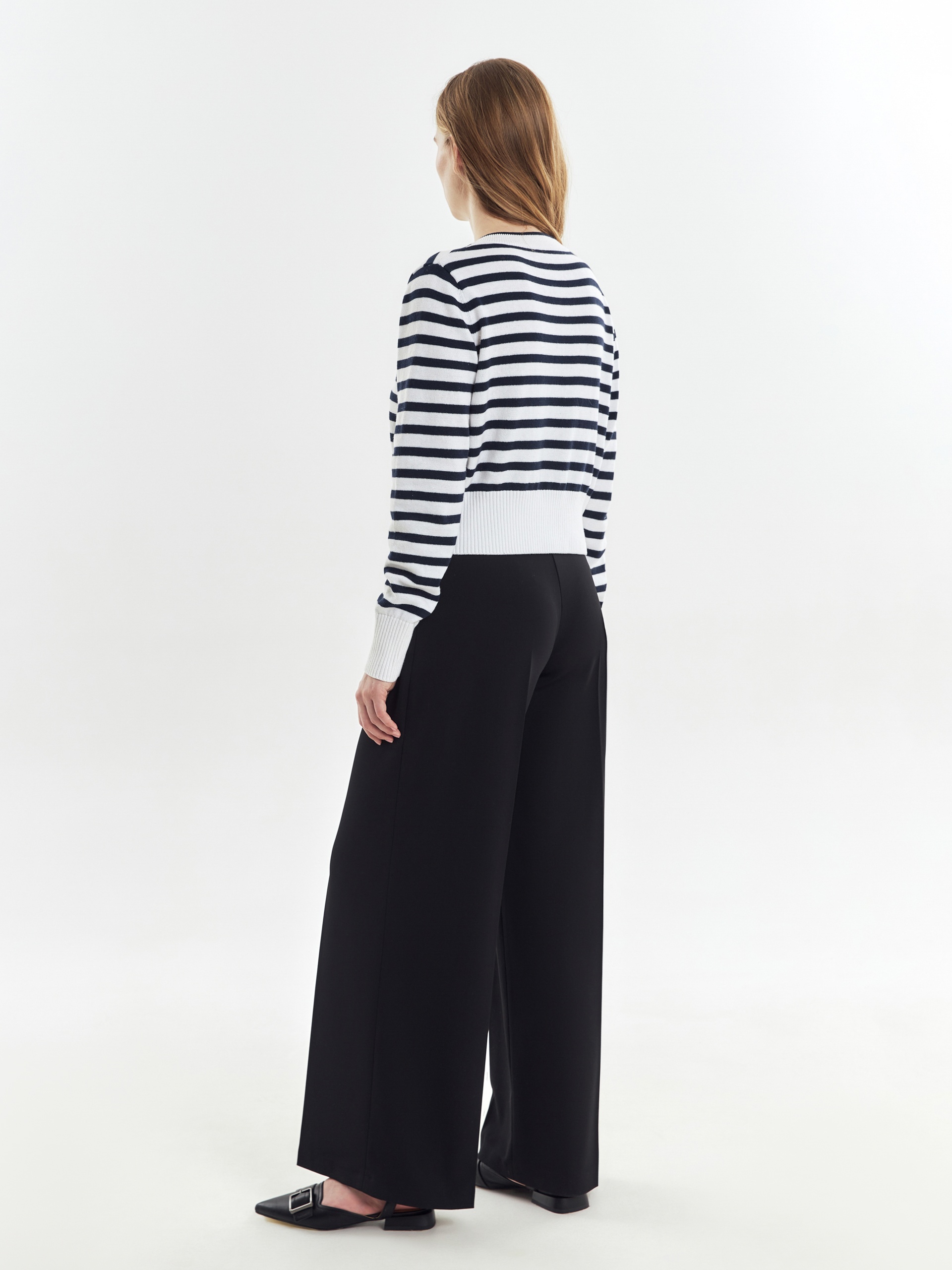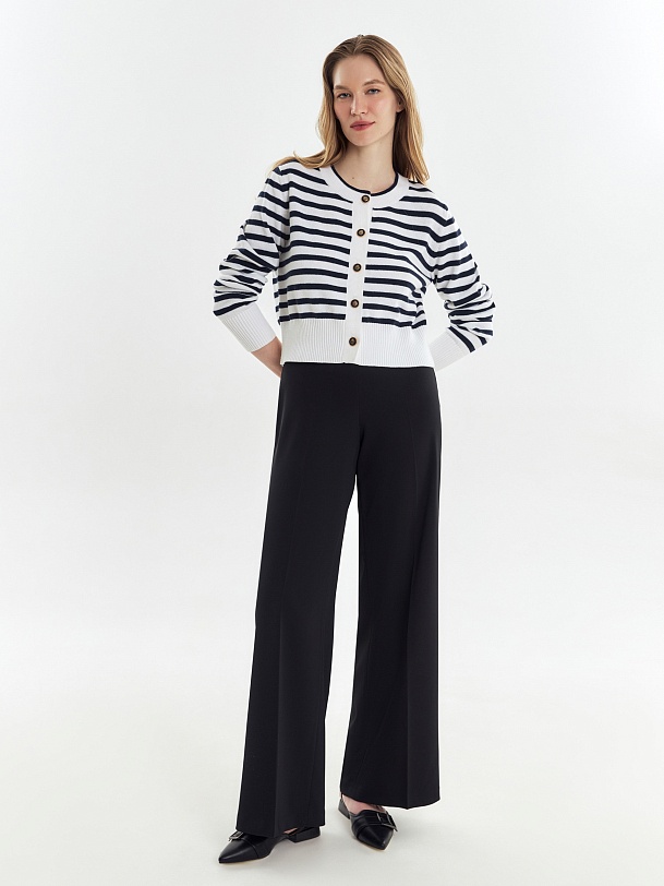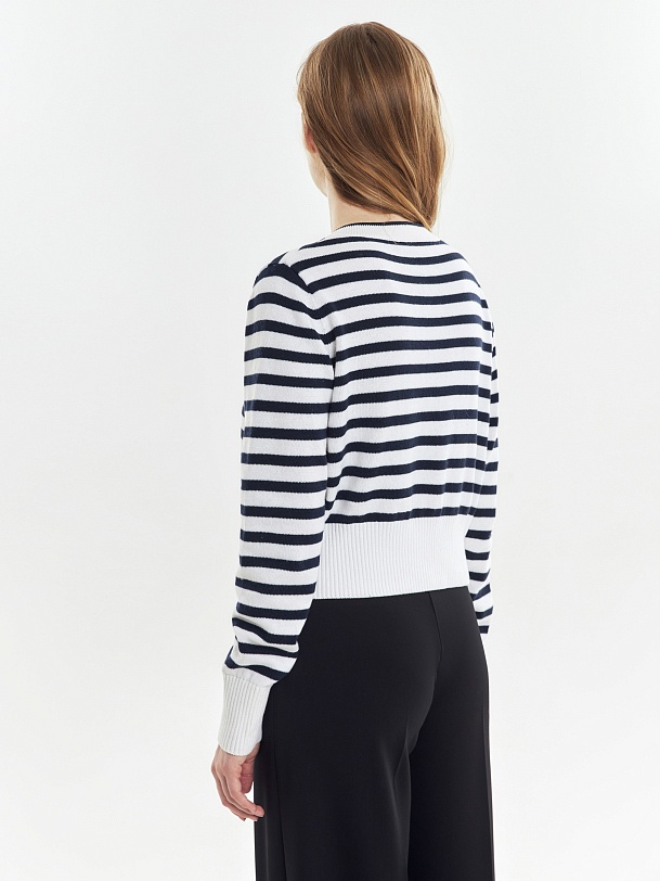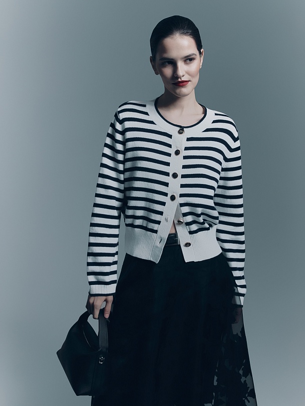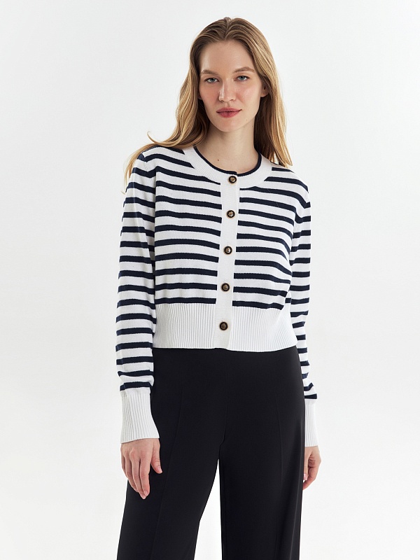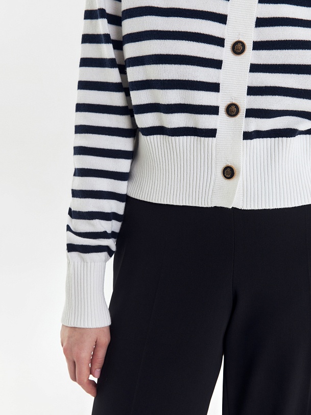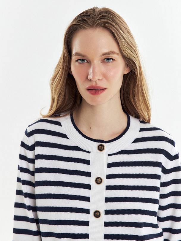 Свободный кардиган на пуговицах в бретонскую полоску будет незаменимым спутником прохладным летним вечером.