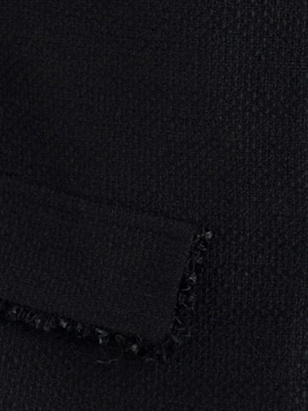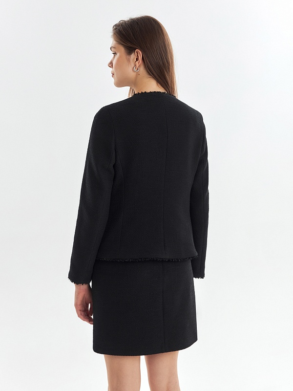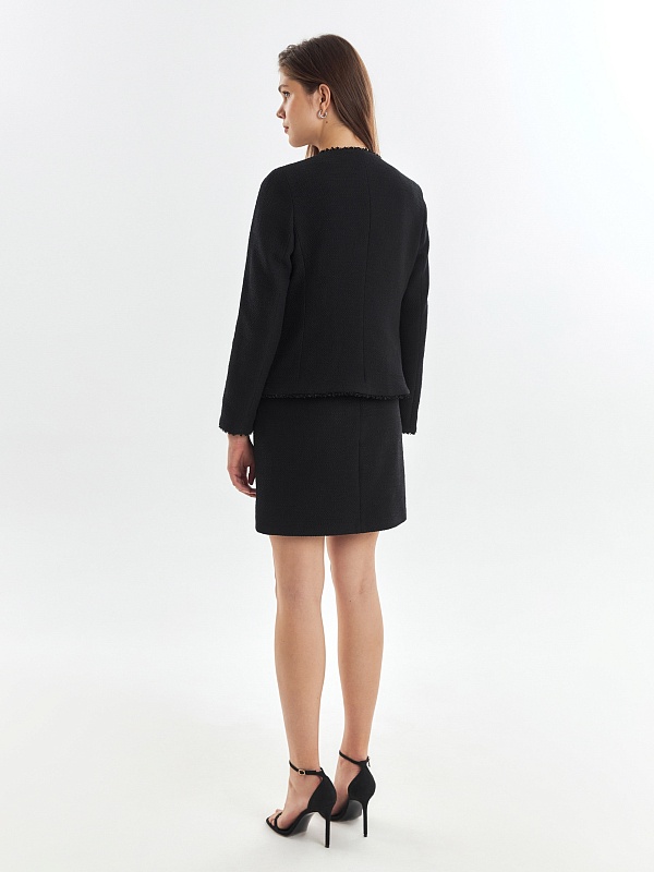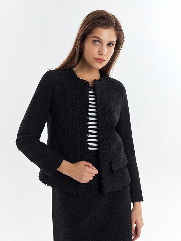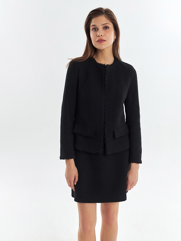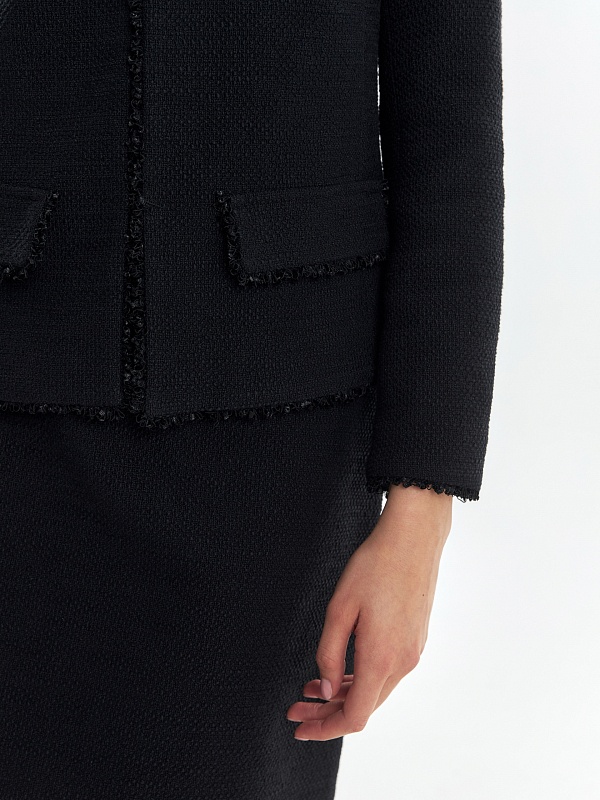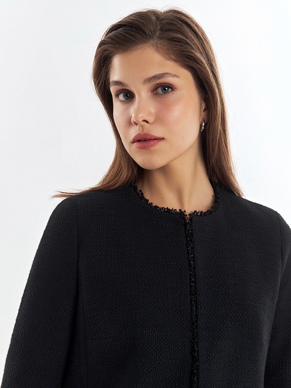 Прямой укороченный жакет из буклированной хлопковой ткани в черном цвете. Жакет с рельефами и прорезными карманами с клапанами. Горловина, борт, клапана и низ рукавов и жакета декорированы текстильной тесьмой. Жакет на крючках. Составит идеальный комплект с мини-юбкой из одной ткани, а также отлично подойдет к базовым белым джинсам.