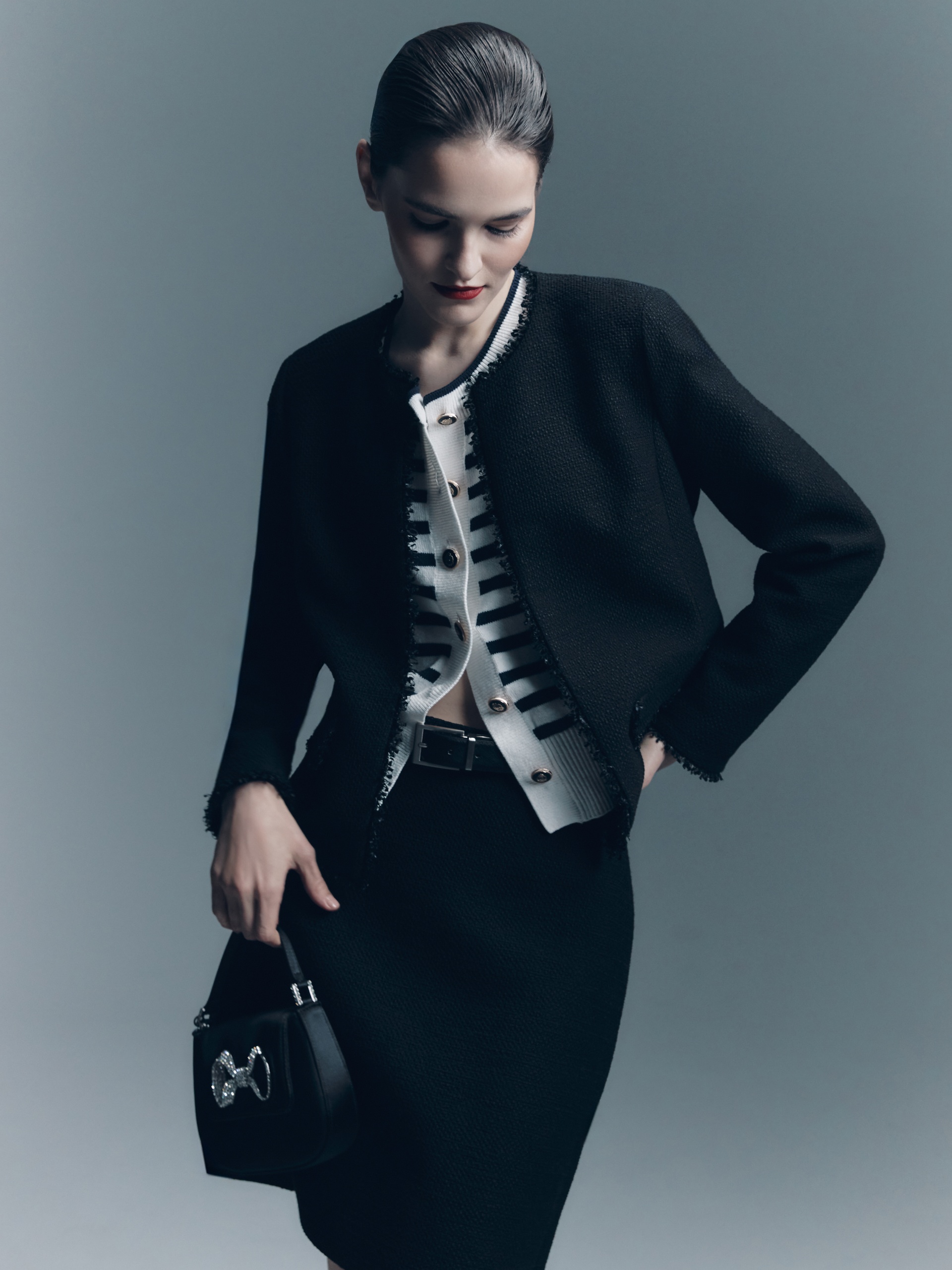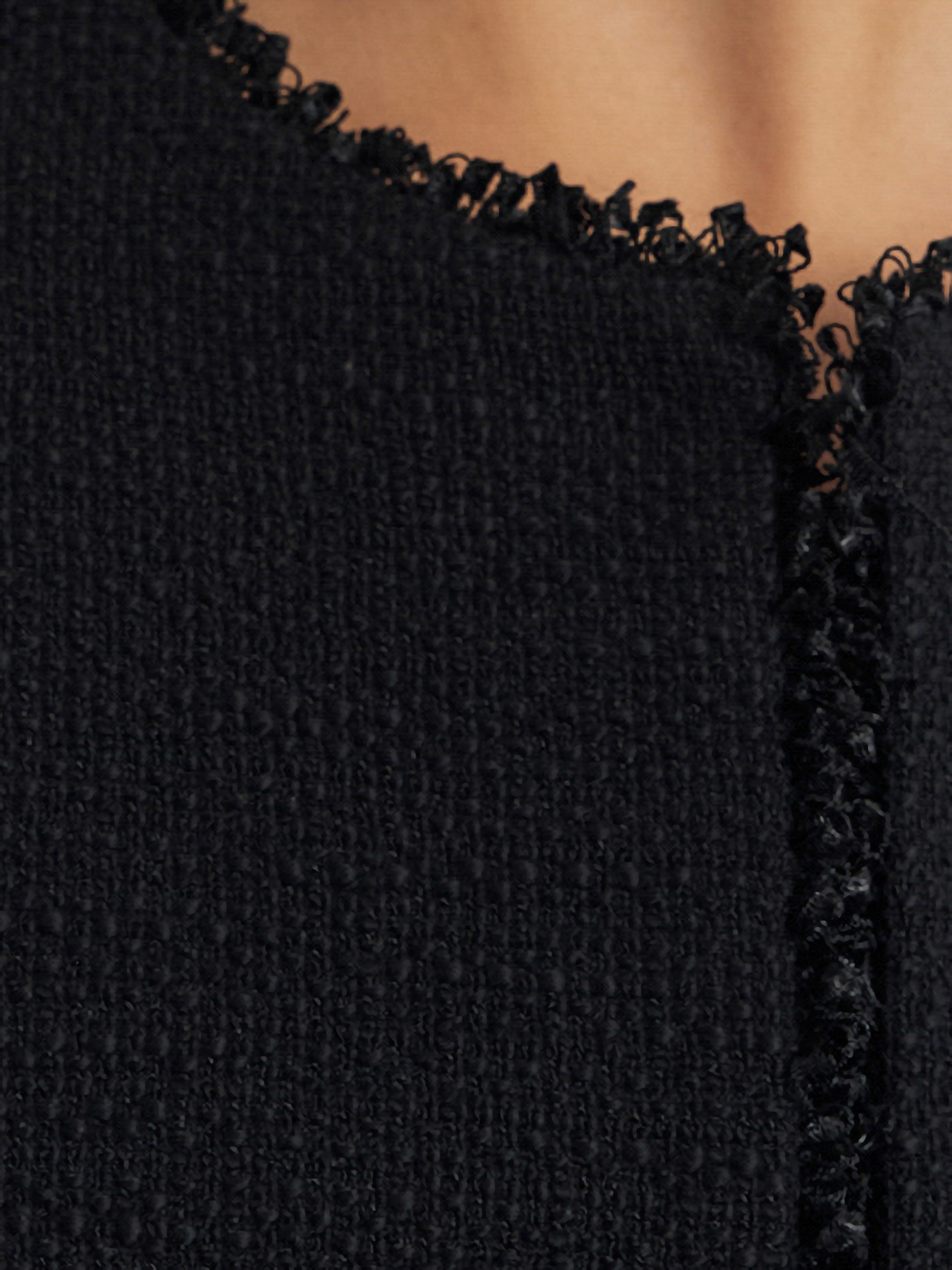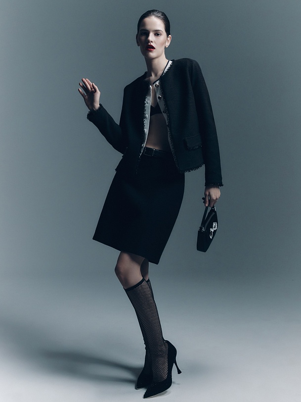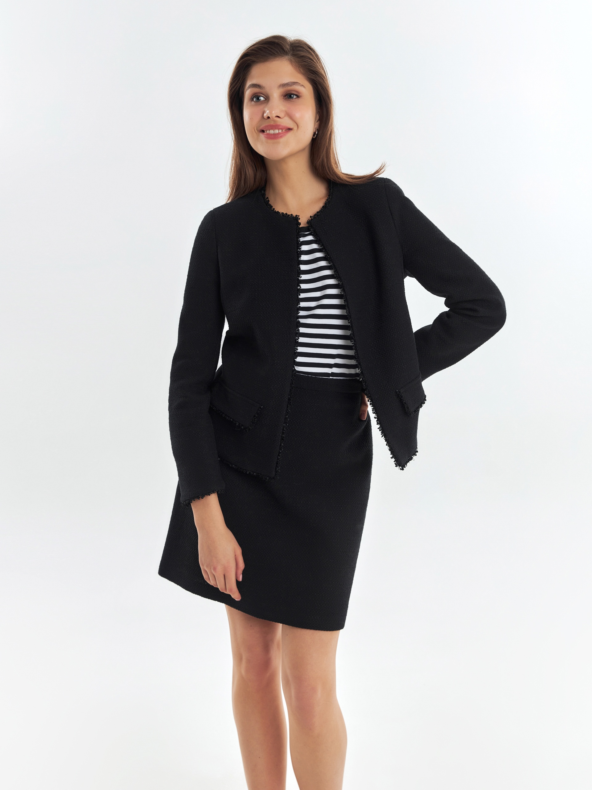 Прямой укороченный жакет из буклированной хлопковой ткани в черном цвете. Жакет с рельефами и прорезными карманами с клапанами. Горловина, борт, клапана и низ рукавов и жакета декорированы текстильной тесьмой. Жакет на крючках. Составит идеальный комплект с мини-юбкой из одной ткани, а также отлично подойдет к базовым белым джинсам.