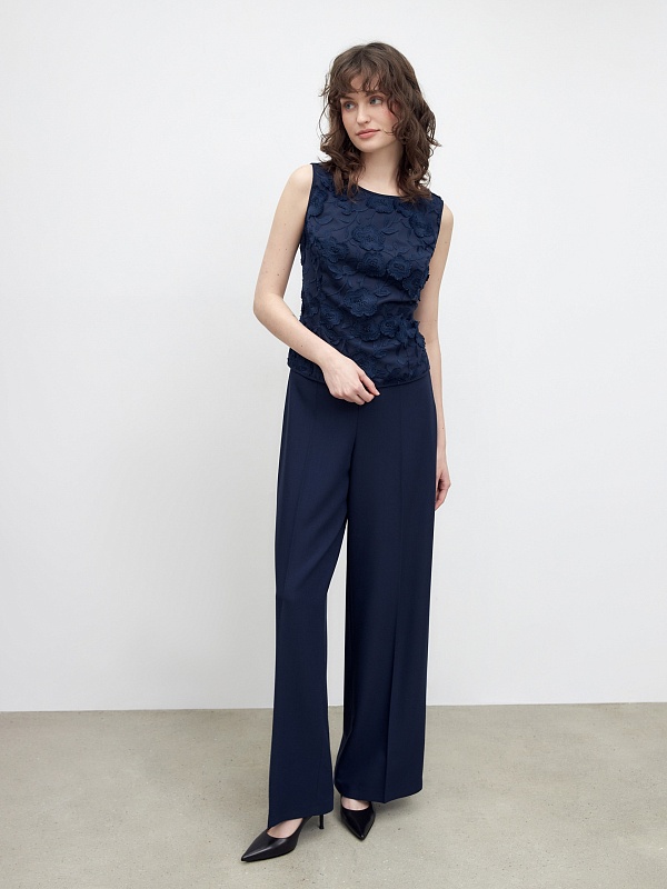 Прилегающая блуза с круглой горловиной и потайной молнией на спинке, блуза выполнена из изящного кружева на подкладке темно-синего цвета. Составит трендовый вечерний образ с широкими брюками одного цвета.