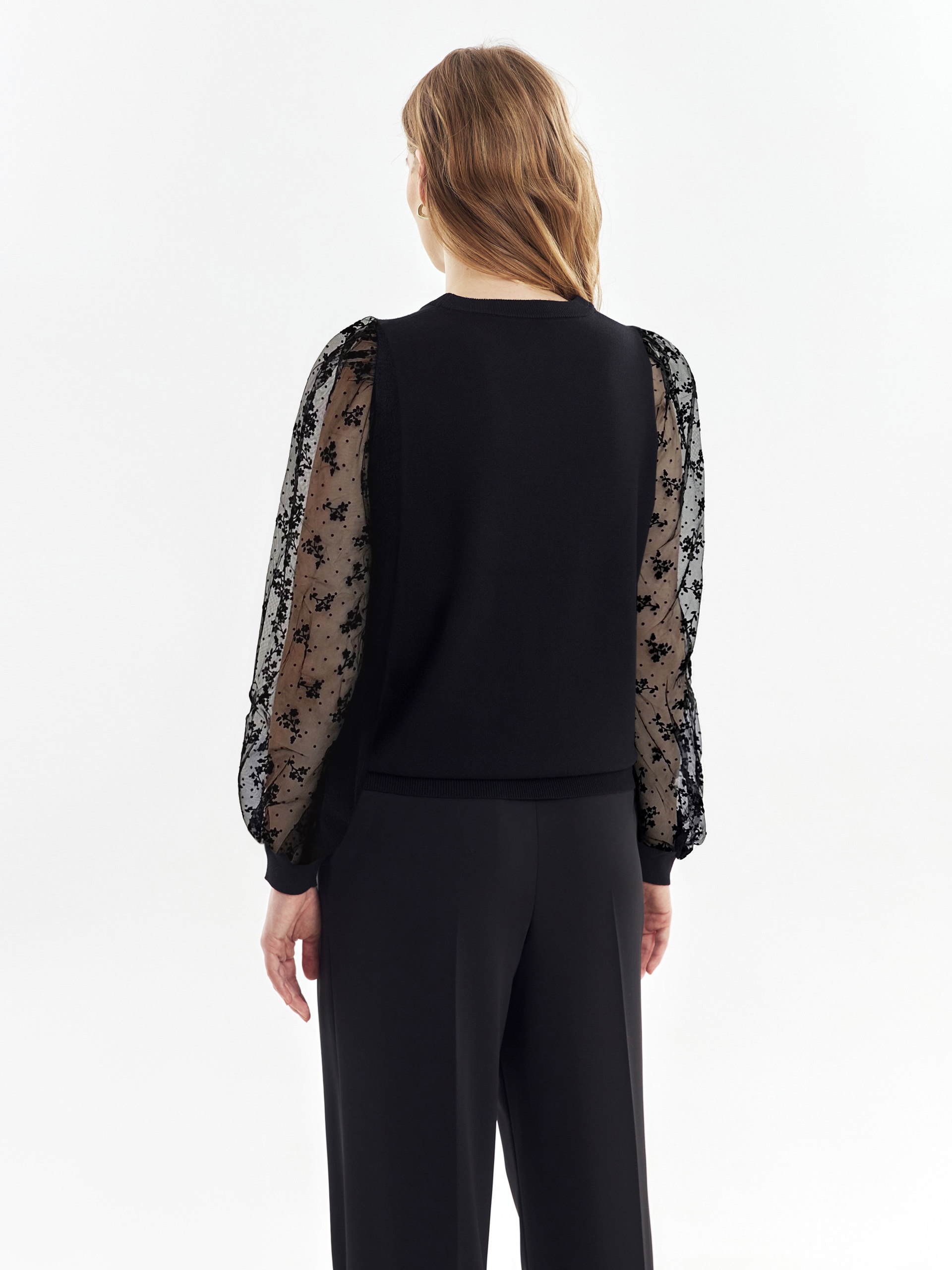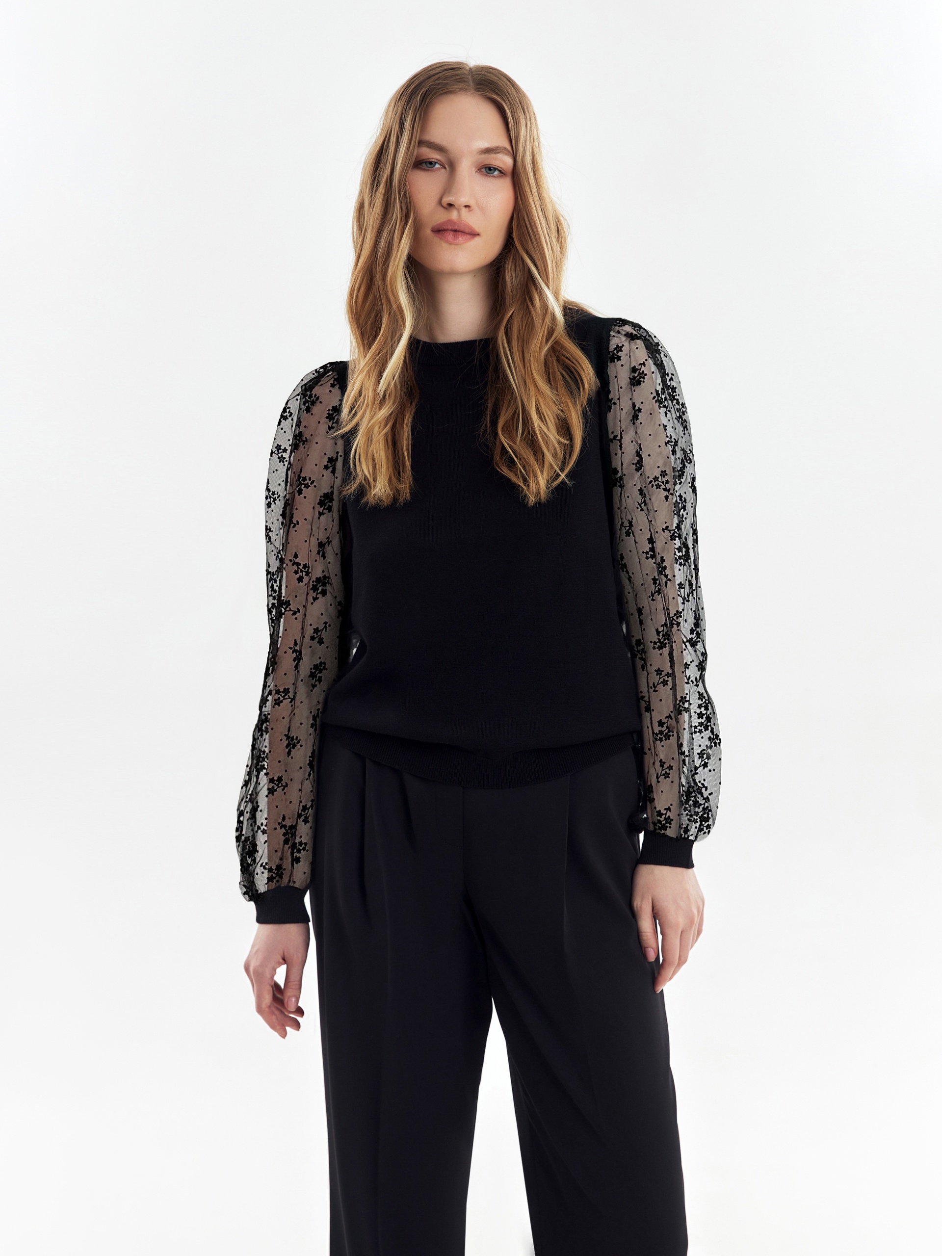 Комбинированная модель джемпера с объемными рукавами из декоративного прозрачного гипюра придаст загадочности вашему образу и дополнит как повседневный, так и вечерний лук.