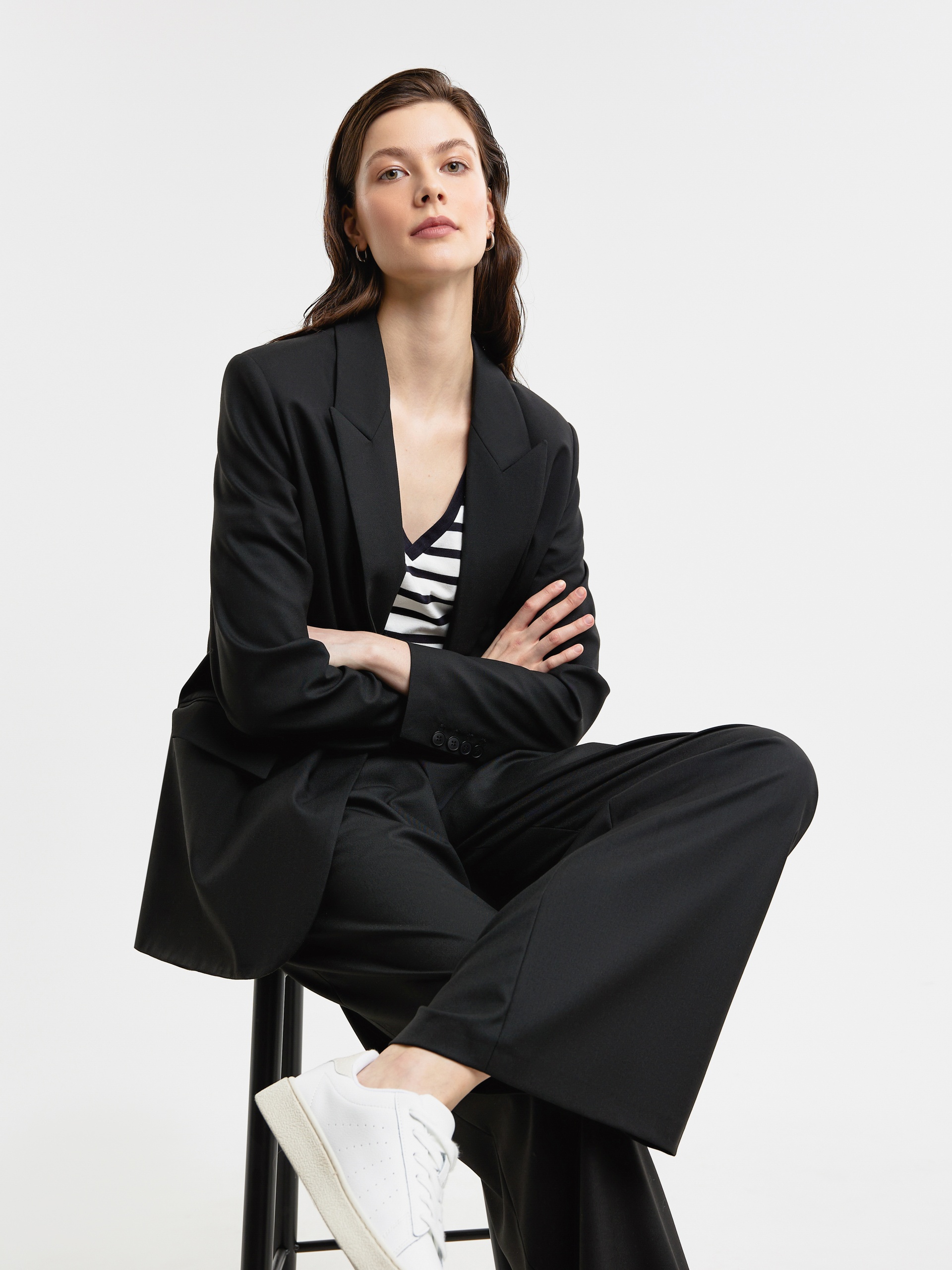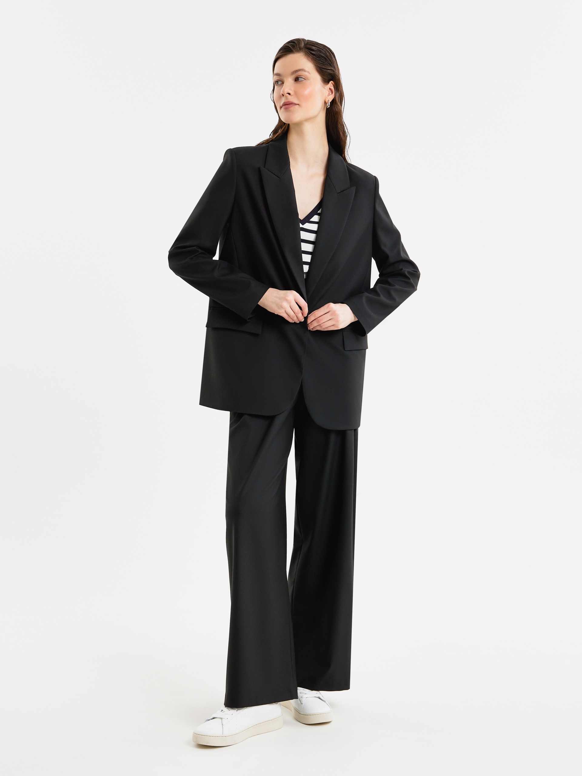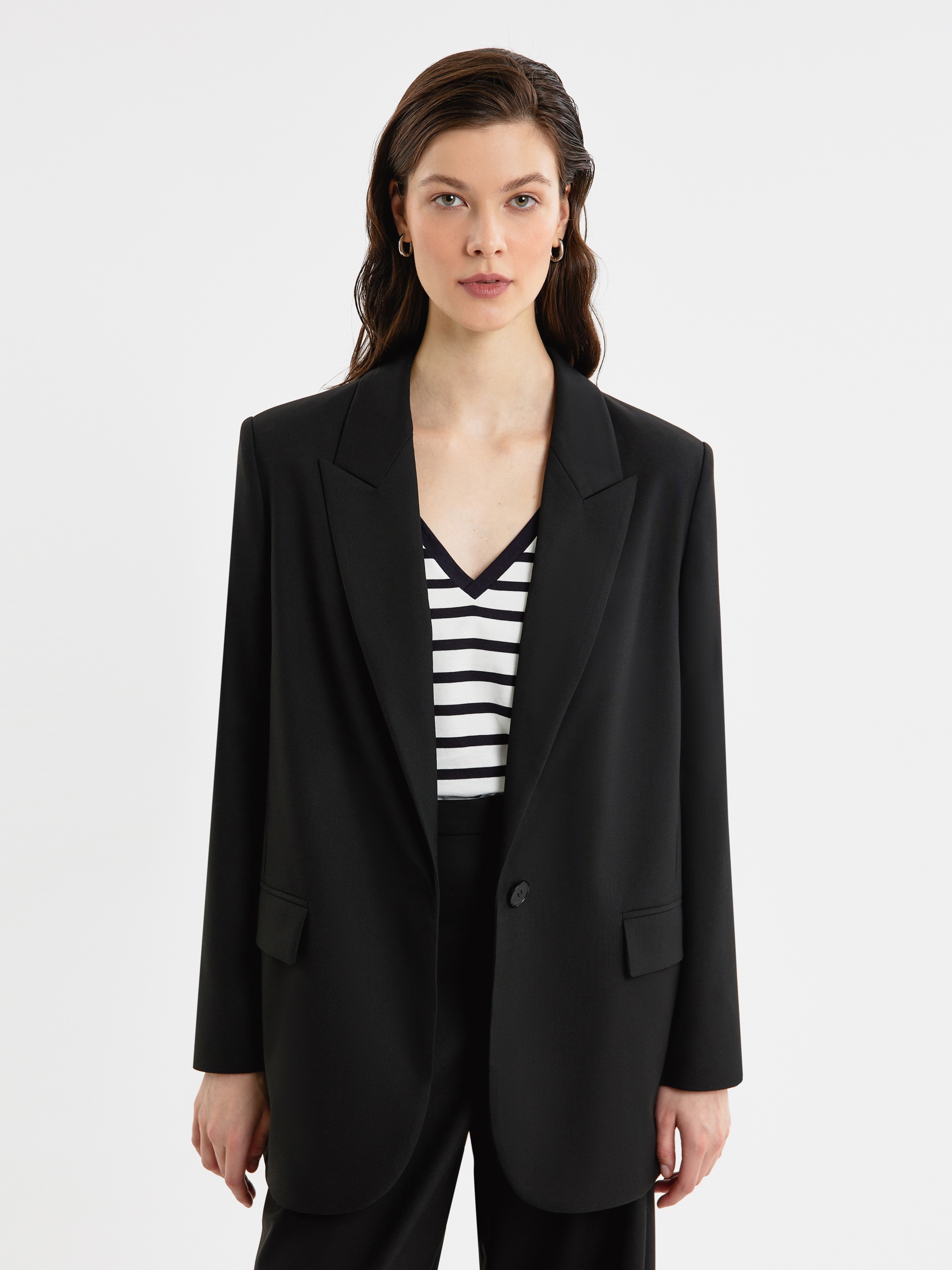 Прямой однобортный жакет из костюмной вискозной ткани черного цвета на одной пуговице. Воротник с лацканом сшит вместе, спереди прорезной карман и клапан. Рукава полной длины. Жакет на подкладке.