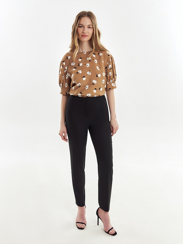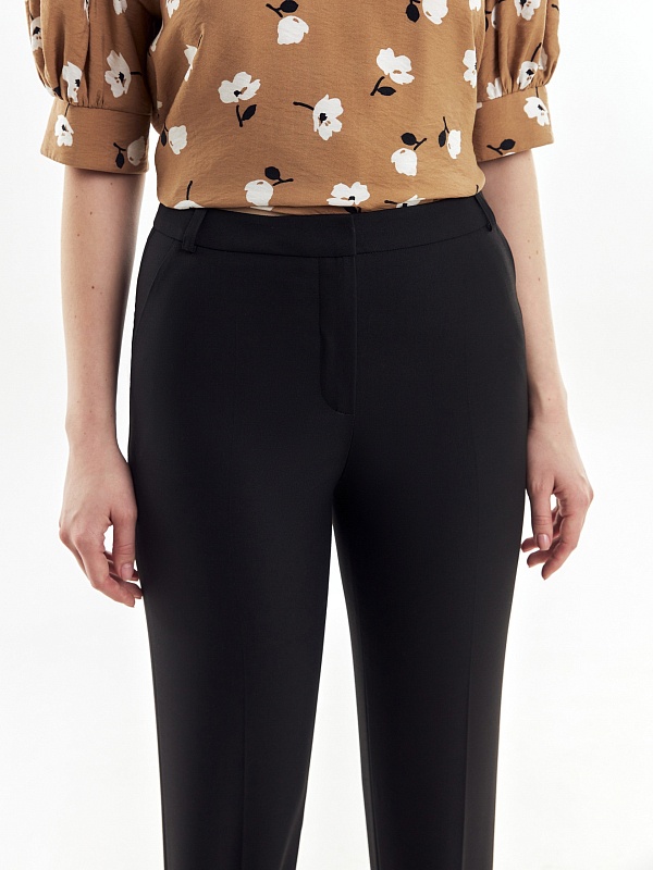 Брюки со стрелками из костюмной вискозной ткани зауженного к низу силуэта на притачном поясе со шлевками. Спереди рабочие боковые карманы и застежка на молнию и крючок. Эта модель идеально сочетается с жилетом из этой же ткани.