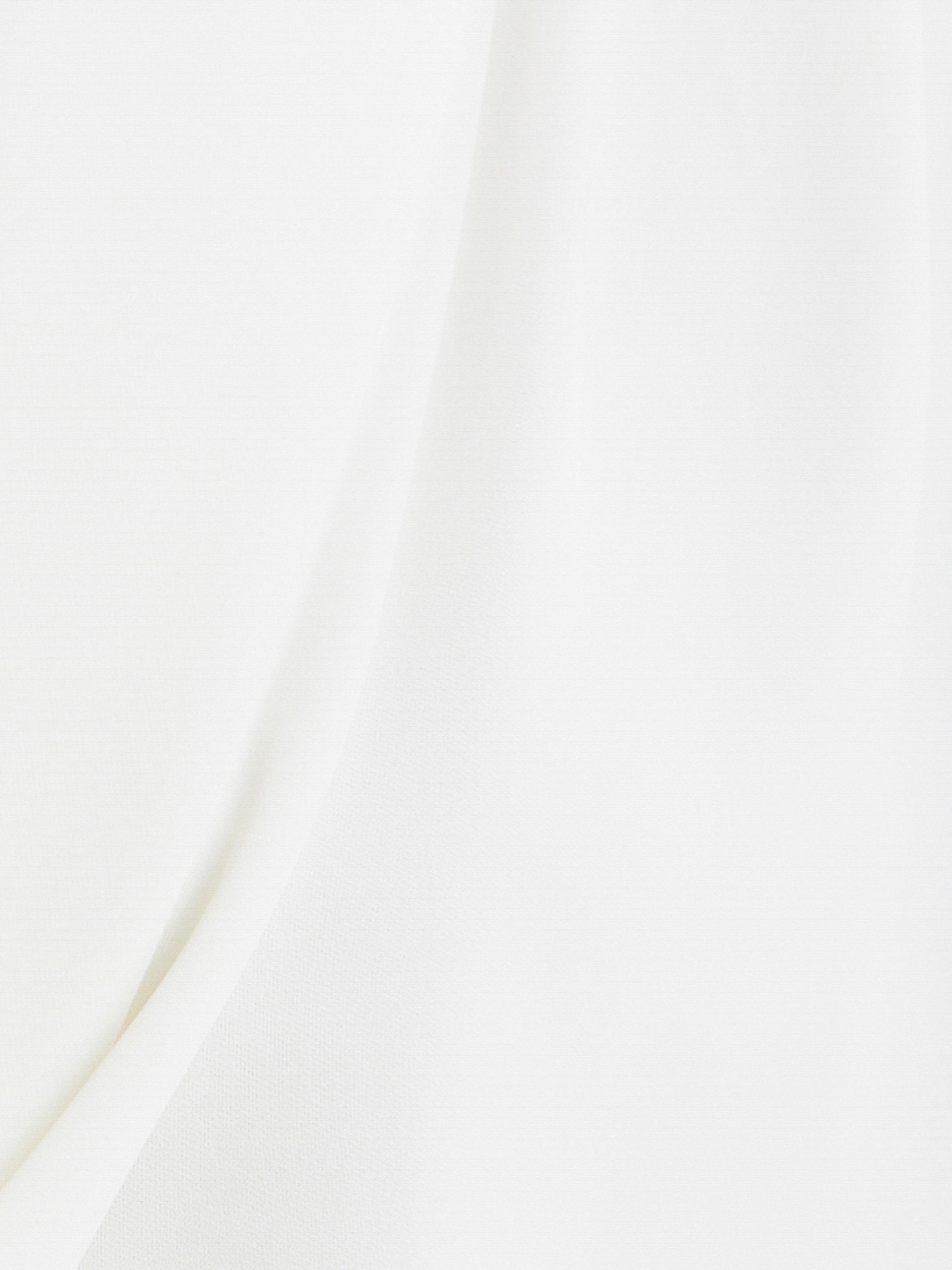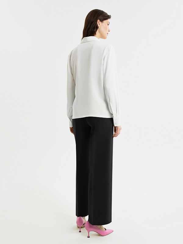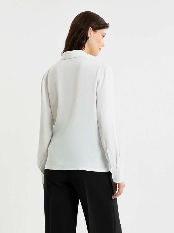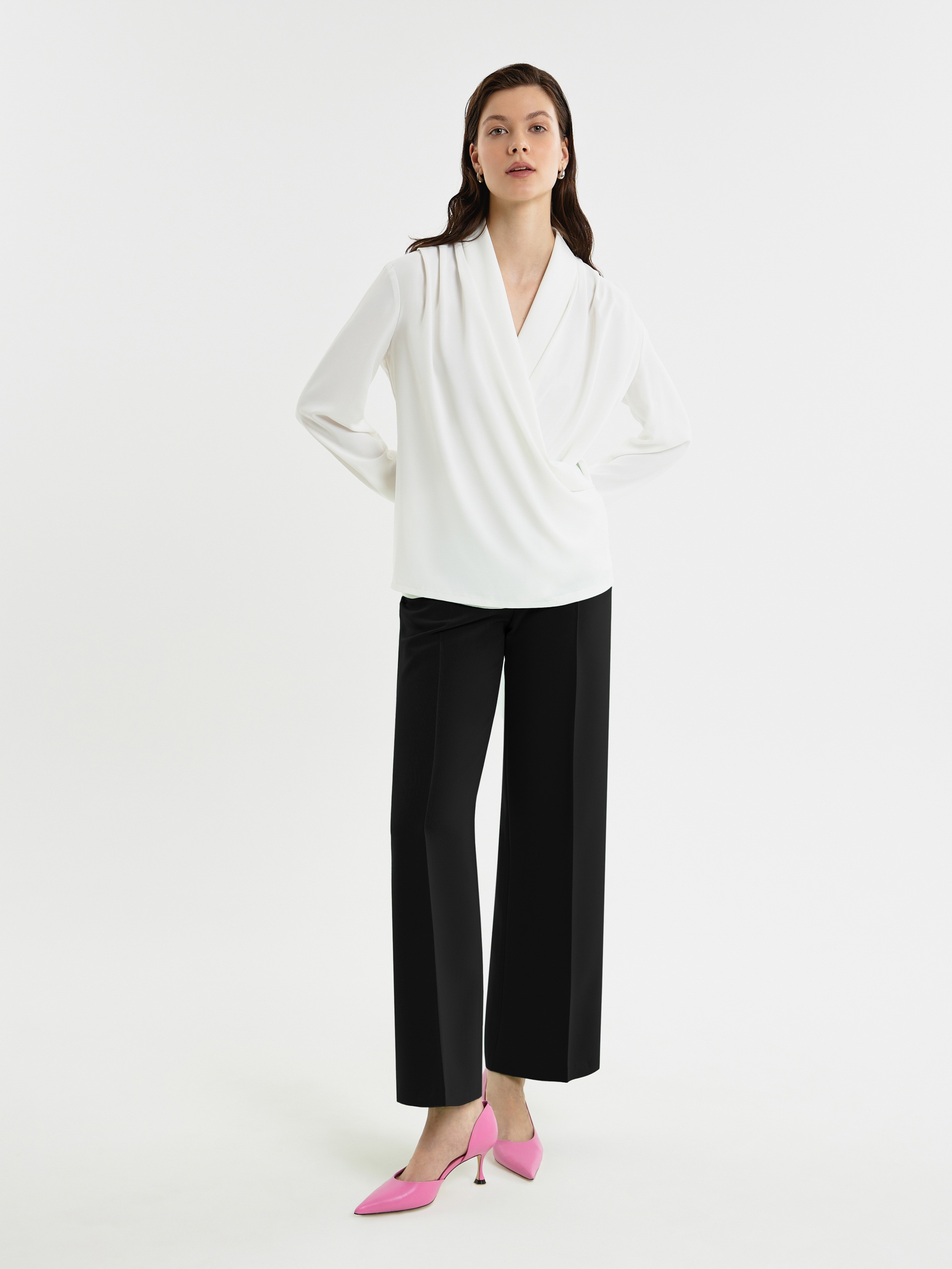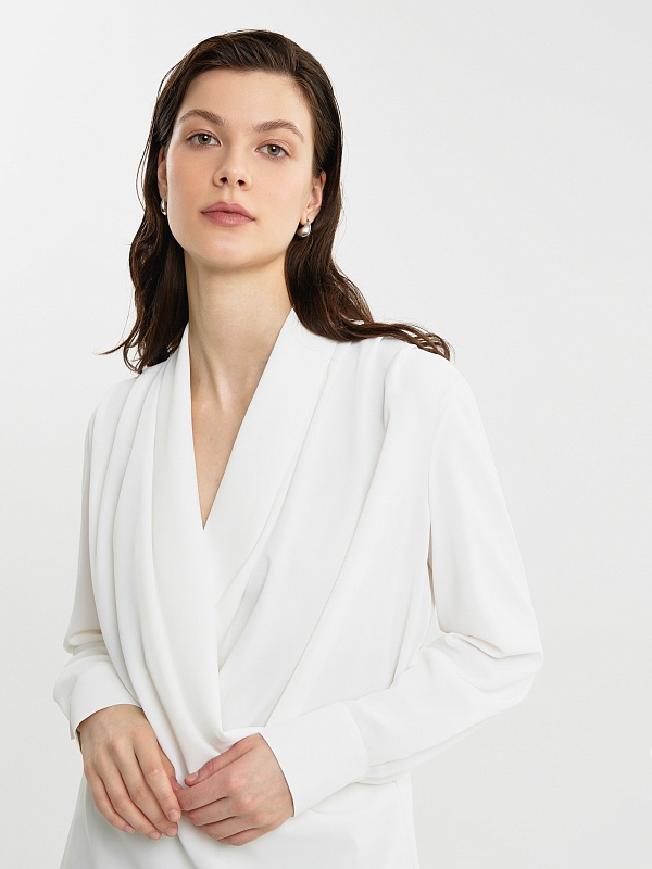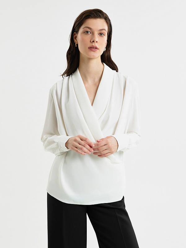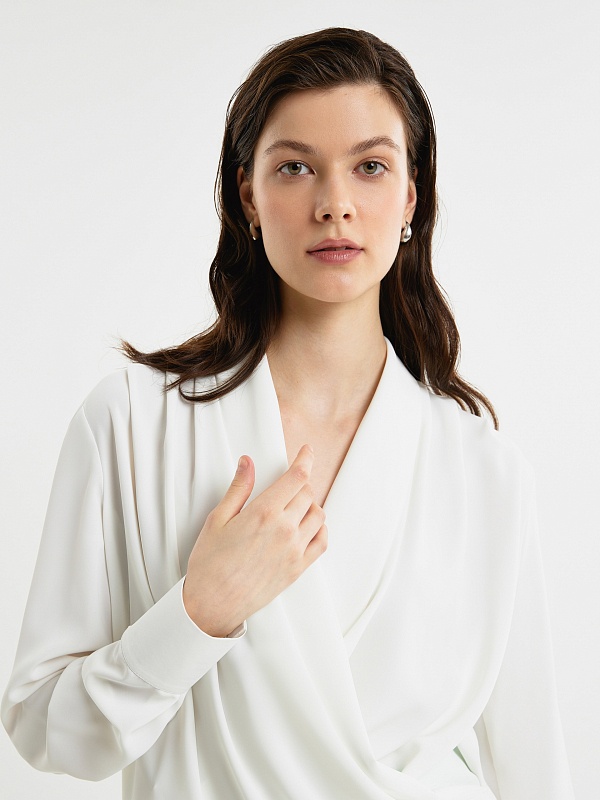 Полуприлегающая блуза на запах с цельнокроеным воротником и складками на плечах. Запах блузы ложный. Рукав втачной полной длины на манжете с пуговицами. Блуза выполнена из креповой ткани с натуральным составом.
