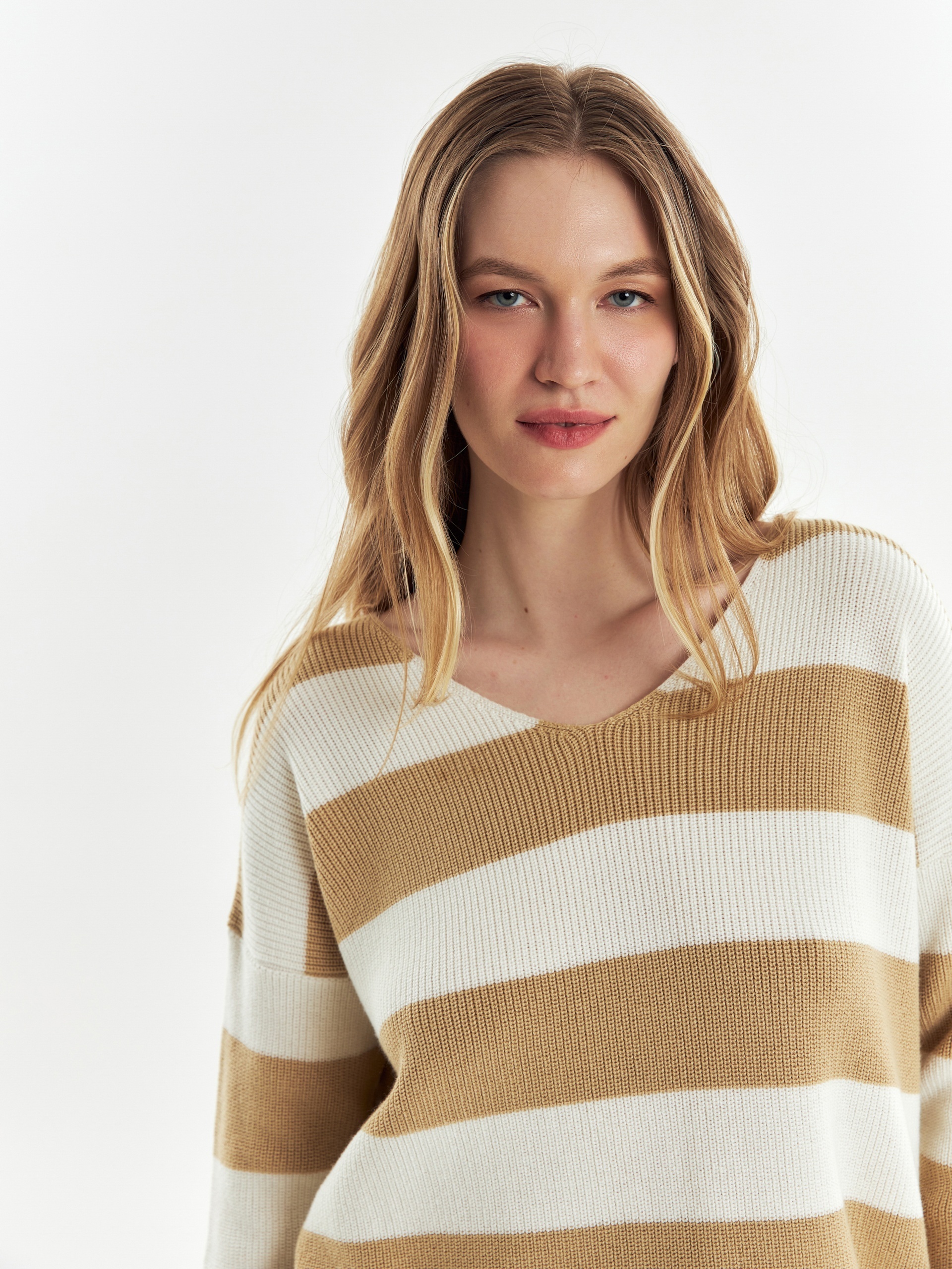 Лаконичный джемпер в широкую контрастную полосу, идеально впишется в ваш гардероб, а глубокий V-образный вырез прекрасно подчеркнет вашу зону декольте.
