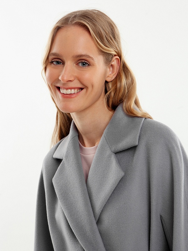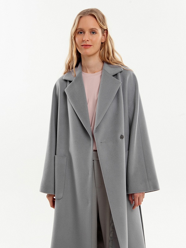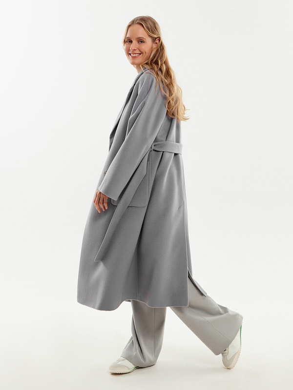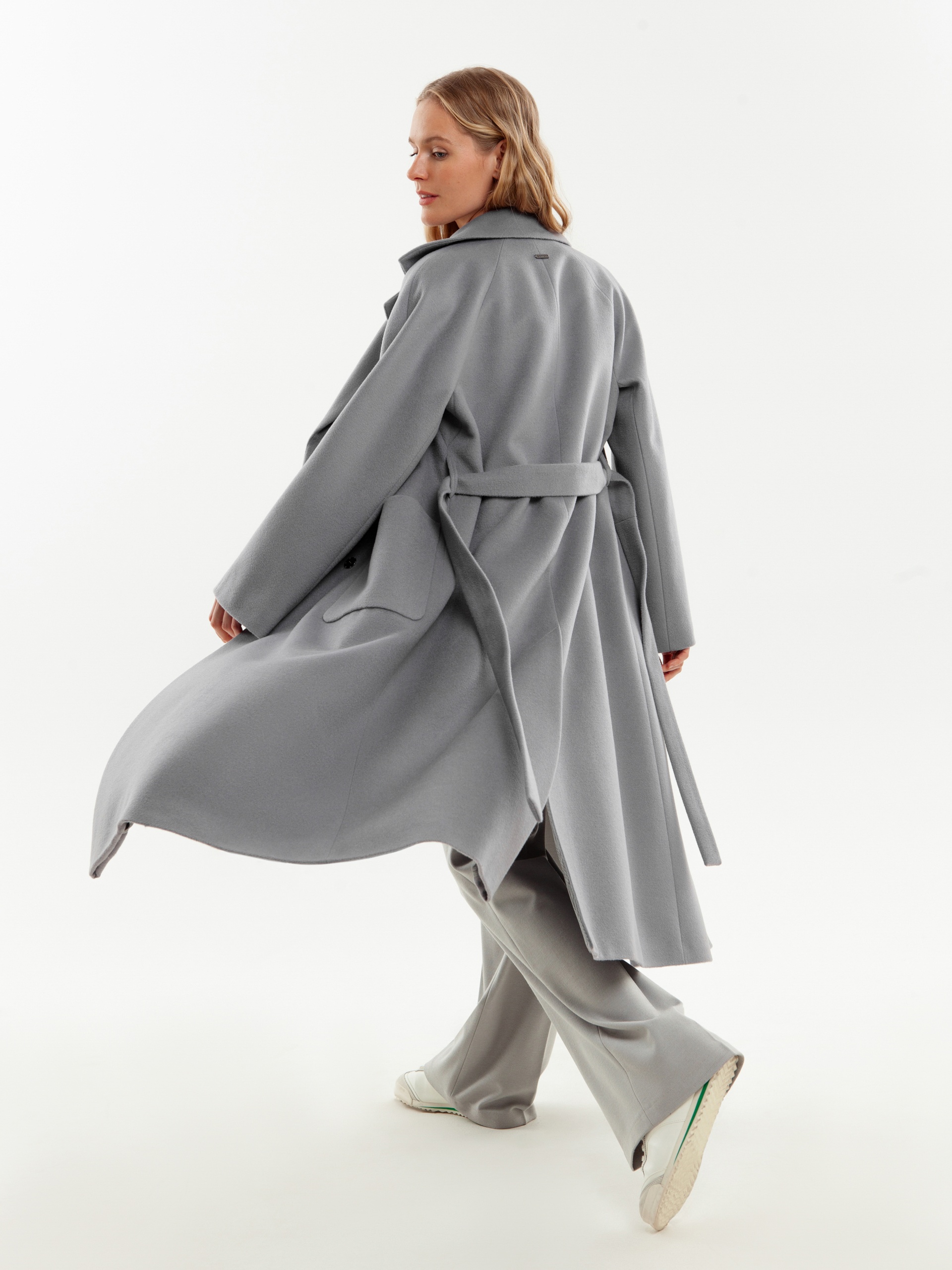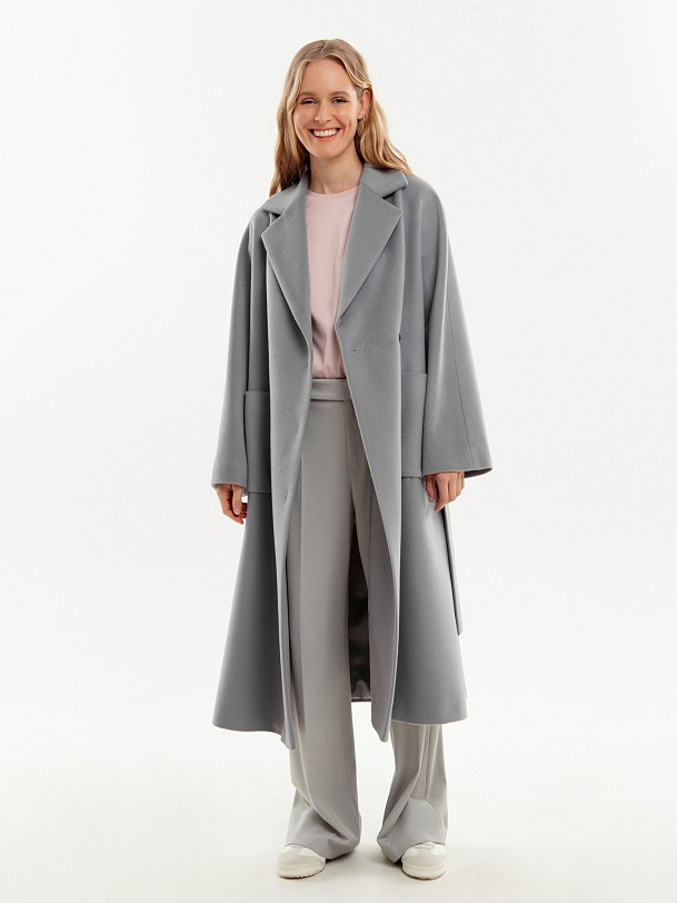 Двубортное пальто из шерстяной ворсовой ткани в светло-сером оттенке. Это расклешенное пальто силуэта "трапеция" дарит ощущение домашнего уюта и заботы. Большой объем и комбинированный рукав (цельнокроеный спереди и реглан на спинке) позволяют буквально завернуться в него. Спереди находятся крупные накладные карманы. Застегивается пальто на ряд надежных пришивных кнопок. В комплект к изделию предлагается пояс из основной ткани. Пальто на подкладке. Произведено в Санкт-Петербурге.