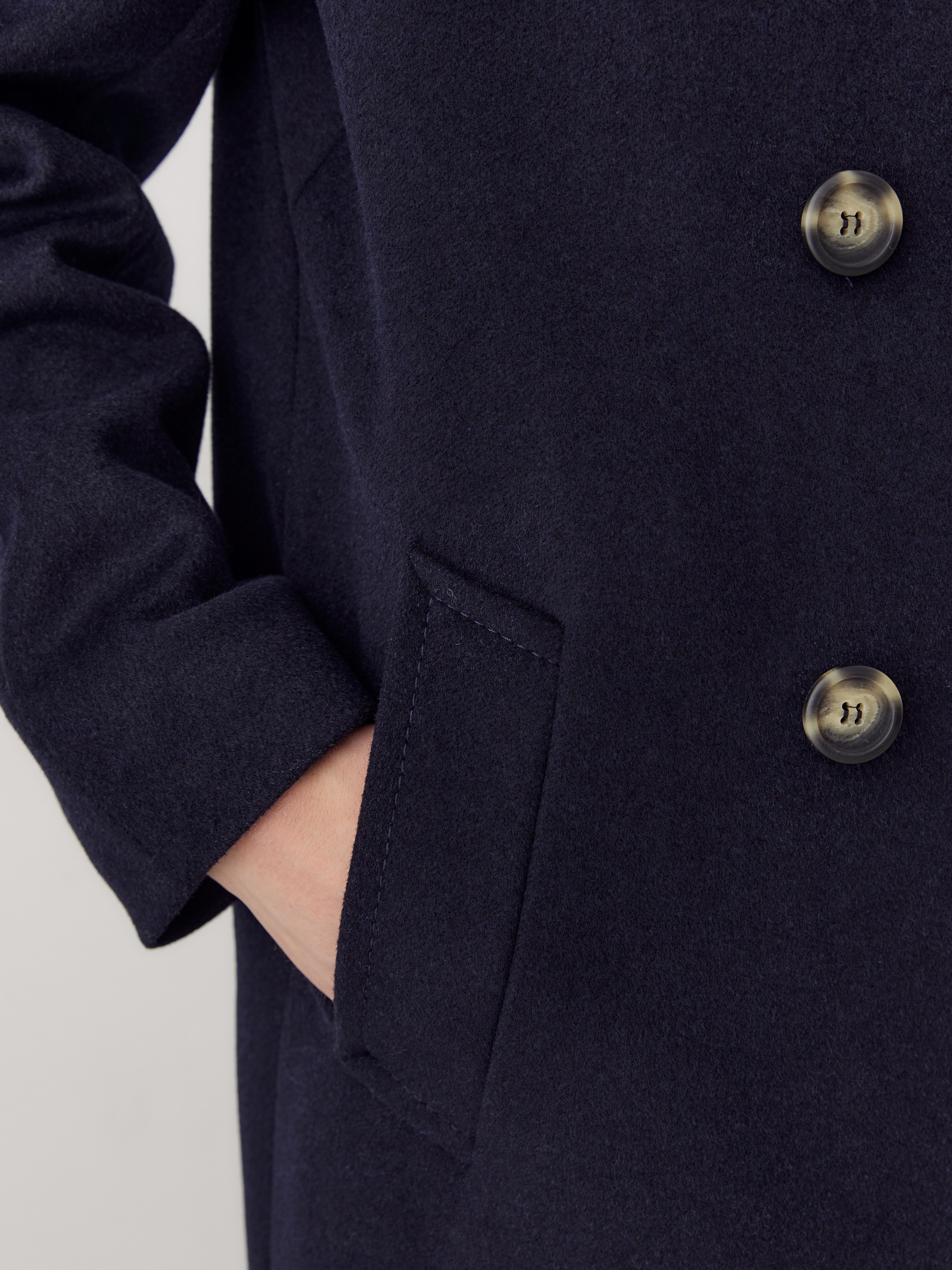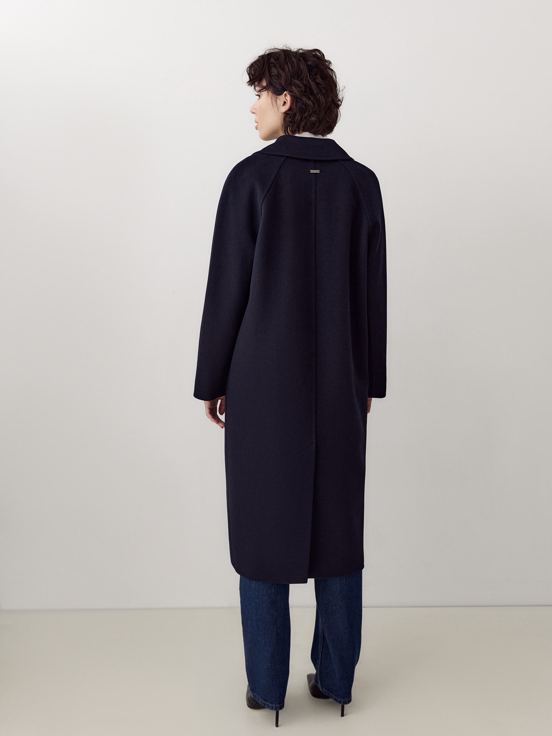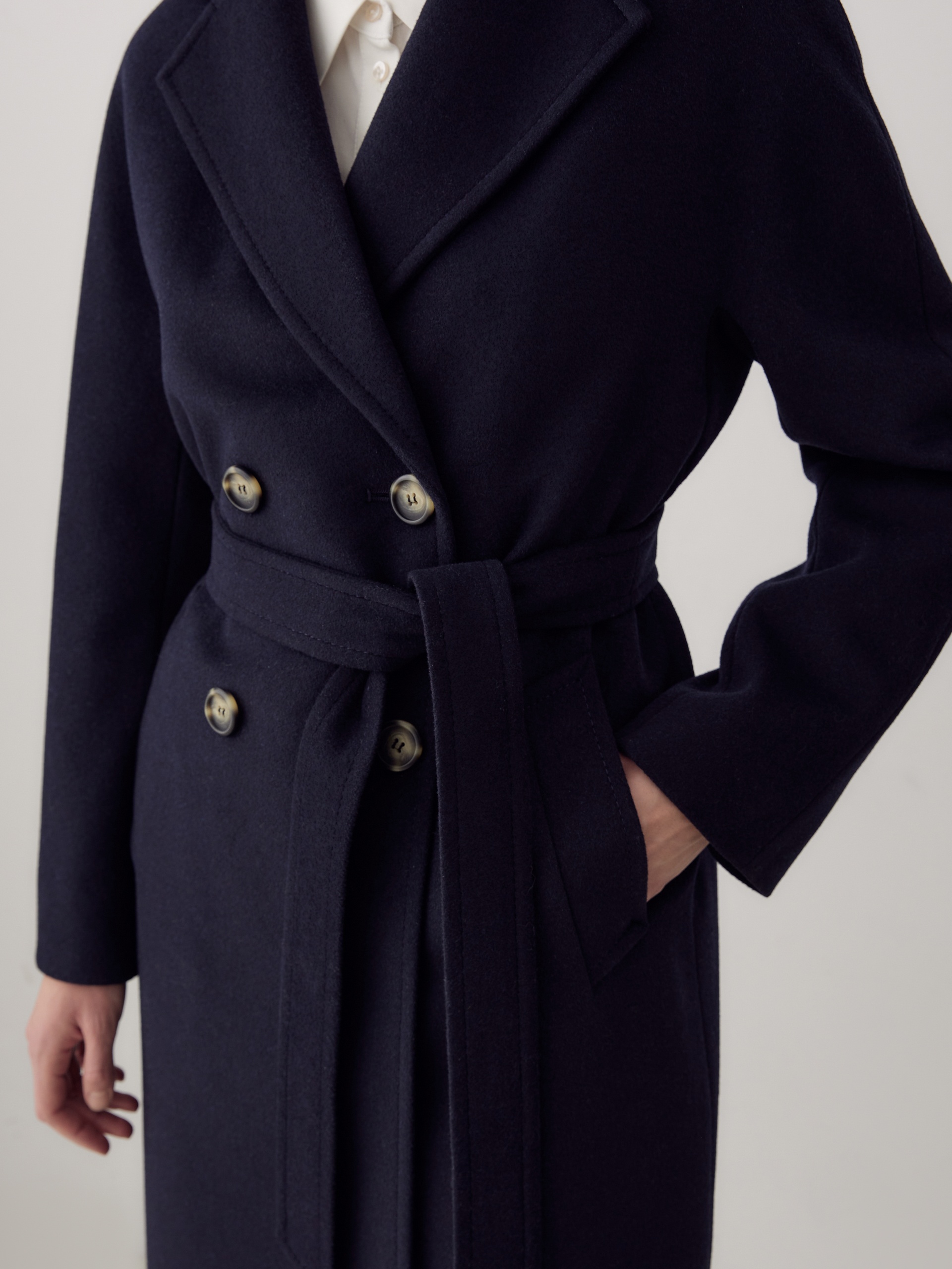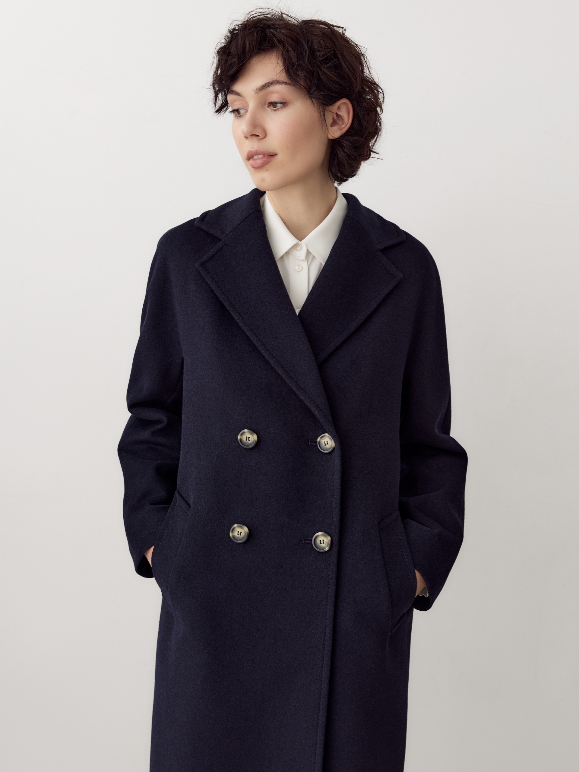 Двубортное пальто силуэта удлиненный кокон - это всем полюбившаяся классика пальто, представленная в новом видении и в современных оттенках. Пальто комфортной длины ниже колена, что расширяет возможности для формирования образов. Уникальный рукав-кимоно спереди и реглан на спинке создает уютный и расслабленный образ и не стесняет движений. Горловину пальто обрамляет классический широкий английский воротник. Пальто имеет два глубоких кармана с листочками. Застегивается на два ряда стильных крупных пуговиц. Дополняет образ съемный пояс, благодаря которому можно подчеркнуть талию. Пальто изготовлено из премиальной ткани с высоким содержанием шерсти в классическом черно-синем оттенке. А для наилучшей защиты от непогоды пальто выполнено с использованием высокотехнологичной мембраны RaftPro. Произведено в Санкт-Петербурге.