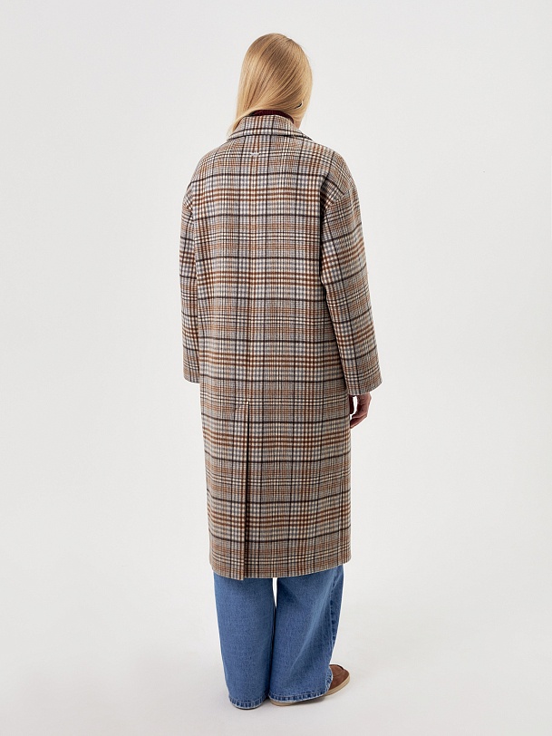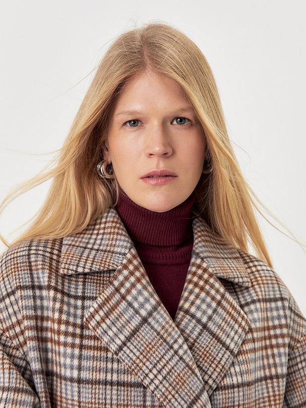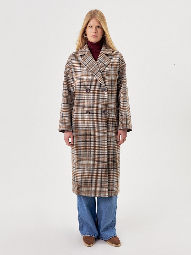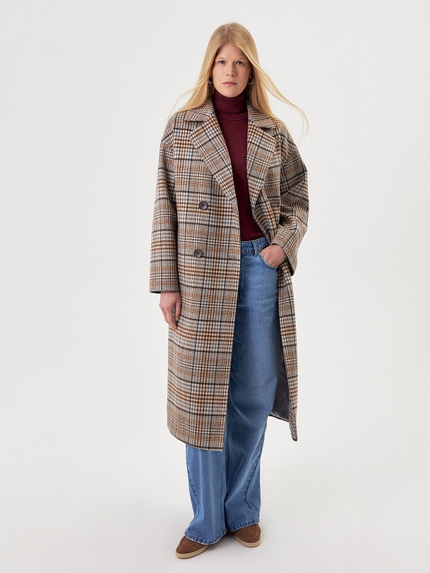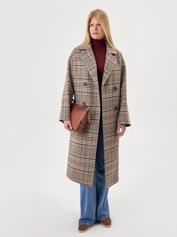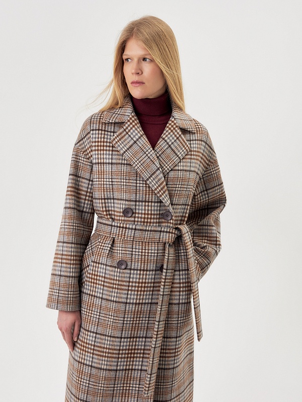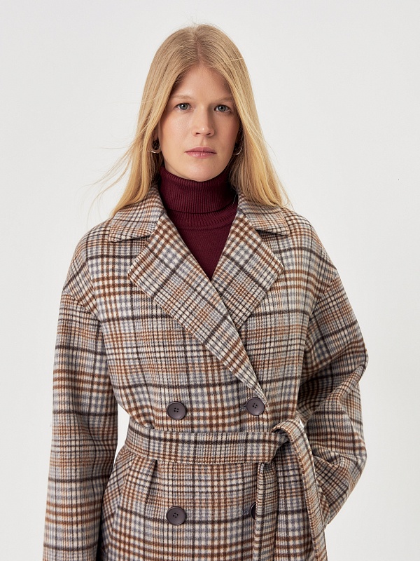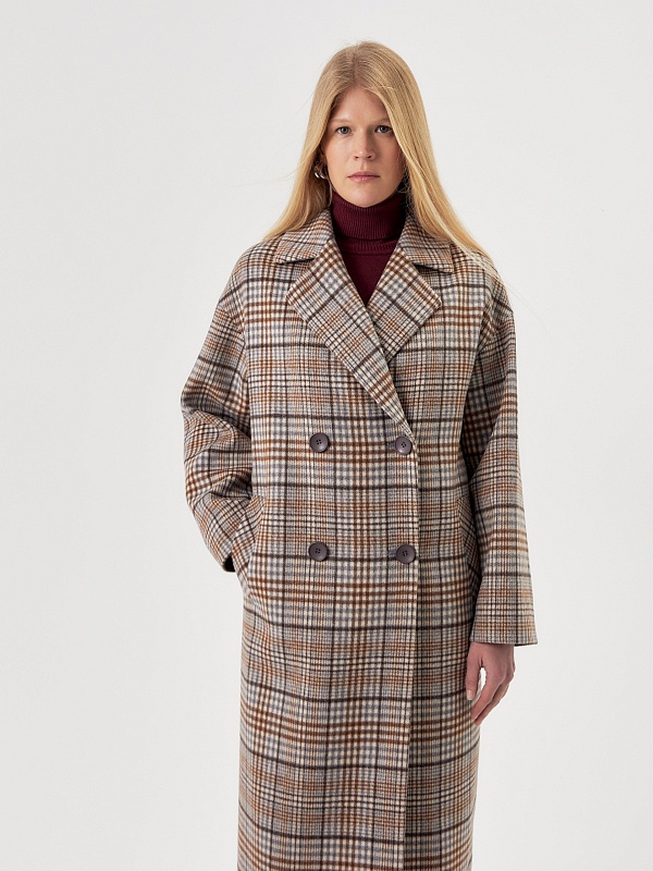 Двубортное пальто прямого силуэта из пальтовой ворсовой ткани в сложную бежево-серо-коричневую клетку. Пальто имеет комфортный рубашечный рукав, классический английский воротник и универсальную длину ниже колена. По бокам располагаются глубокие карманы с листочками. Застегивается изделие на два ряда крупных пуговиц под натуральный рог. В качестве дополнительного декоративного элемента к пальто предлагается пояс из основной ткани. Для наилучшей защиты от холода и ветра пальто выполнено с использованием высокотехнологичной мембраны RaftPro. Произведено в Санкт-Петербурге.