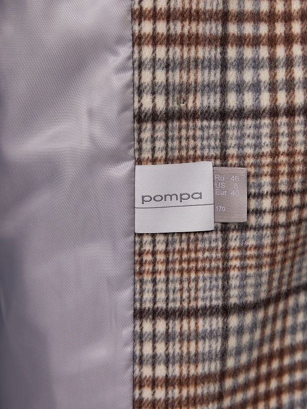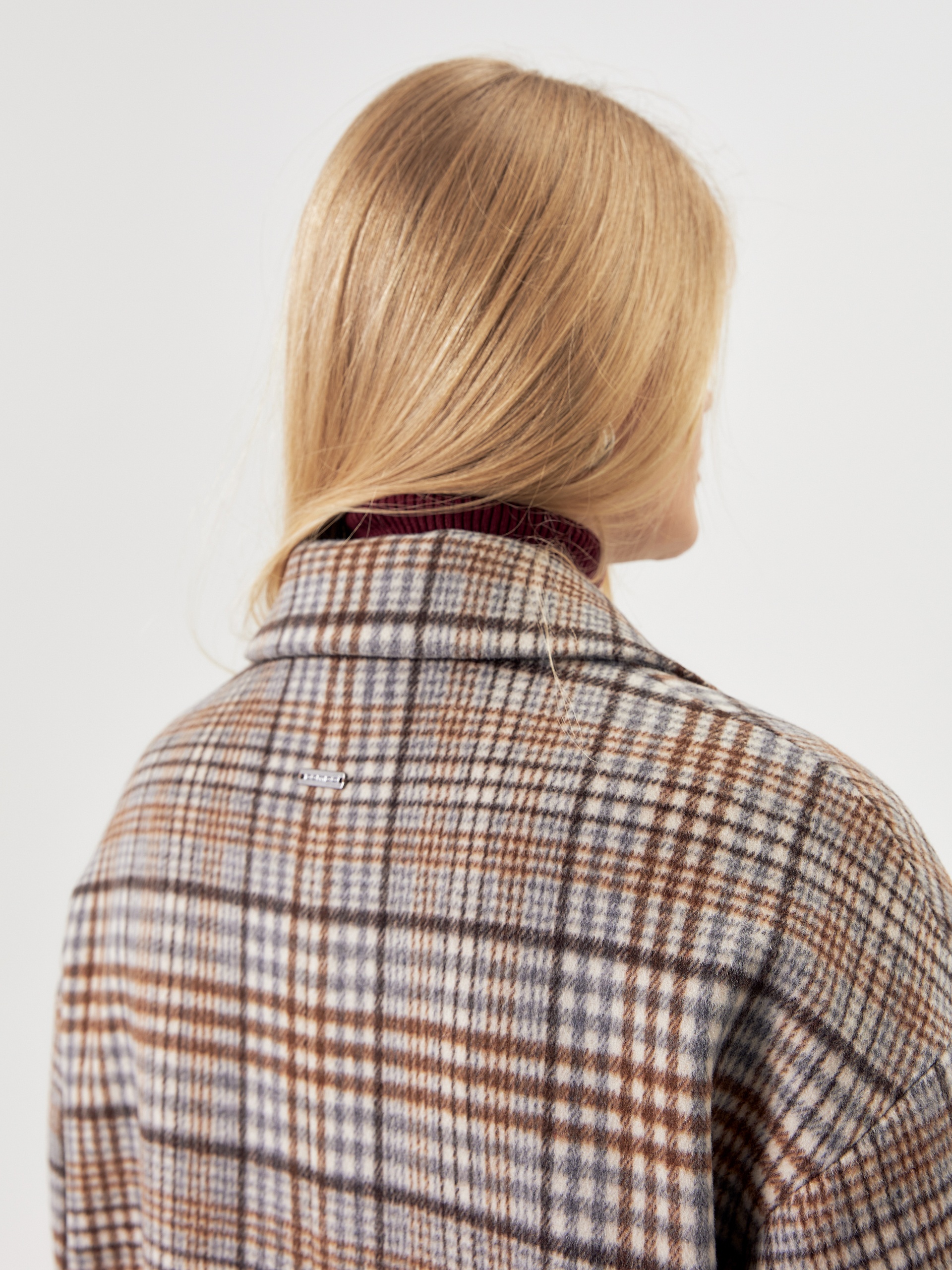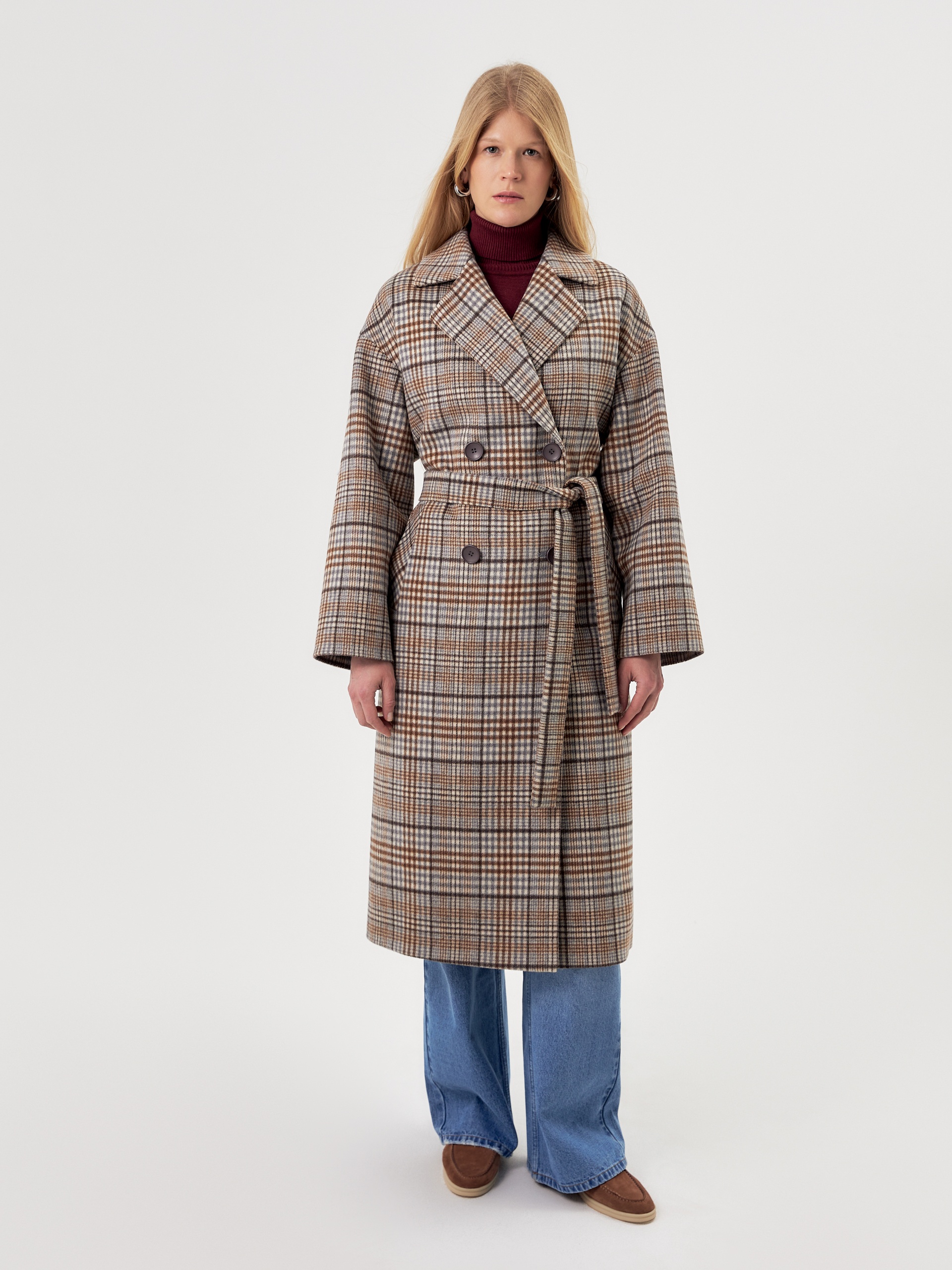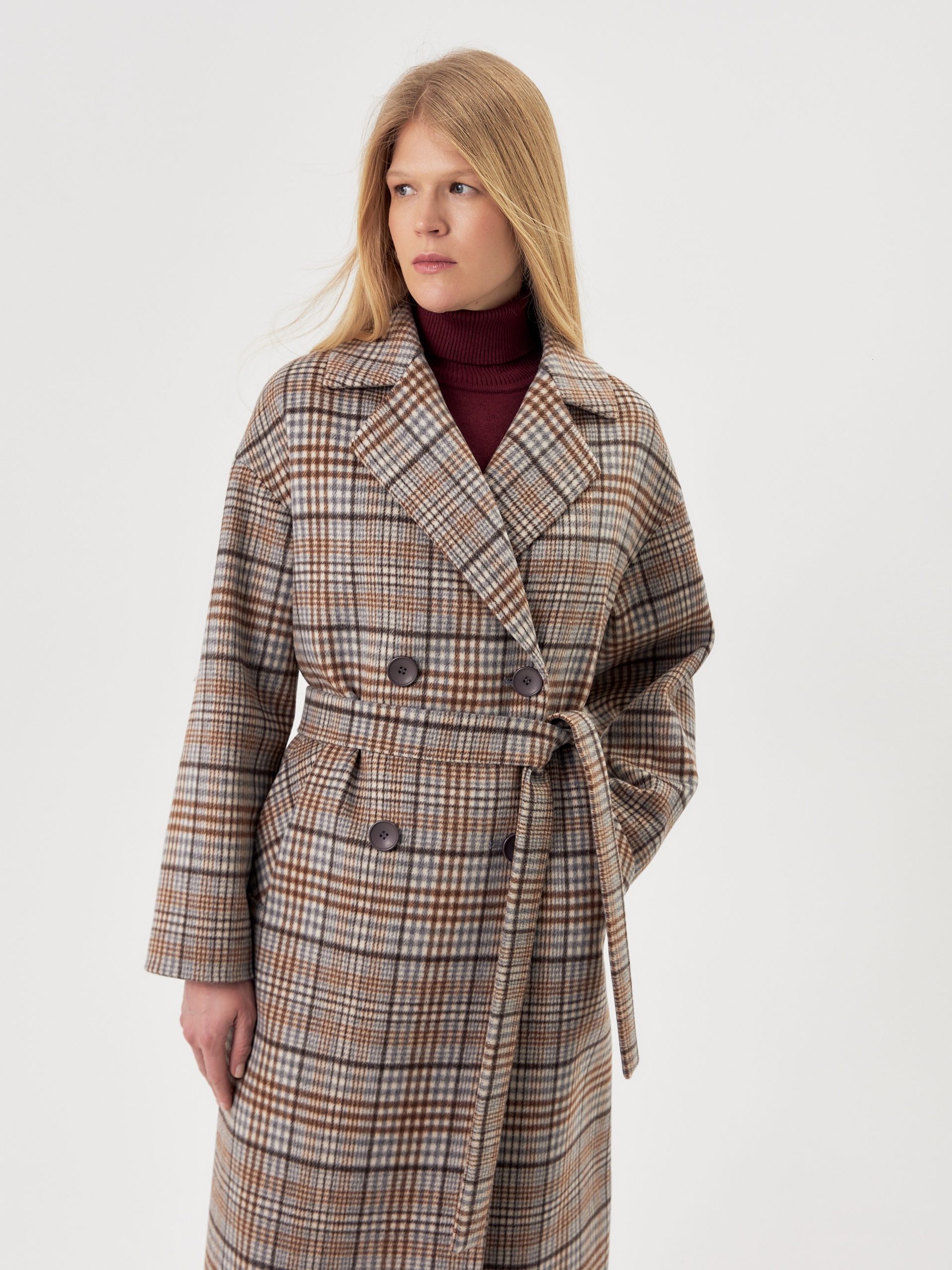 Двубортное пальто прямого силуэта из пальтовой ворсовой ткани в сложную бежево-серо-коричневую клетку. Пальто имеет комфортный рубашечный рукав, классический английский воротник и универсальную длину ниже колена. По бокам располагаются глубокие карманы с листочками. Застегивается изделие на два ряда крупных пуговиц под натуральный рог. В качестве дополнительного декоративного элемента к пальто предлагается пояс из основной ткани. Для наилучшей защиты от холода и ветра пальто выполнено с использованием высокотехнологичной мембраны RaftPro. Произведено в Санкт-Петербурге.
