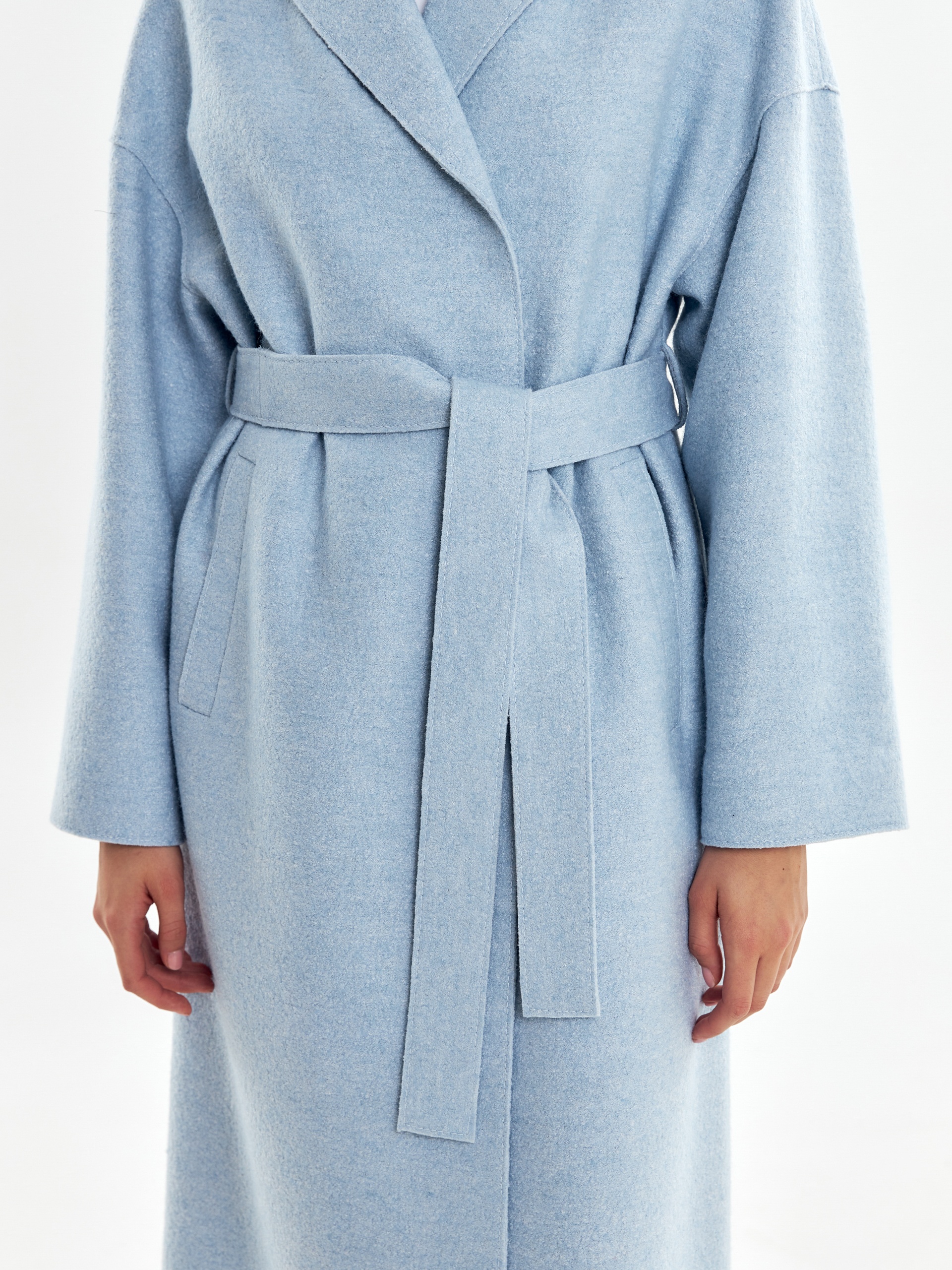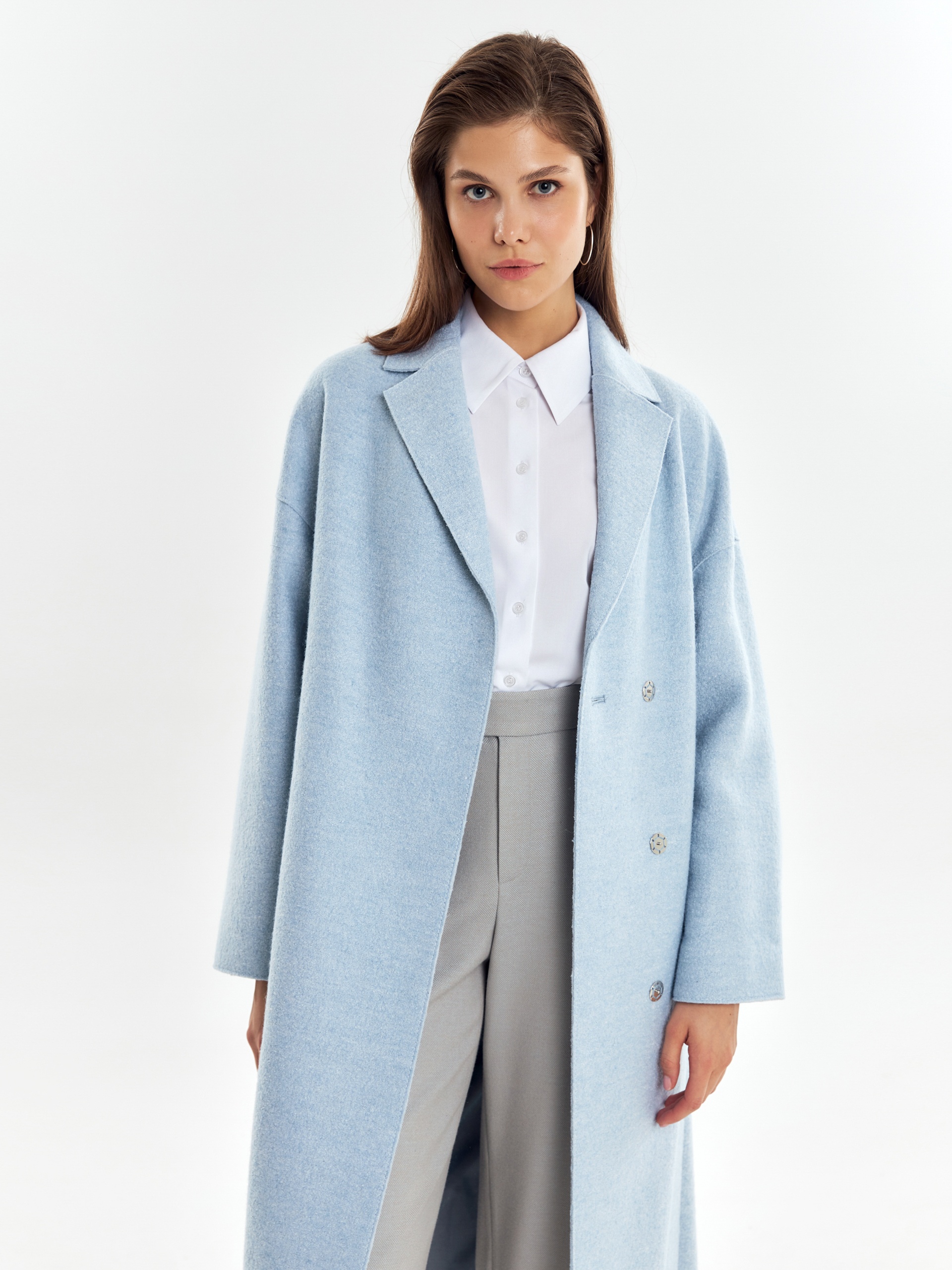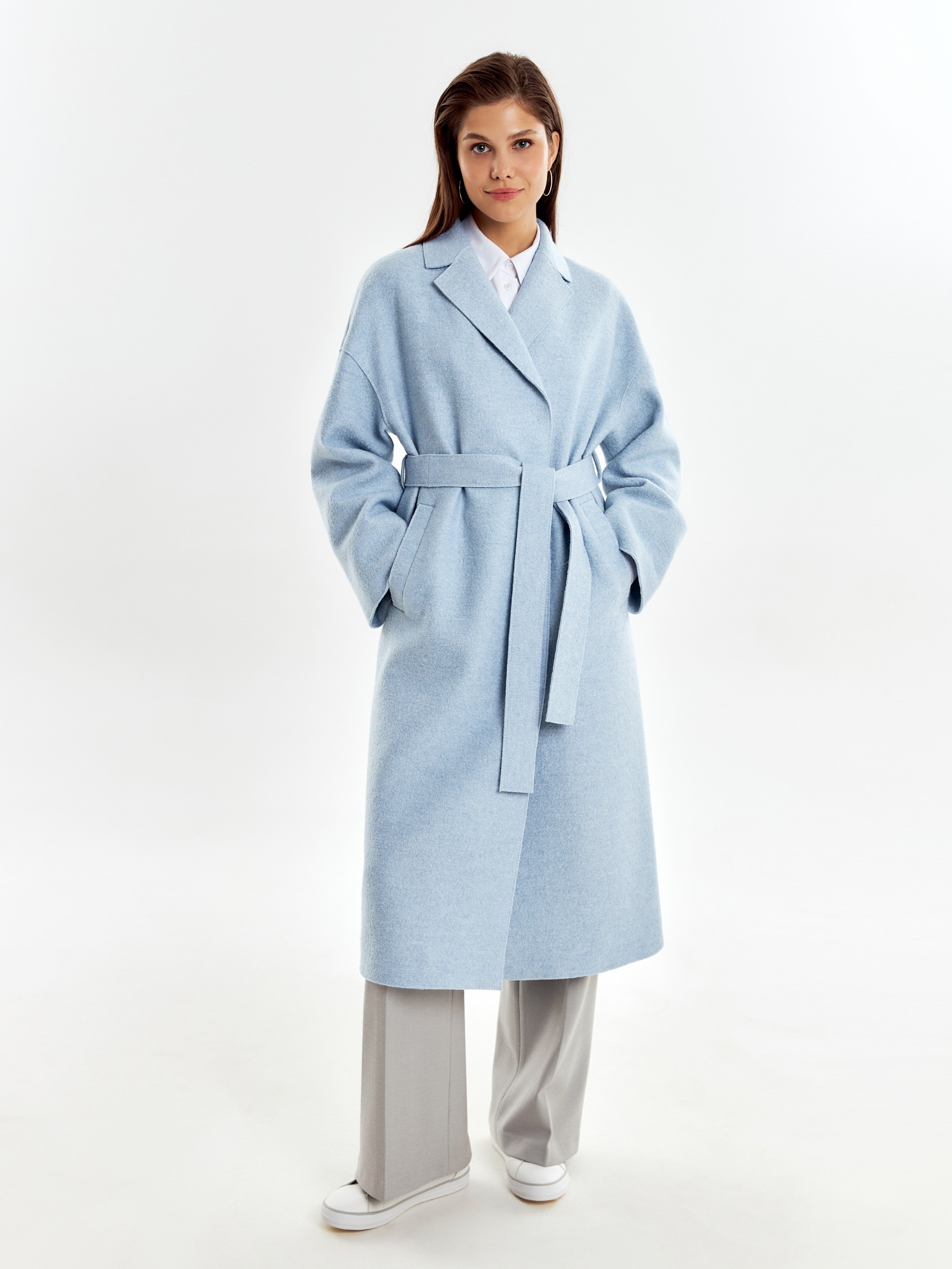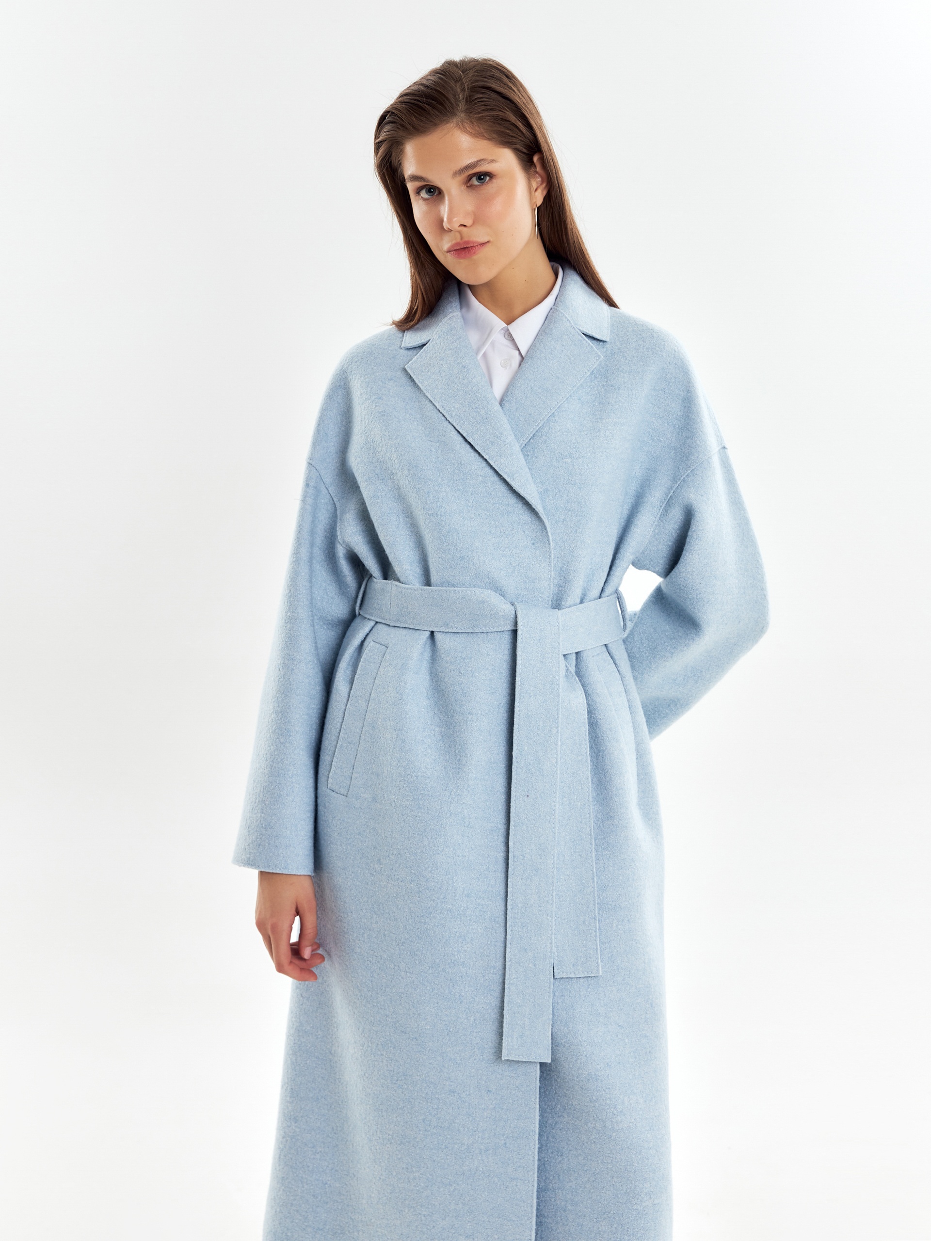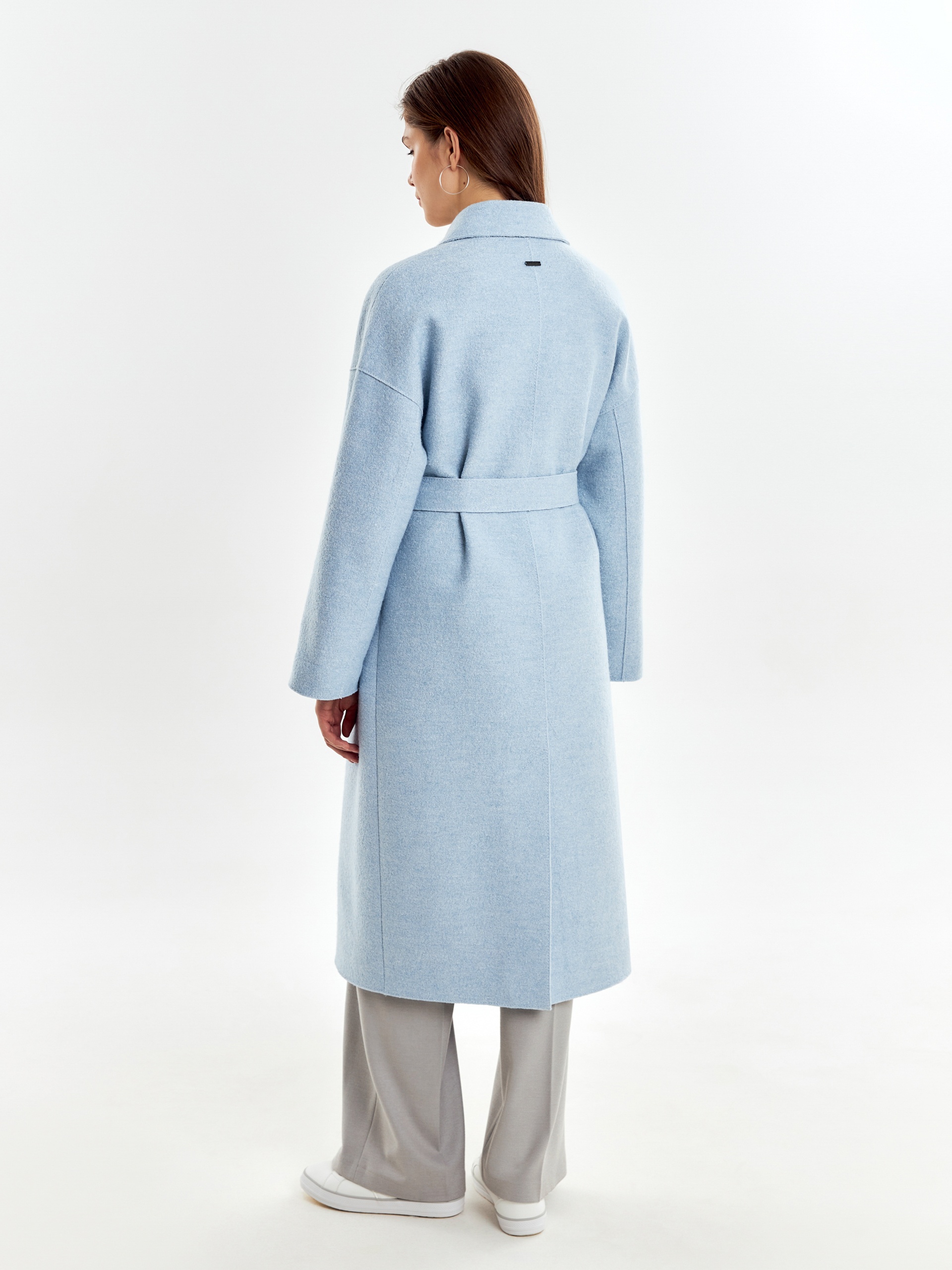 Двубортное пальто прямого силуэта из пальтовой ткани с эффектом "вареная шерсть" в нежном весеннем голубом оттенке. Пальто выполнено с открытыми срезами, что делает его еще более современным. По бокам располагаются глубокие карманы с узкими листочками. Застегивается изделие на ряд надежных пришивных кнопок. В качестве дополнительного декоративного элемента к пальто прилагается пояс, который с легкостью изменит образ и сделает его более женственным и утонченным. Уникальная лекальная база, которая разработана нашими конструкторами одежды, подчеркивает все достоинства фигуры и визуально вытягивает силуэт. Изделие на подкладке. Произведено в Санкт-Петербурге.