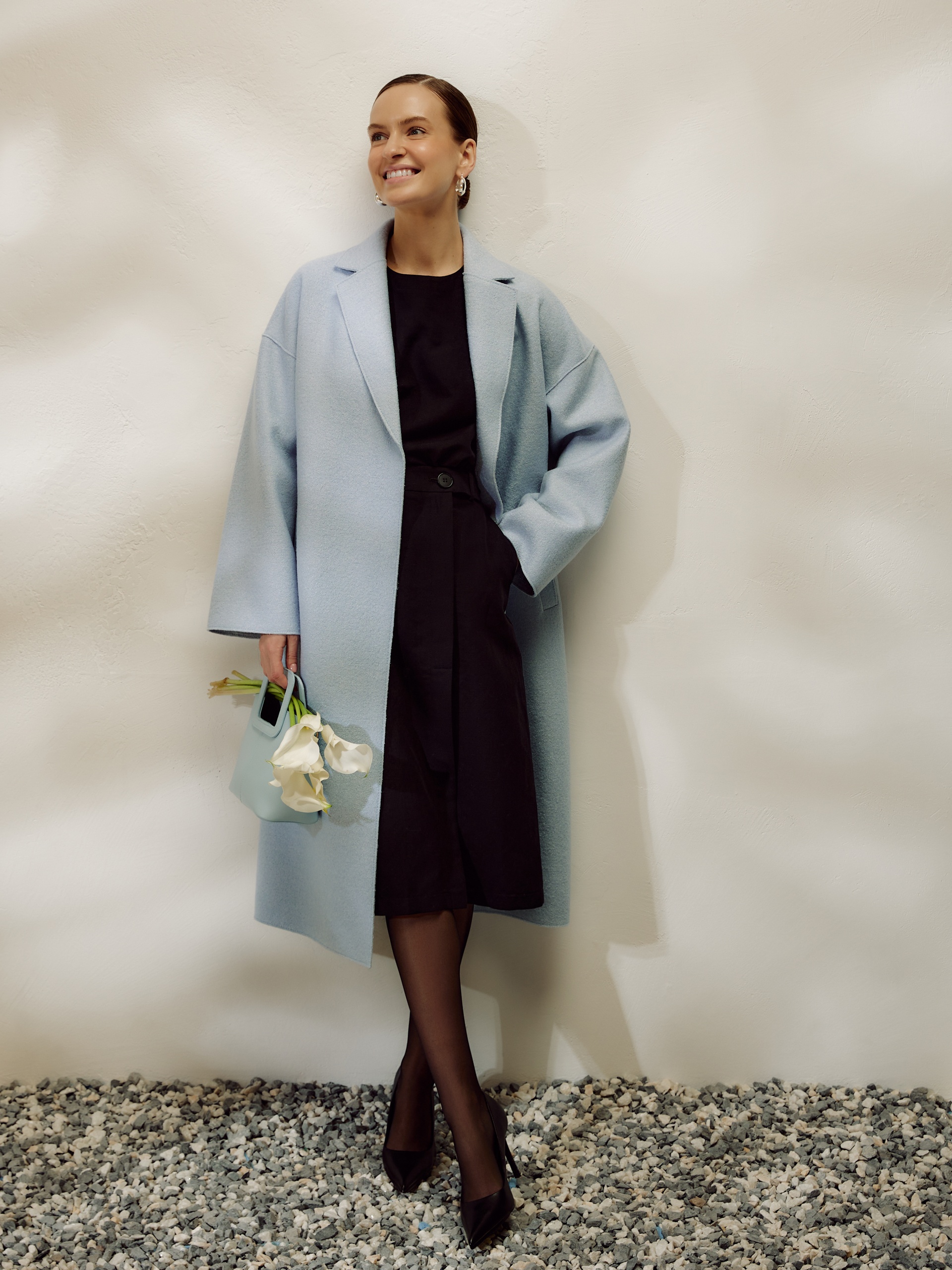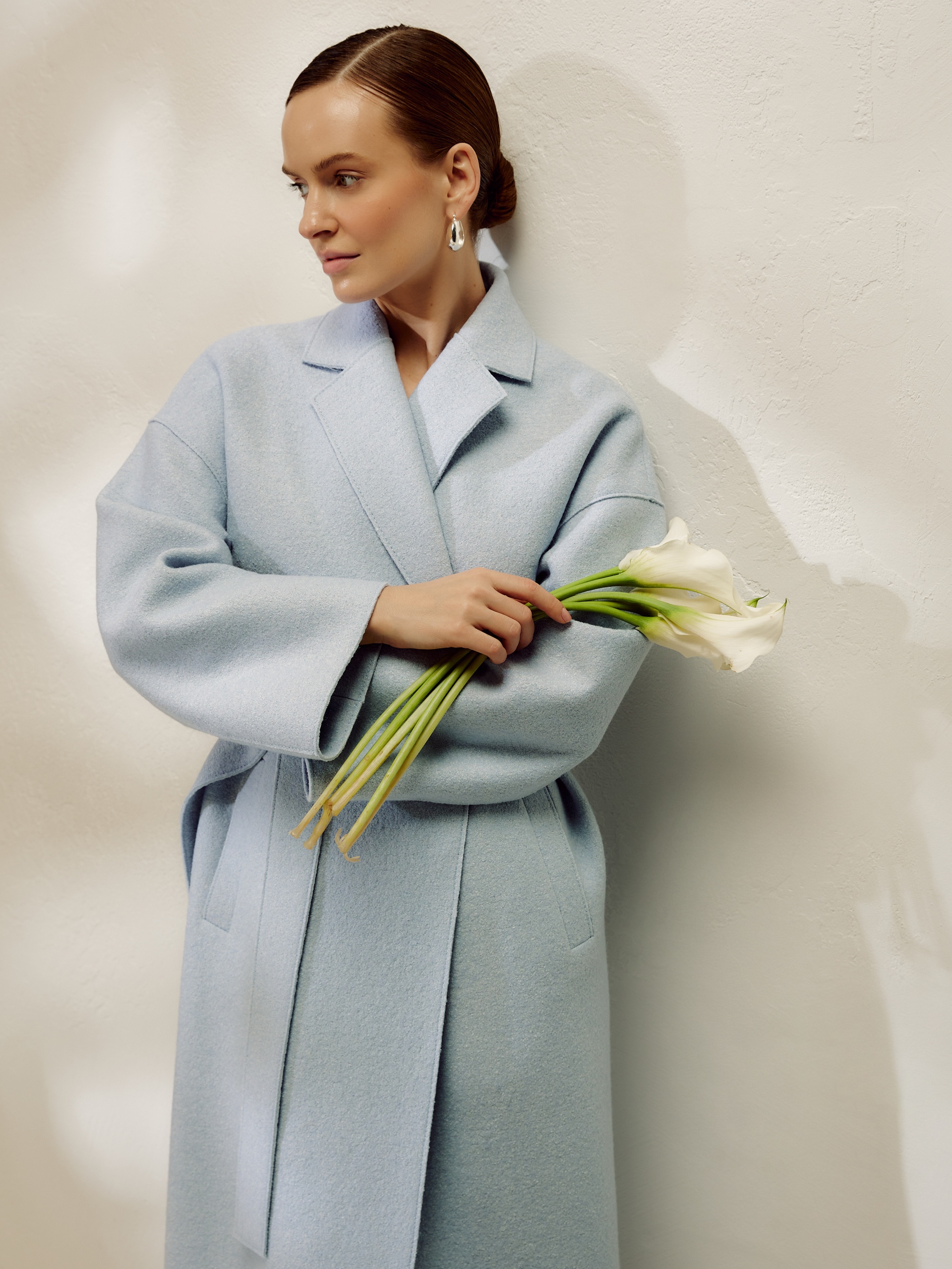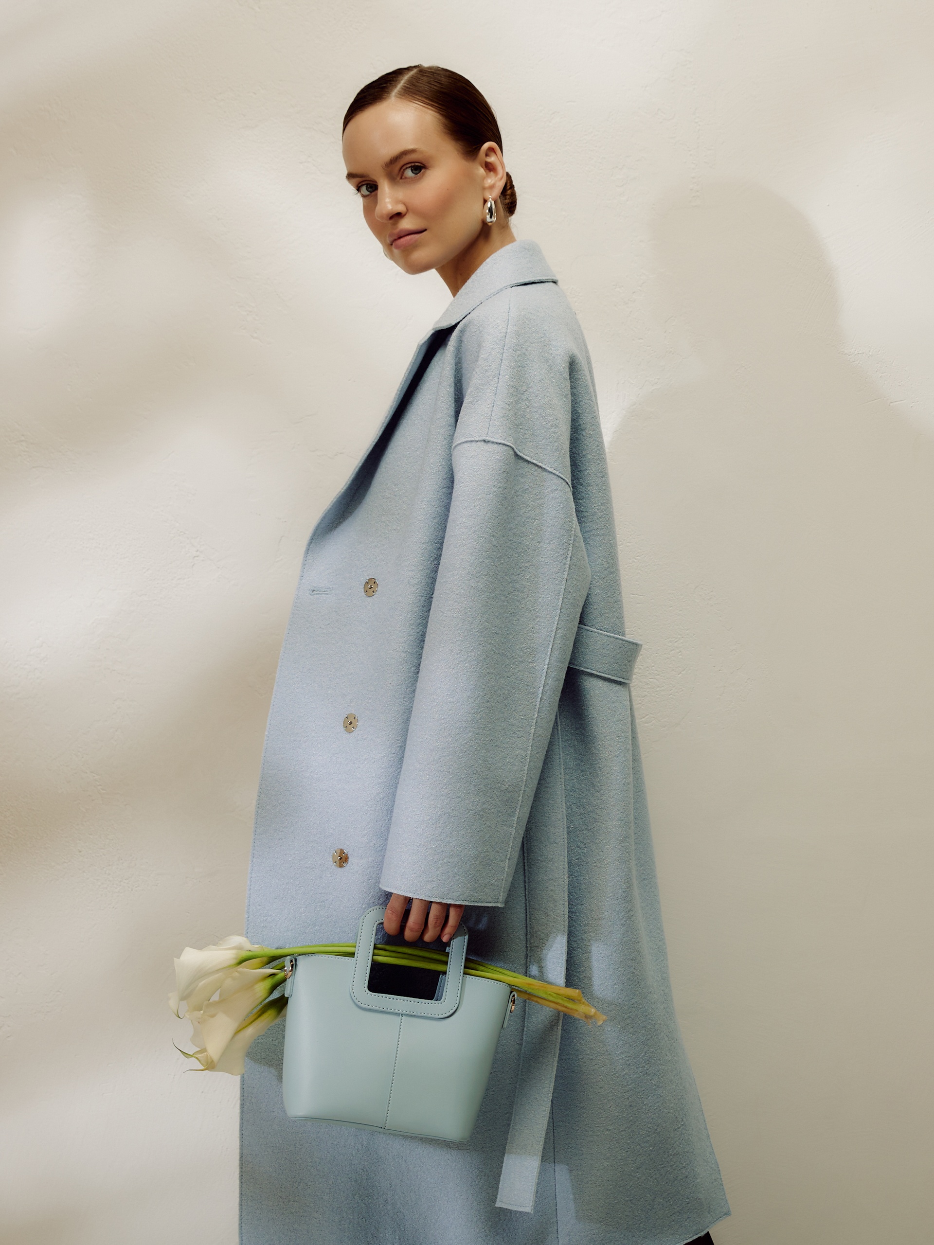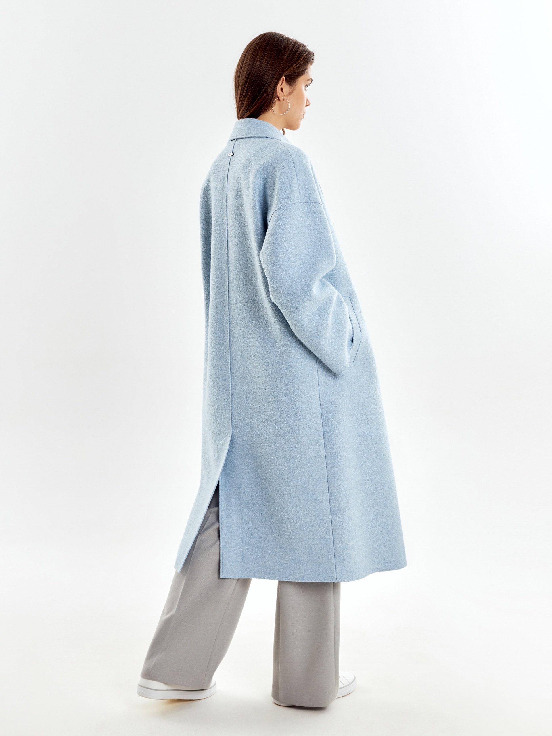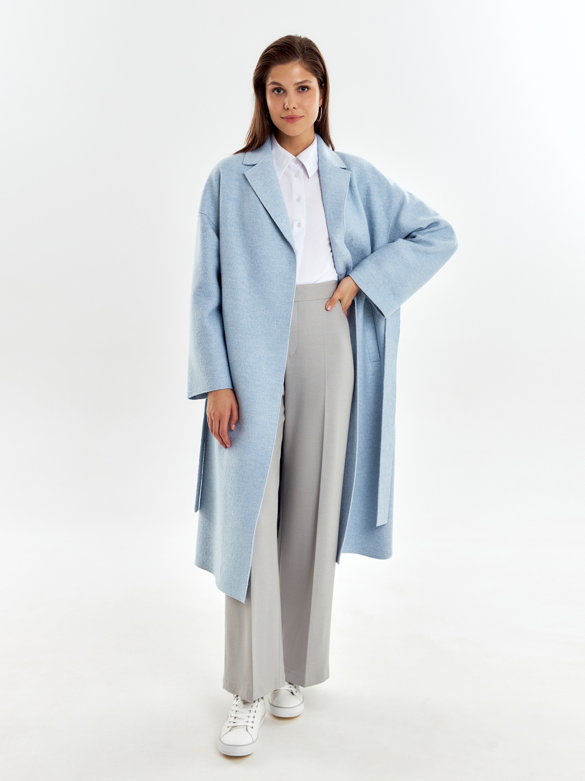 Двубортное пальто прямого силуэта из пальтовой ткани с эффектом "вареная шерсть" в нежном весеннем голубом оттенке. Пальто выполнено с открытыми срезами, что делает его еще более современным. По бокам располагаются глубокие карманы с узкими листочками. Застегивается изделие на ряд надежных пришивных кнопок. В качестве дополнительного декоративного элемента к пальто прилагается пояс, который с легкостью изменит образ и сделает его более женственным и утонченным. Уникальная лекальная база, которая разработана нашими конструкторами одежды, подчеркивает все достоинства фигуры и визуально вытягивает силуэт. Изделие на подкладке. Произведено в Санкт-Петербурге.