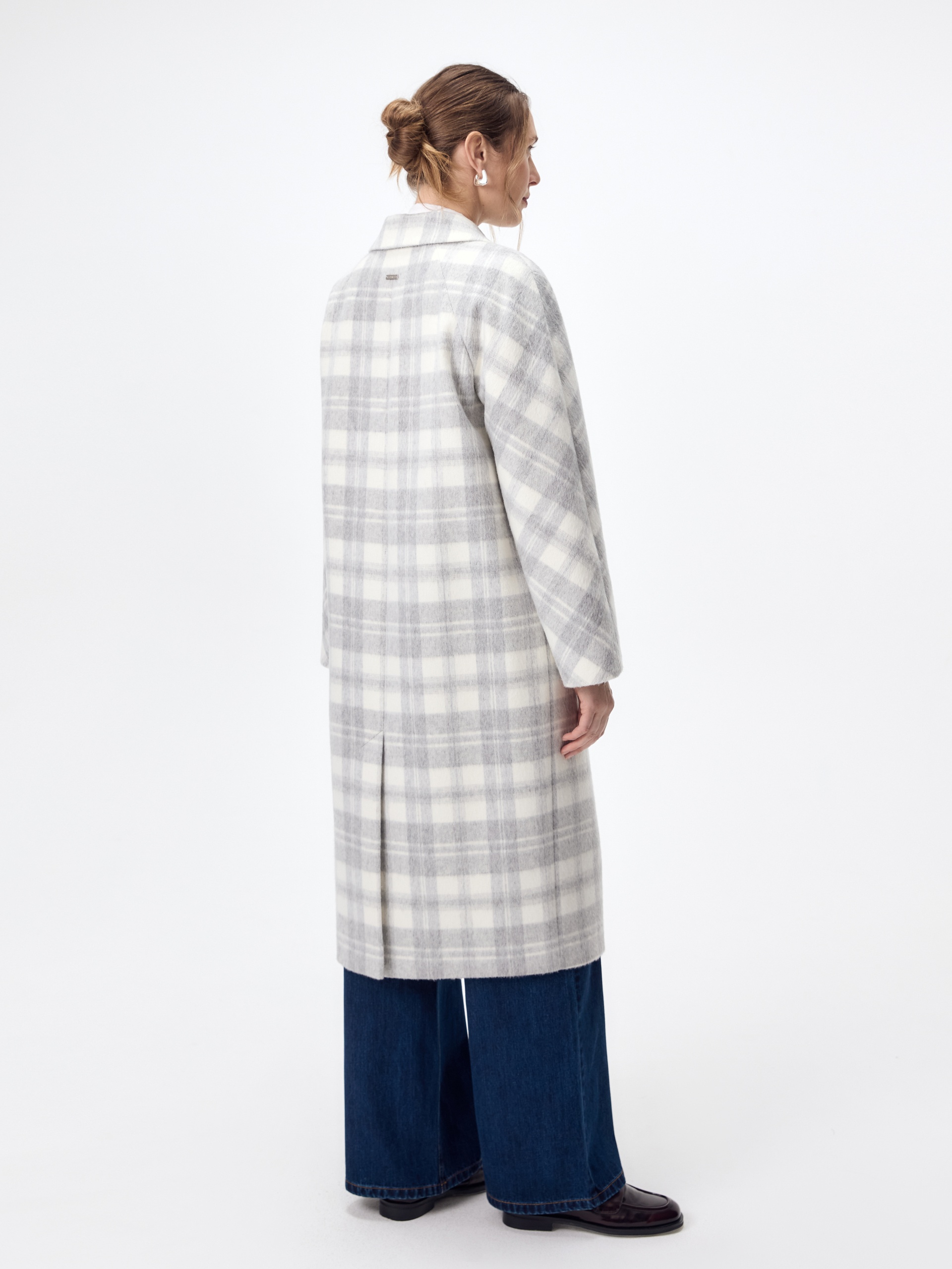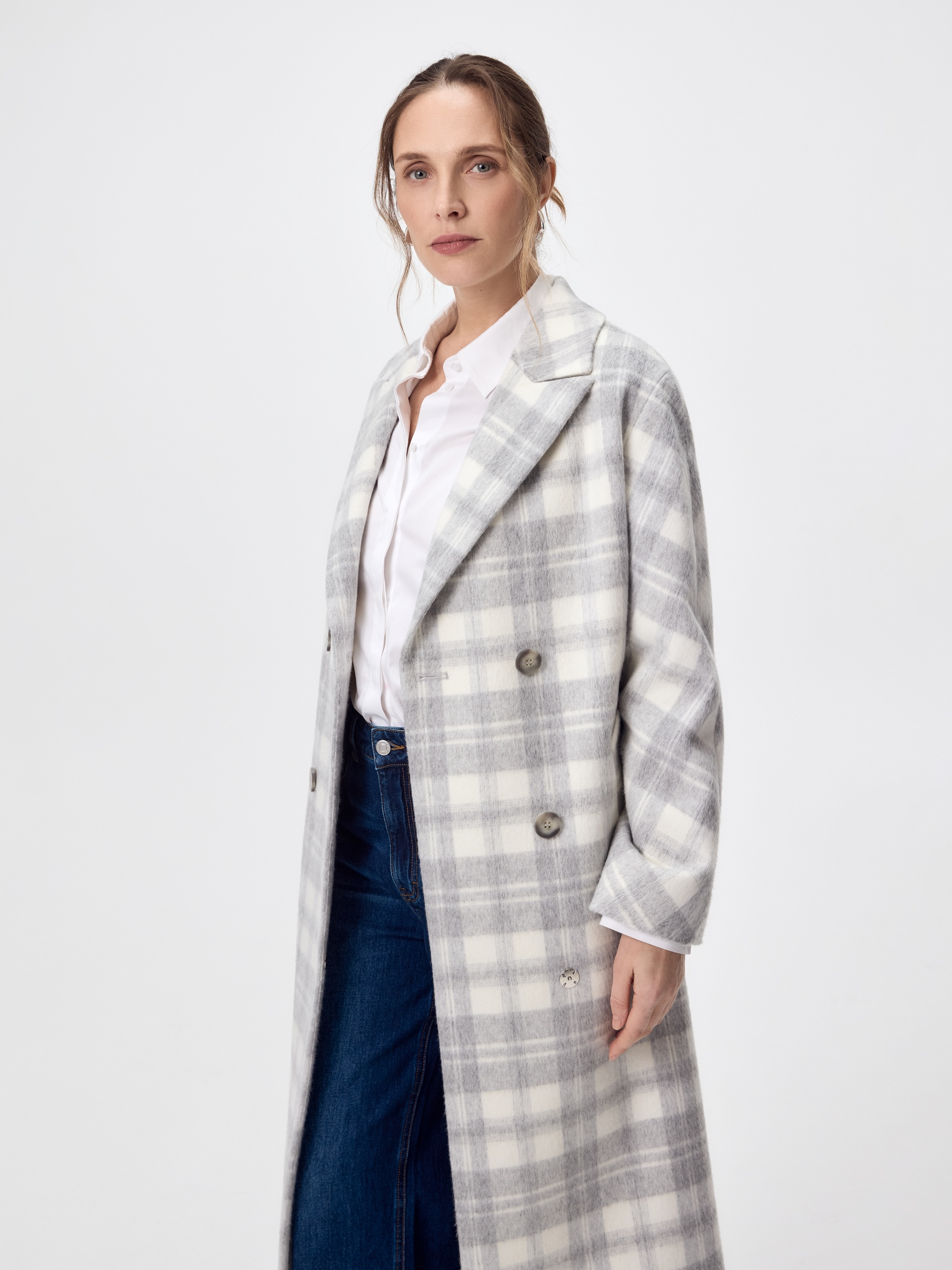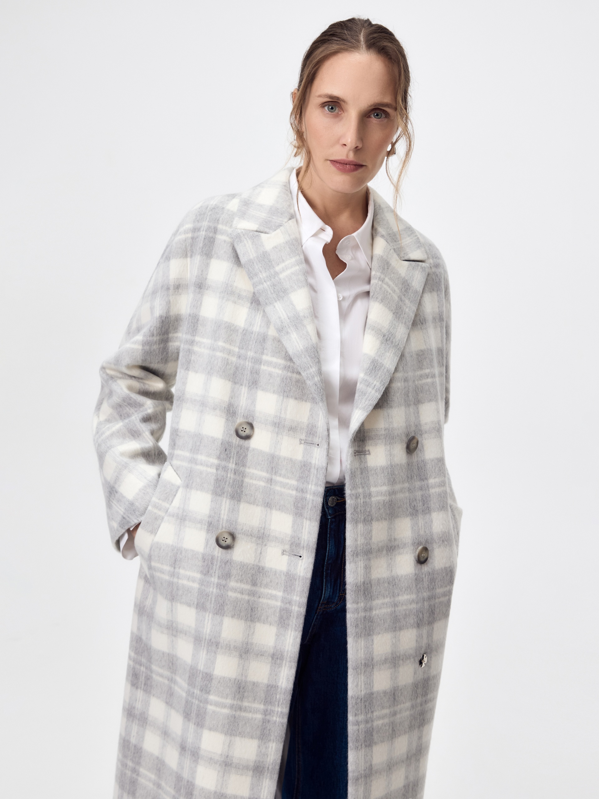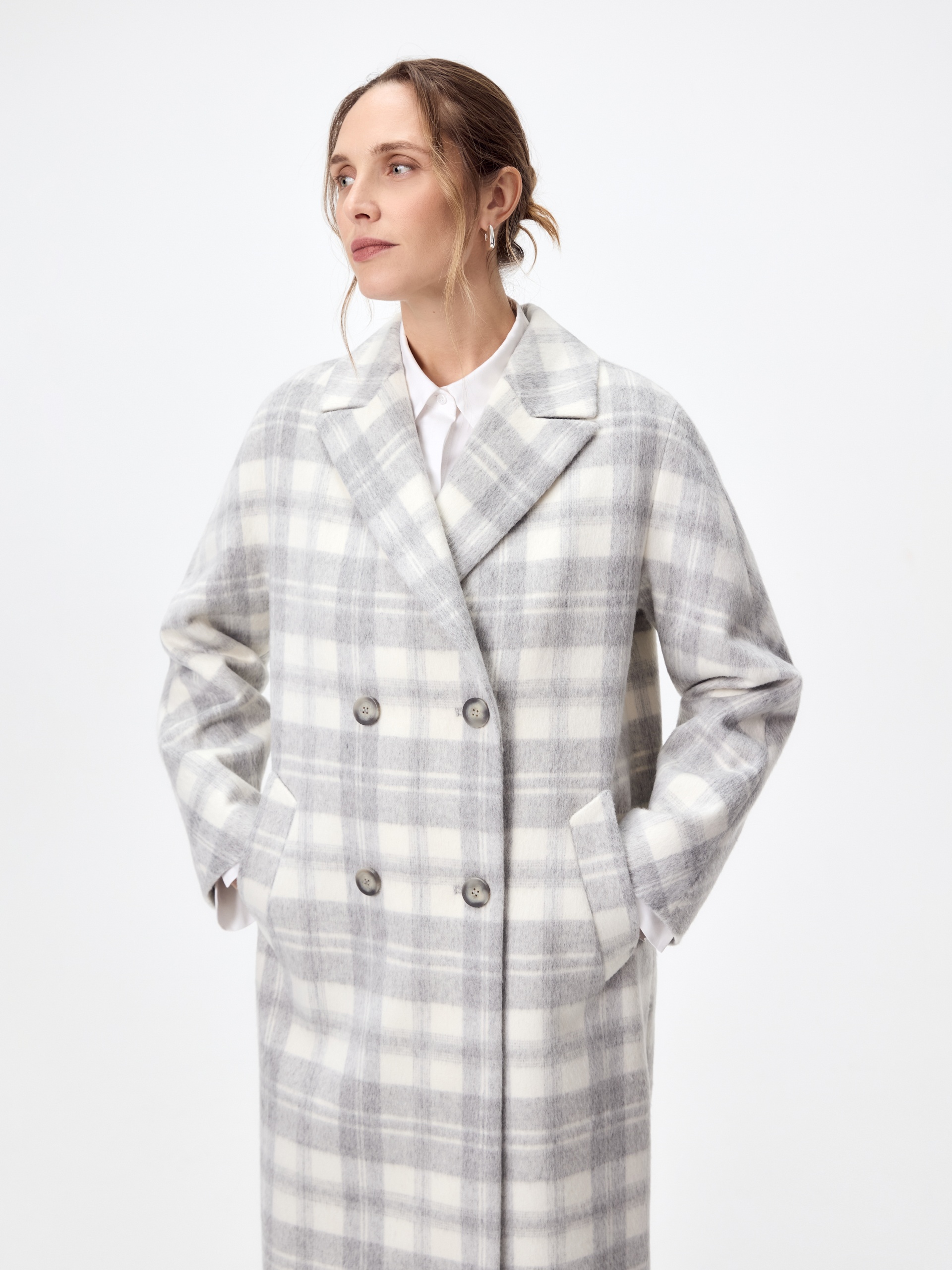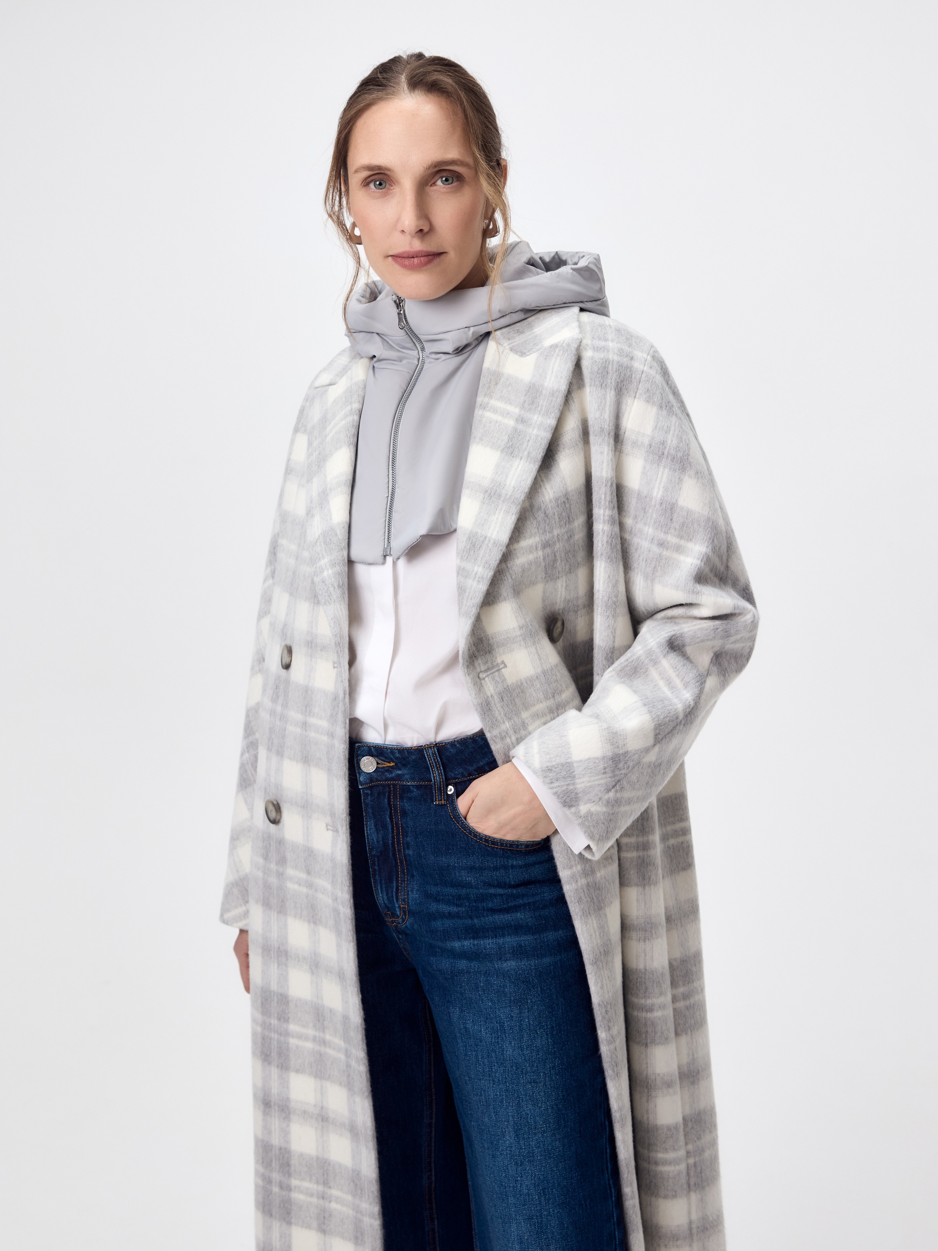 Двубортное пальто силуэта "удлиненный кокон" из пальтовой ворсовой ткани в модную широкую светло-серую клетку. Пальто имеет спущенный рубашечный рукав и классический английский воротник. По бокам располагаются два глубоких кармана с листочками. Застегивается изделие на два ряда крупных пуговиц под натуральный рог. В качестве дополнительного функционального элемента к пальто предлагается съемный капюшон из плащевой ткани в нежном серебристом оттенке. Капюшон снимается и с легкостью изменит образ из более спортивного в классический и наоборот, а также отлично защитит от дождя и холода. Для наилучшей защиты от непогоды пальто выполнено с использованием высокотехнологичной мембраны RaftPro. Произведено в Санкт-Петербурге.