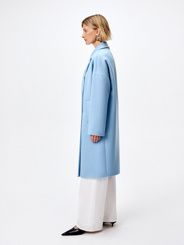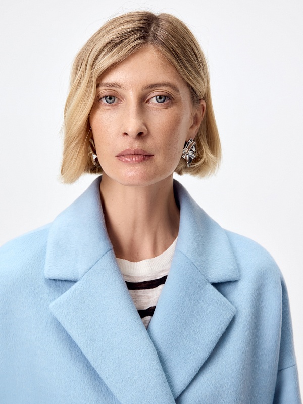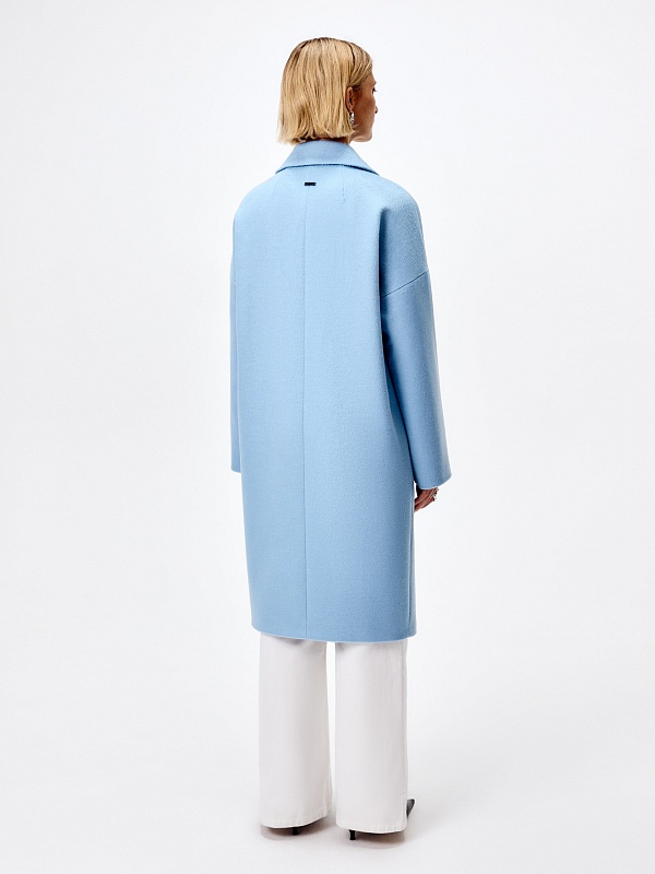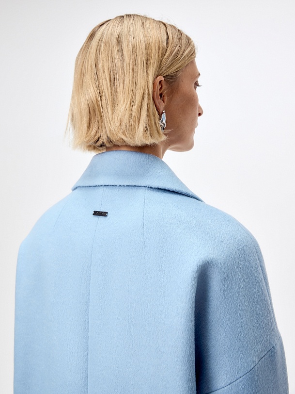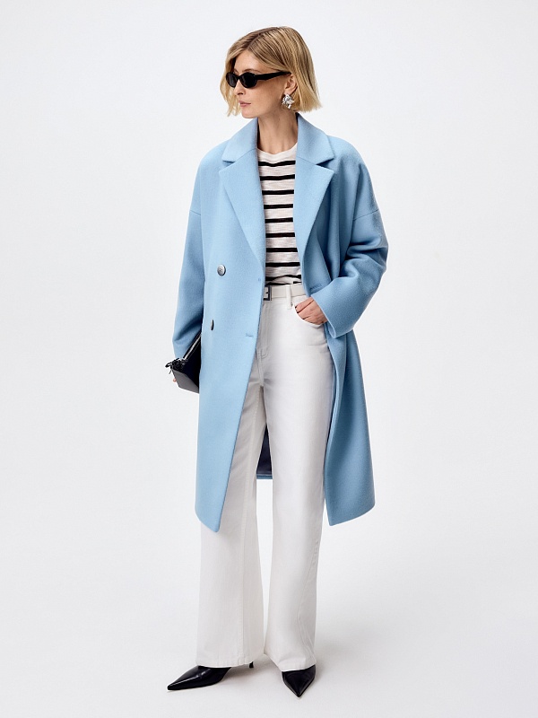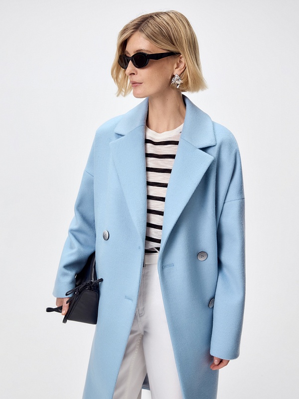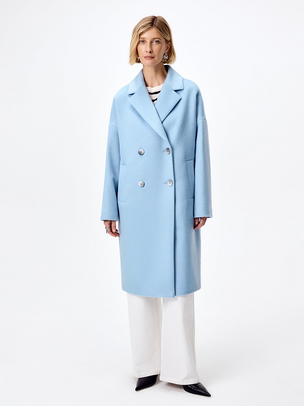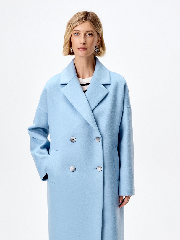 Двубортное пальто прямого силуэта из шерстяной ворсовой ткани в нежном весеннем голубом цвете. Английский воротник, комфортный спущенный рукав и оптимальная длина, закрывающая колено, будут не только очень удобны при использовании, но и долго не выйдут из моды. А яркий цвет добавит весеннего настроения и поможет создать неповторимый образ. Застегивается пальто на ряд стильных крупных пуговиц под натуральный рог. Пальто выполнено с использованием мембраны RaftPro, которая надежно защищает от холода и ветра. Произведено в Санкт-Петербурге.