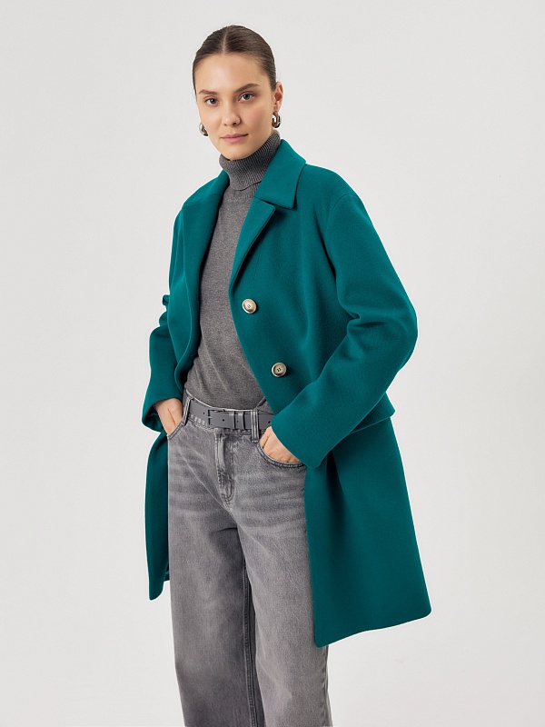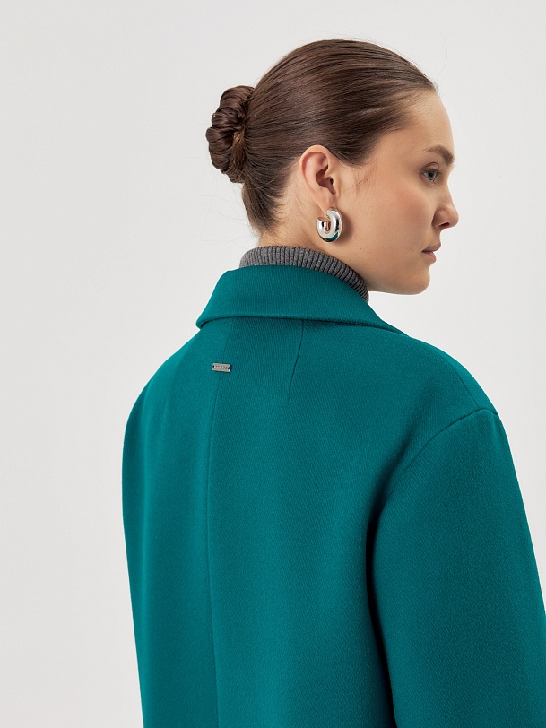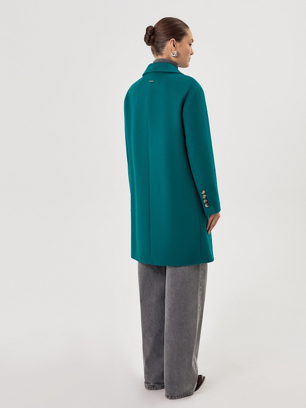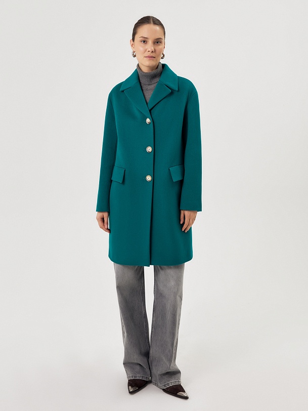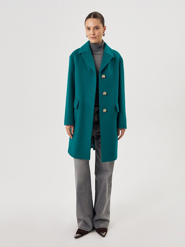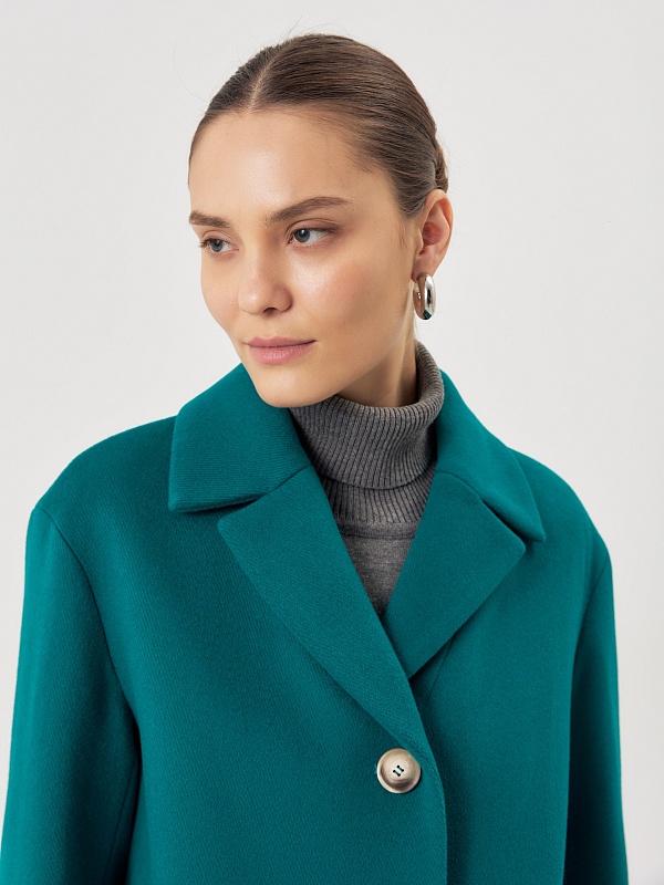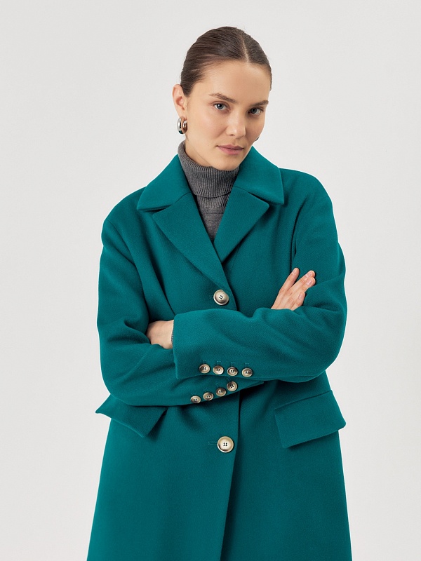 Однобортное пальто длиной до колена из премиальной шерстяной ворсовой ткани в ярком весеннем бирюзовом цвете. Пальто расширенного силуэта "трапеция" со свободным рубашечным рукавом и аккуратным английский воротником. По низу рукава застежка на ряд пуговиц. Спереди располагаются глубокие прорезные карманы с клапанами. Застегивается изделие на ряд крупных стильных глянцевых пуговиц в цвет ткани. А для дополнительной защиты от непогоды изделие выполнено с использованием высокотехнологичной мембраны RaftPro. Произведено в Санкт-Петербурге.