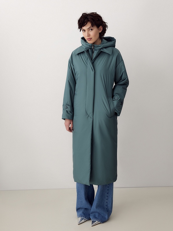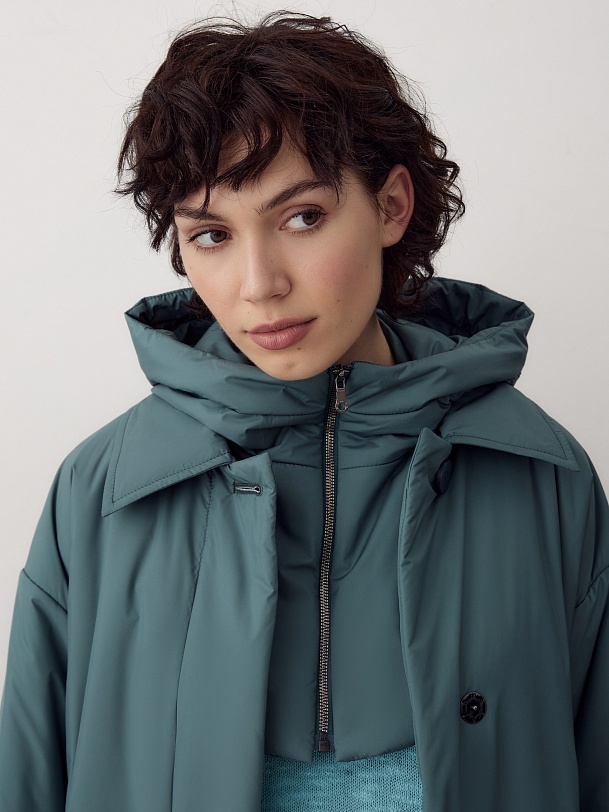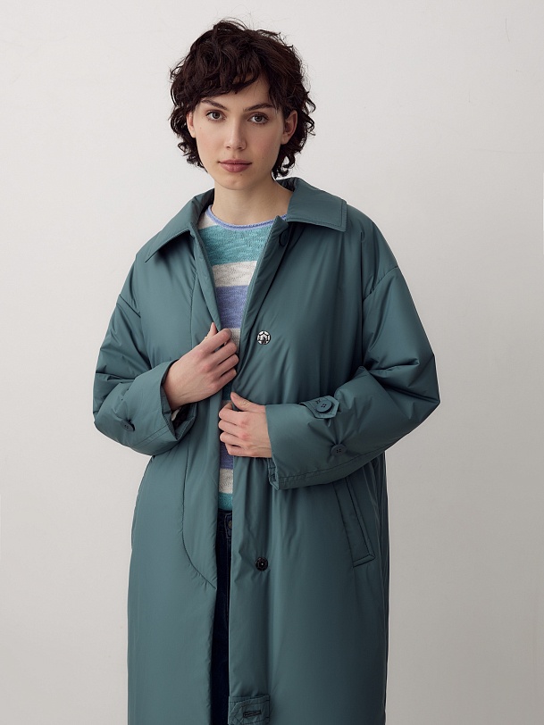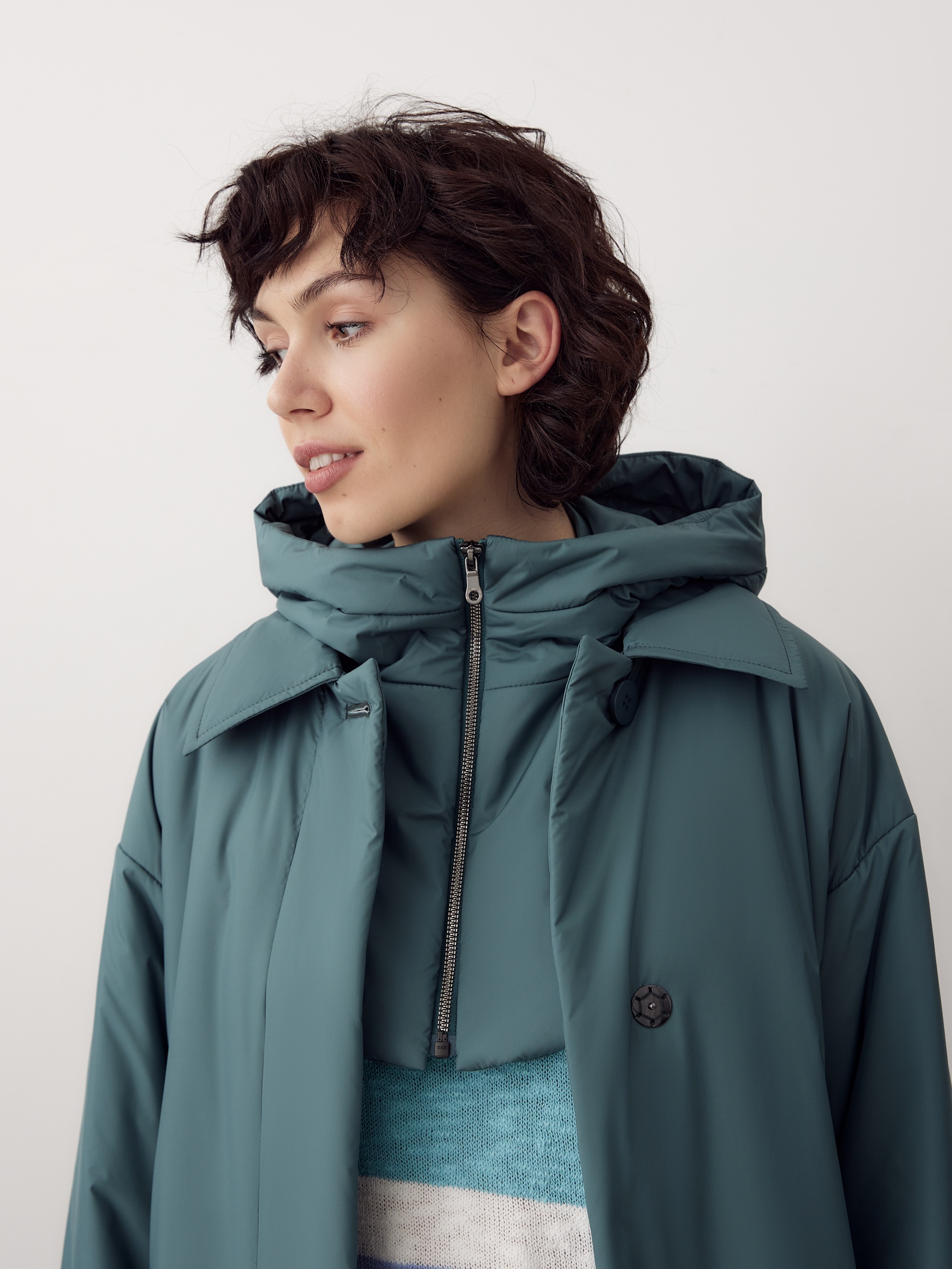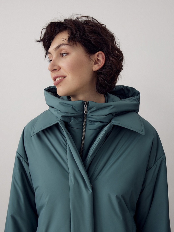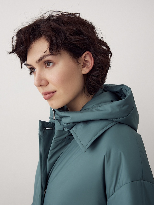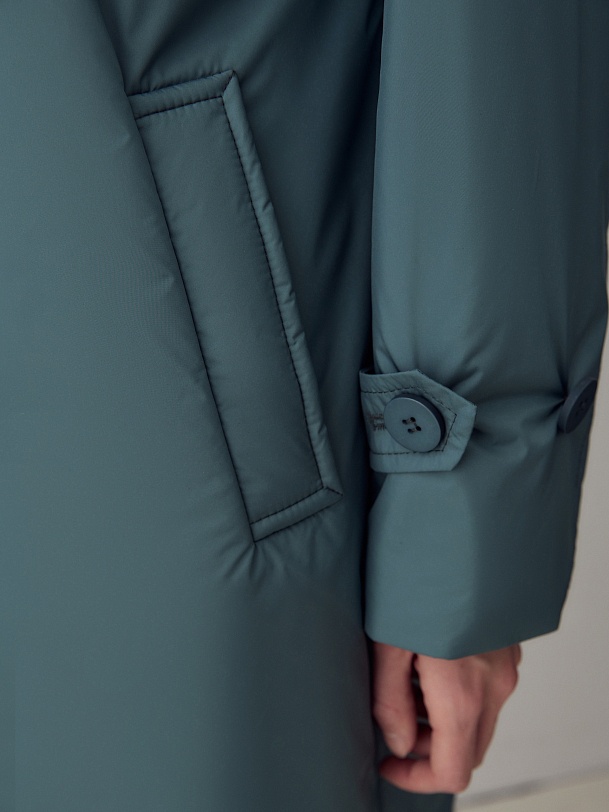 Утепленное пальто прямого силуэта из плащевой ткани в модном темно-изумрудном цвете. Пальто имеет длину ниже колена, аккуратный отложной воротник, застежку на пришивные кнопки и пуговицы. По низу рукава декоративные паты с застежкой на пуговицы. На спинке отлетная кокетка также фиксируется на пуговицу. В среднем шве спинки находится высокая шлица. В комплекте к пальто предлагается пояс из основной ткани с пряжкой в цвет пуговиц, а также съемный капюшон с манишкой, который с легкостью отстегивается и имет возможность как легкой смены образа, так и комбинированию его с другими нашим пальто. Выполнено из качественной плащевой ткани с мембранным покрытием, которая надежно защитит от ветра и дождя, и современного легкого утеплителя. Произведено в Санкт-Петербурге.