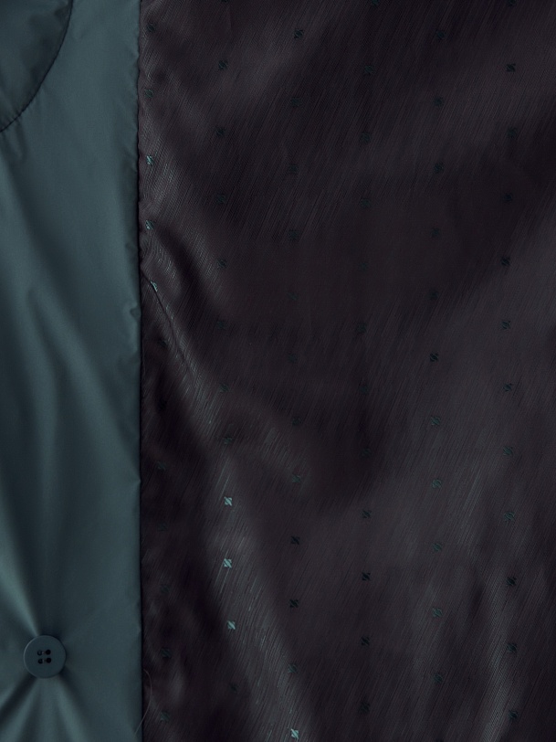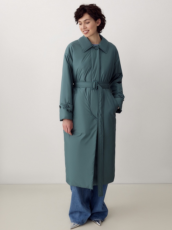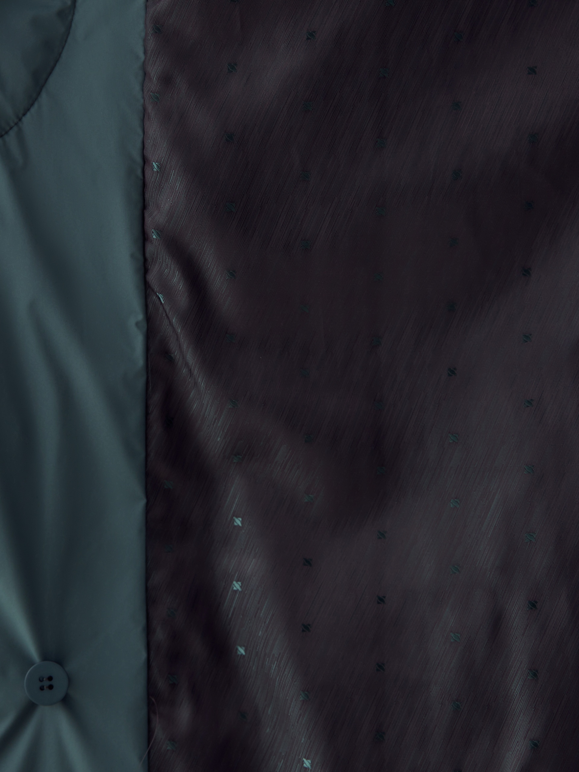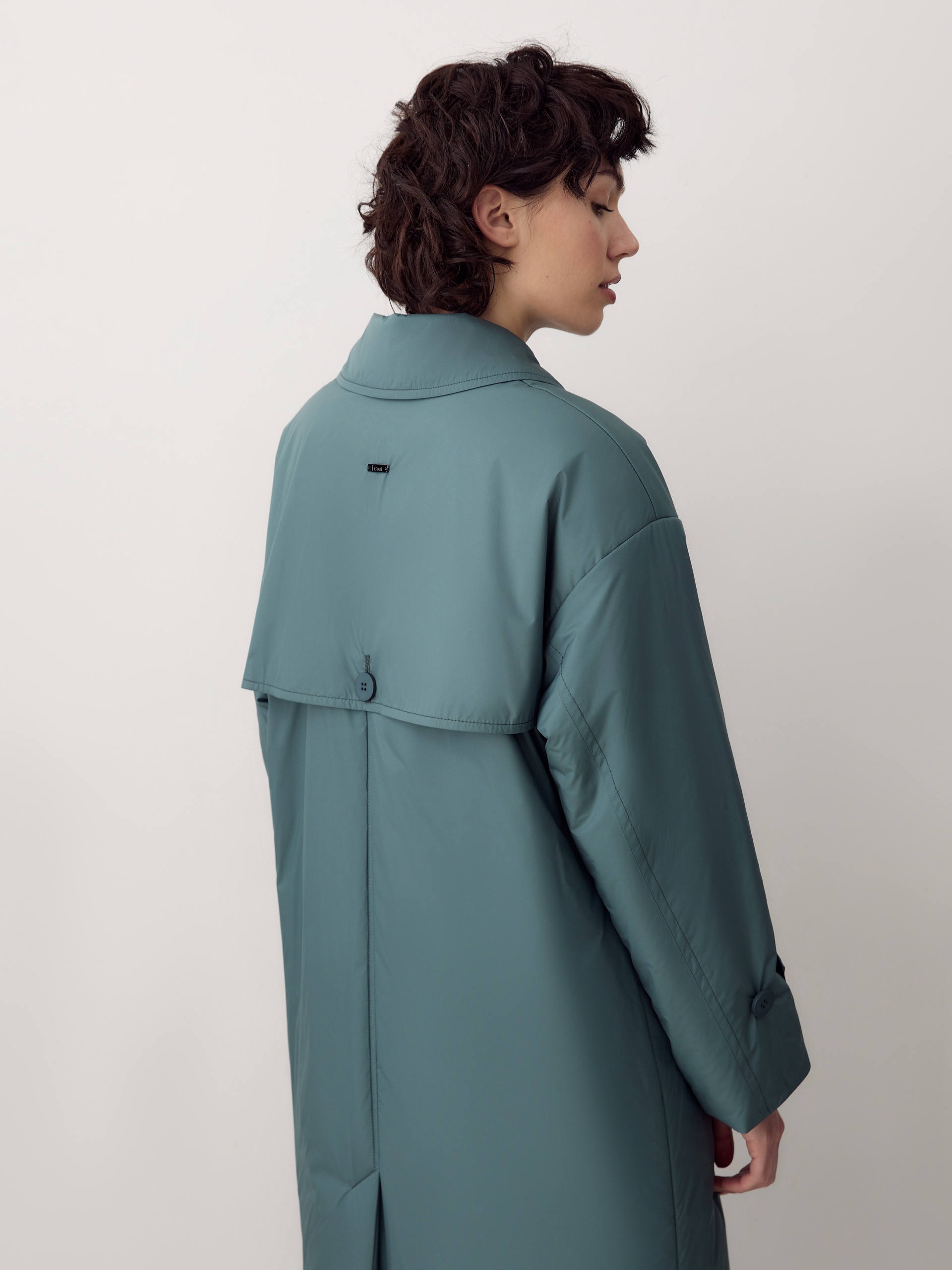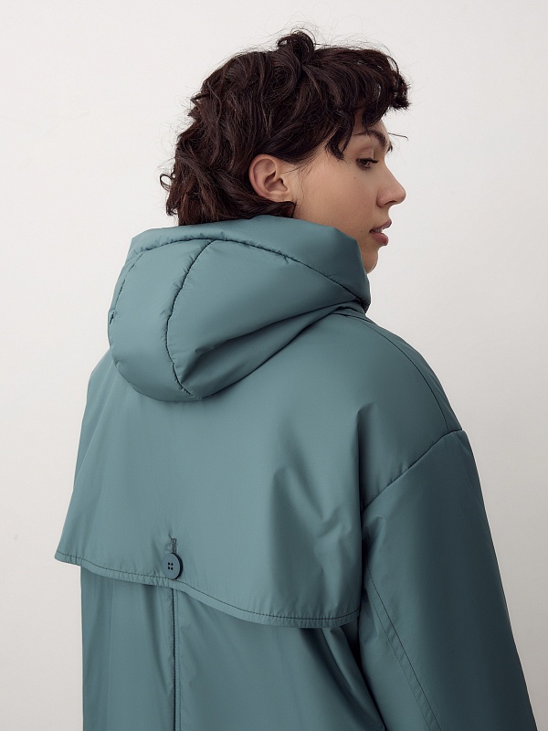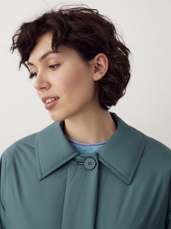 Утепленное пальто прямого силуэта из плащевой ткани в модном темно-изумрудном цвете. Пальто имеет длину ниже колена, аккуратный отложной воротник, застежку на пришивные кнопки и пуговицы. По низу рукава декоративные паты с застежкой на пуговицы. На спинке отлетная кокетка также фиксируется на пуговицу. В среднем шве спинки находится высокая шлица. В комплекте к пальто предлагается пояс из основной ткани с пряжкой в цвет пуговиц, а также съемный капюшон с манишкой, который с легкостью отстегивается и имет возможность как легкой смены образа, так и комбинированию его с другими нашим пальто. Выполнено из качественной плащевой ткани с мембранным покрытием, которая надежно защитит от ветра и дождя, и современного легкого утеплителя. Произведено в Санкт-Петербурге.